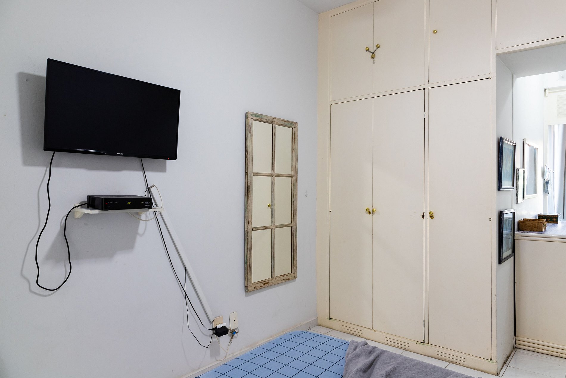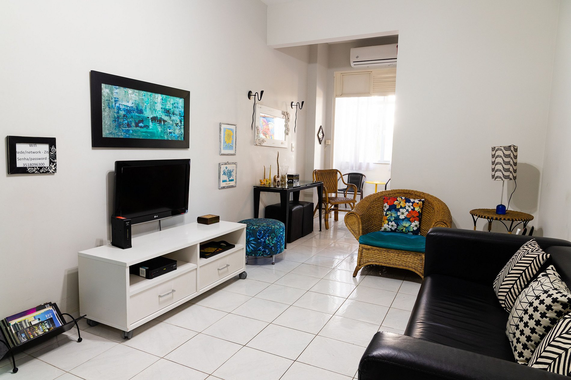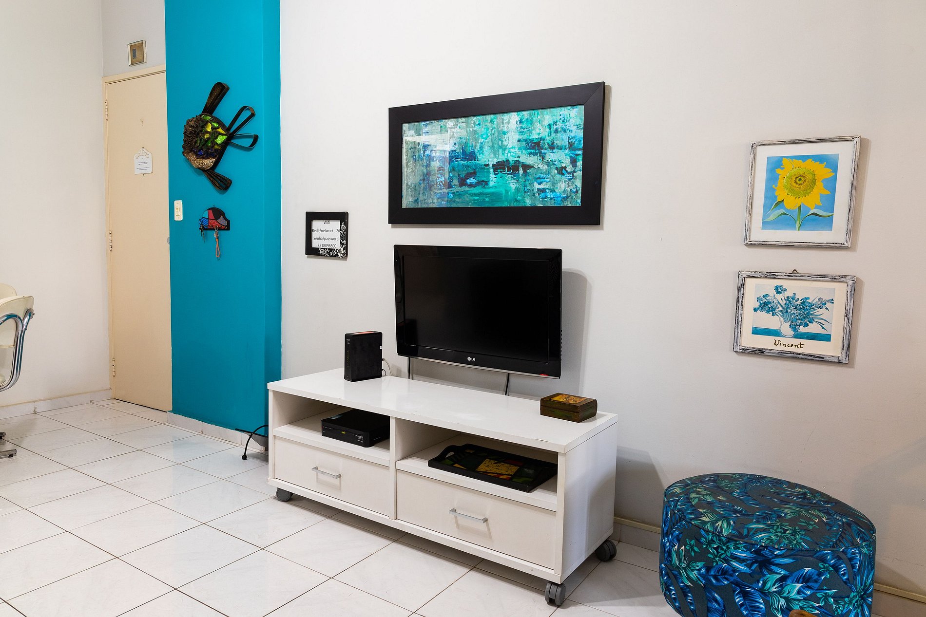 A sala é bem espaçosa e também possui ar-condicionado, tv a cabo e ventilador de teto. Assim como os quartos, tem sua janela voltada para bela praça Antero de Quental.