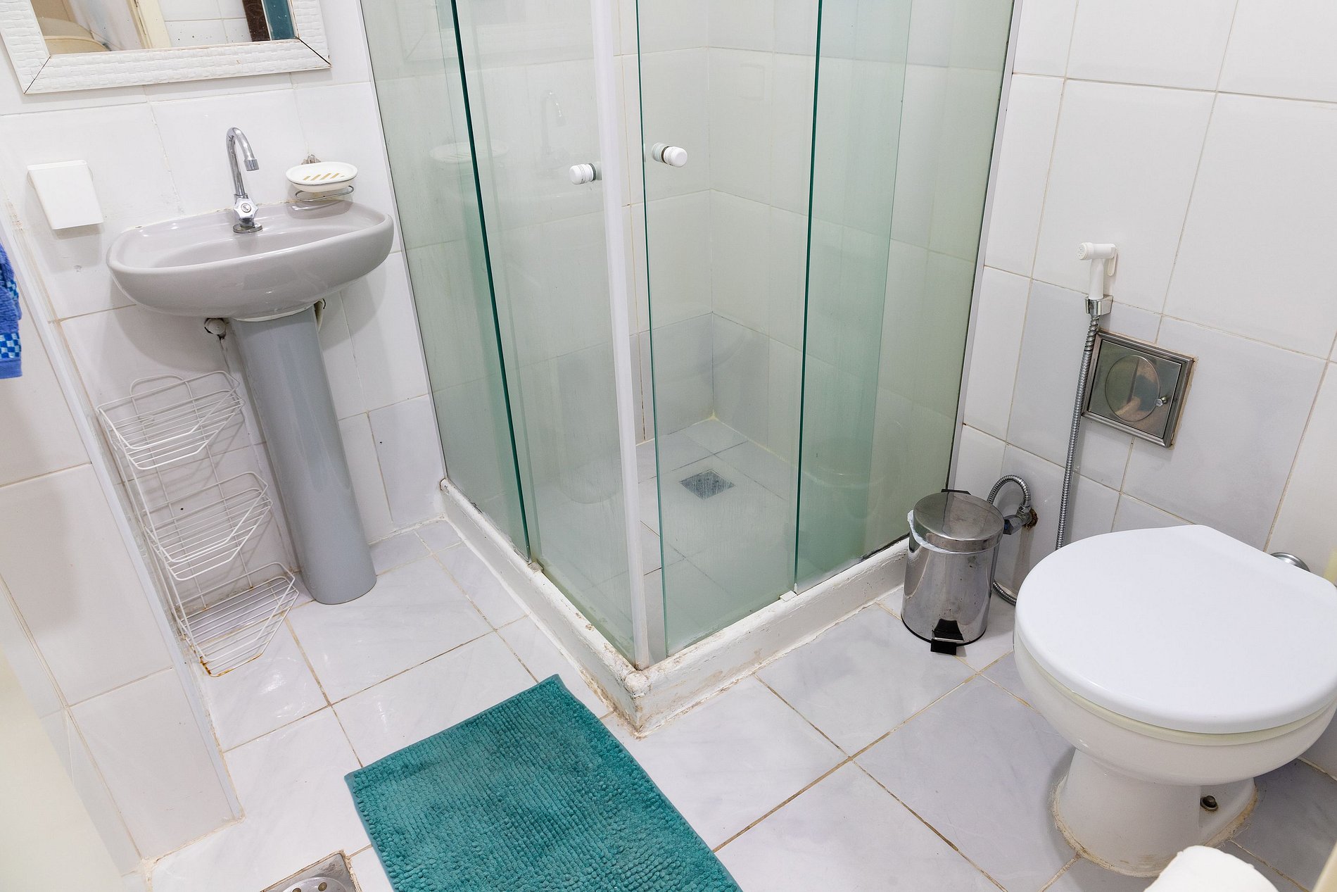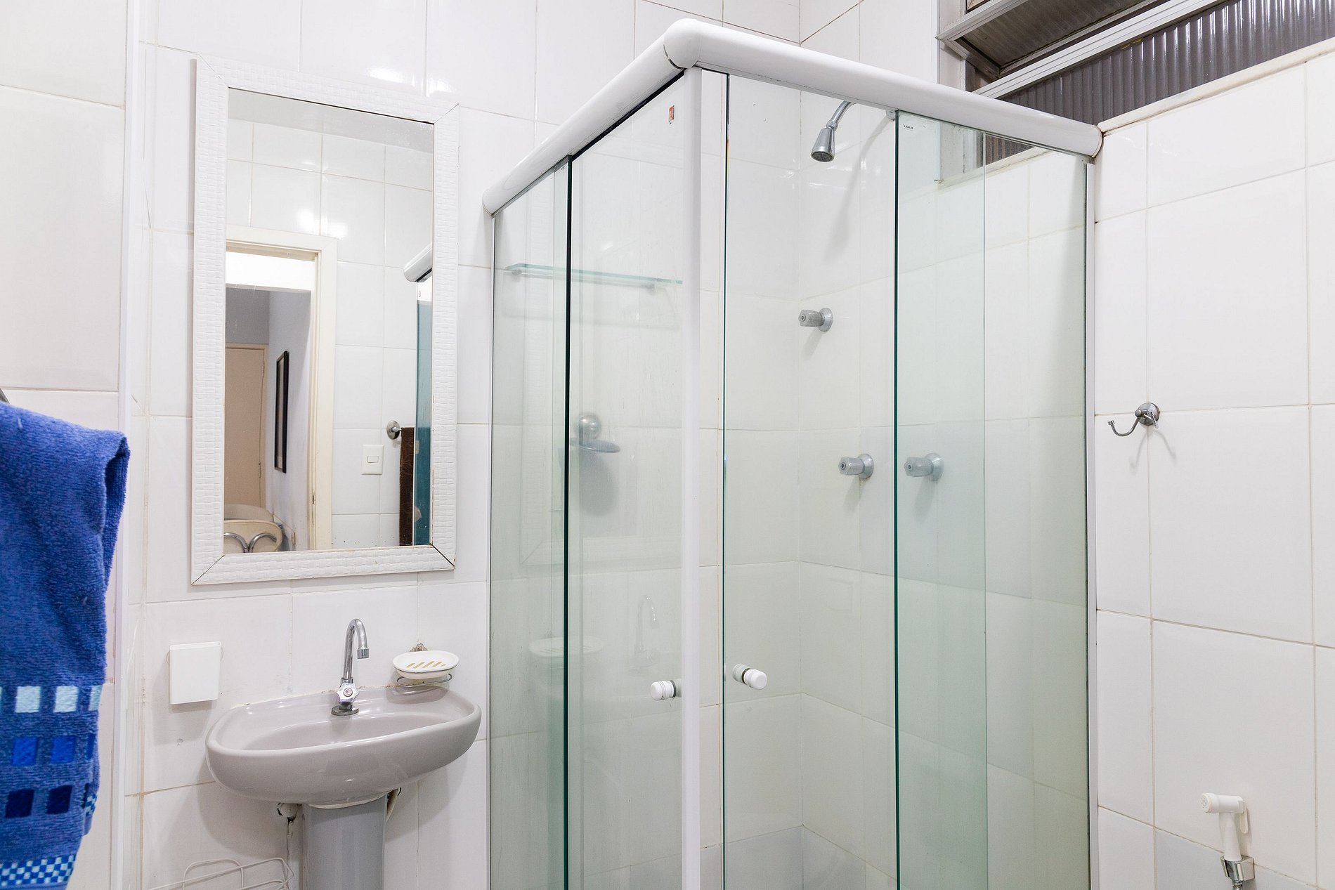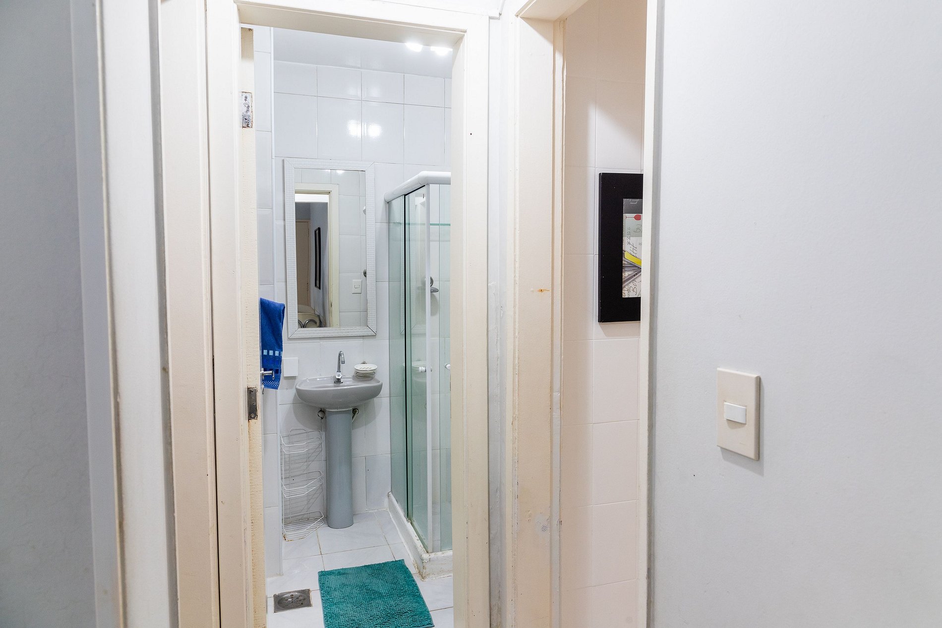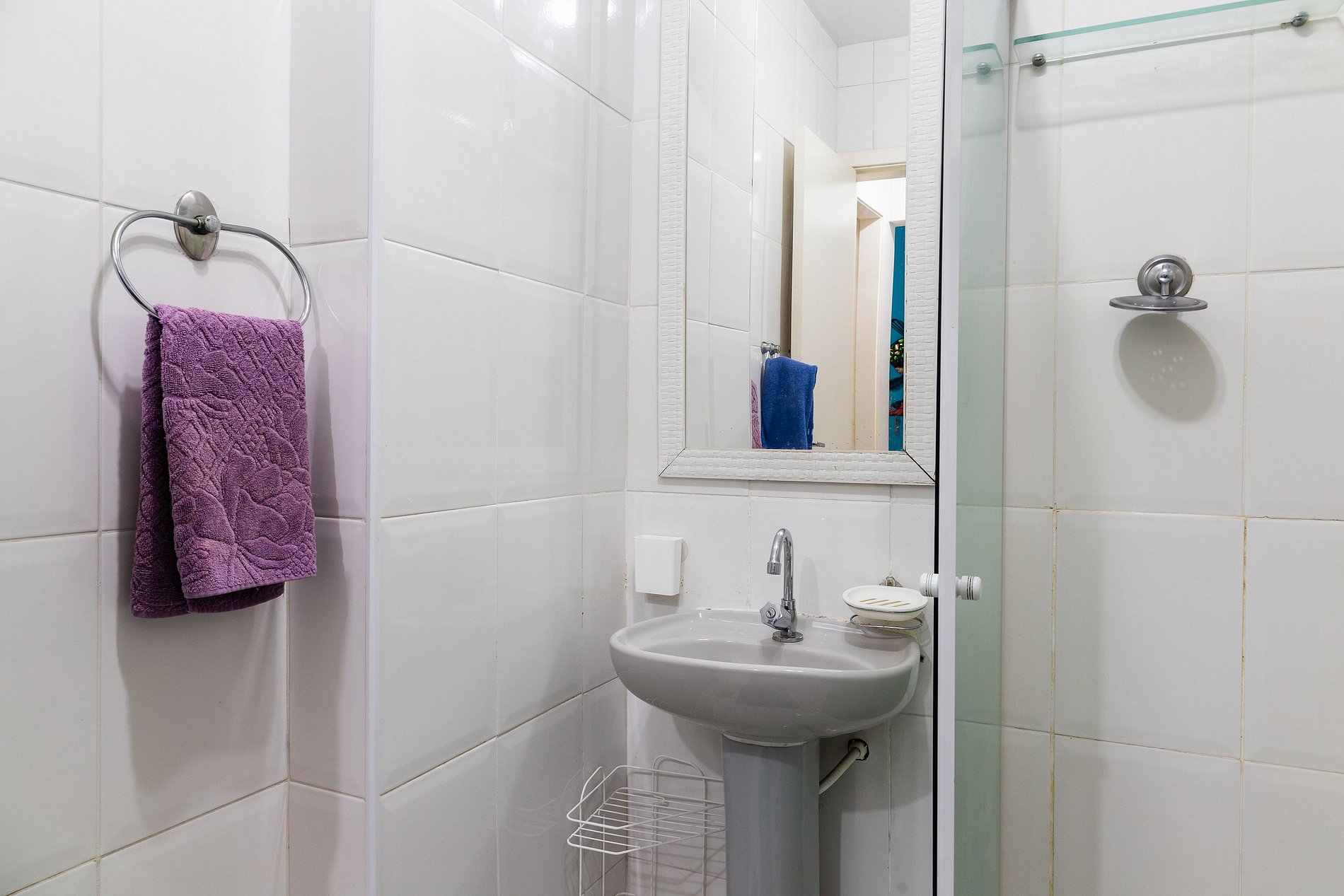 Temos um banheiro social e um lavabo para serem compartilhados entre todos os hóspedes. O banheiro social tem acesso pela sala. Já o lavabo fica dentro do quarto de serviço que foi adaptado com uma beliche.