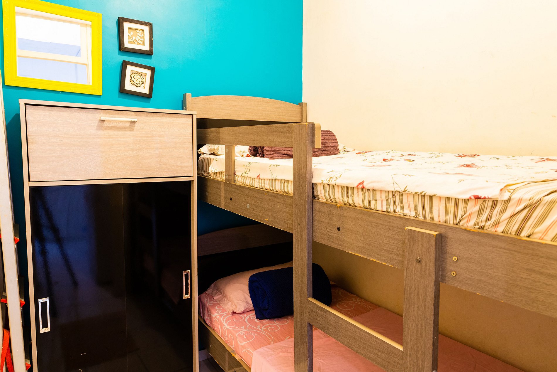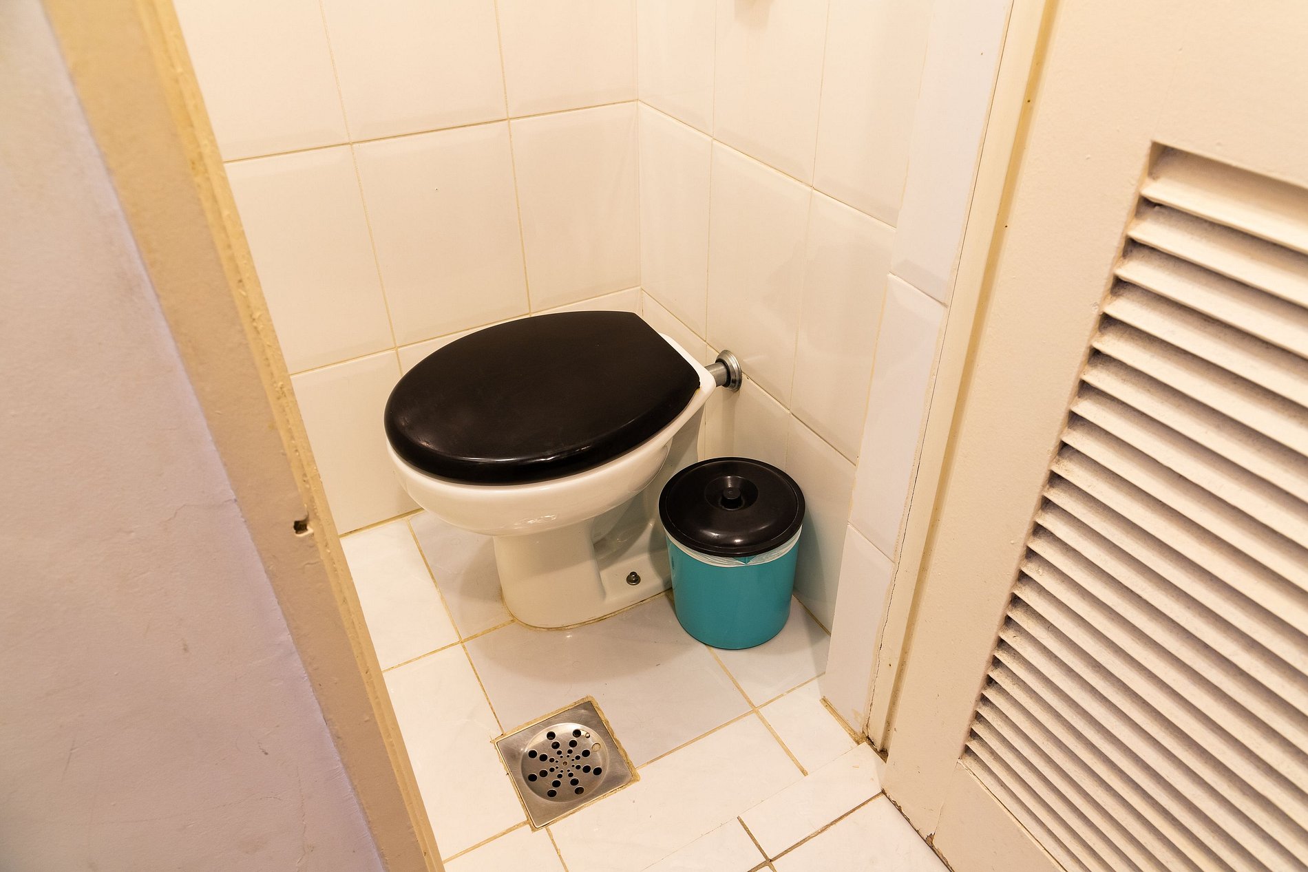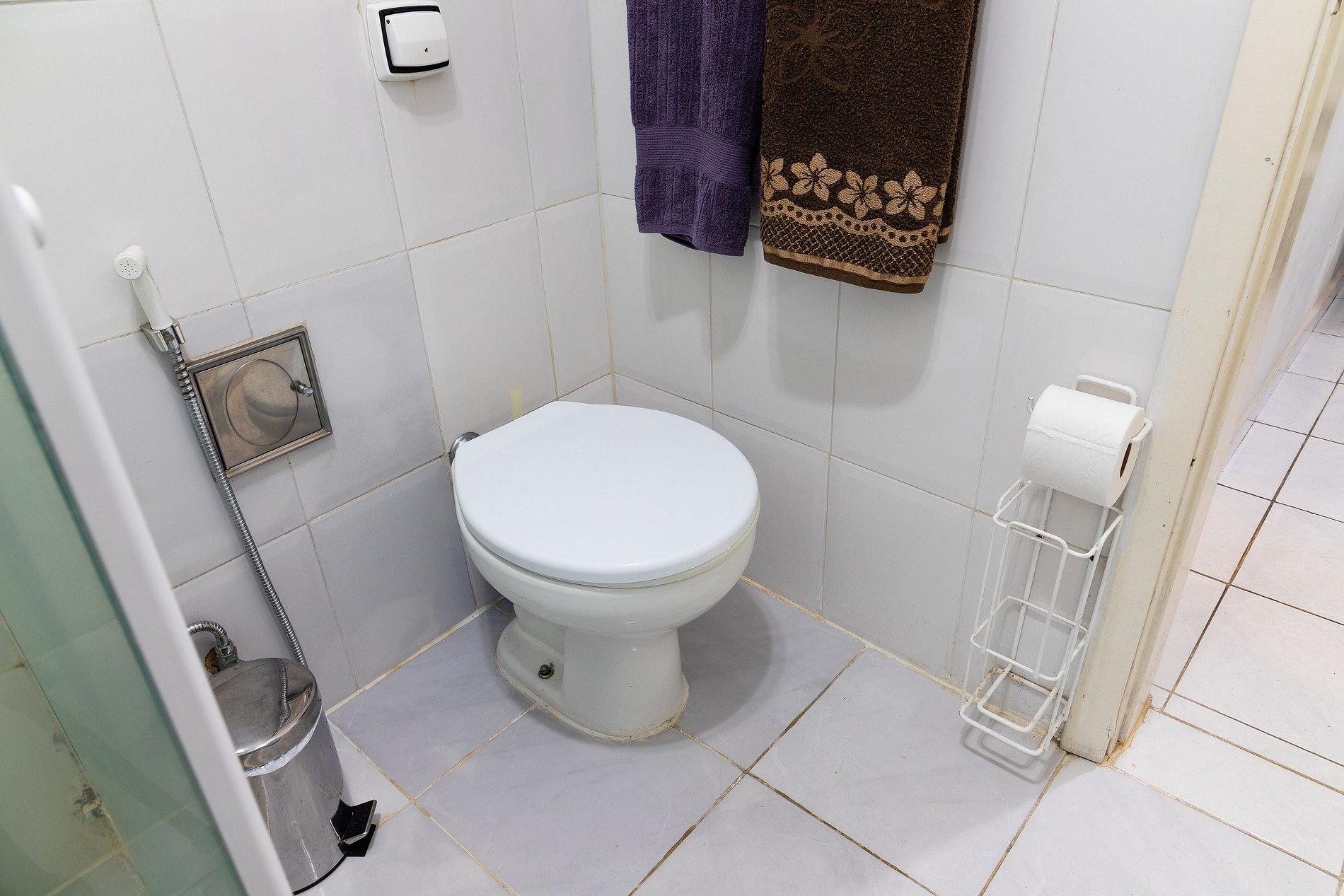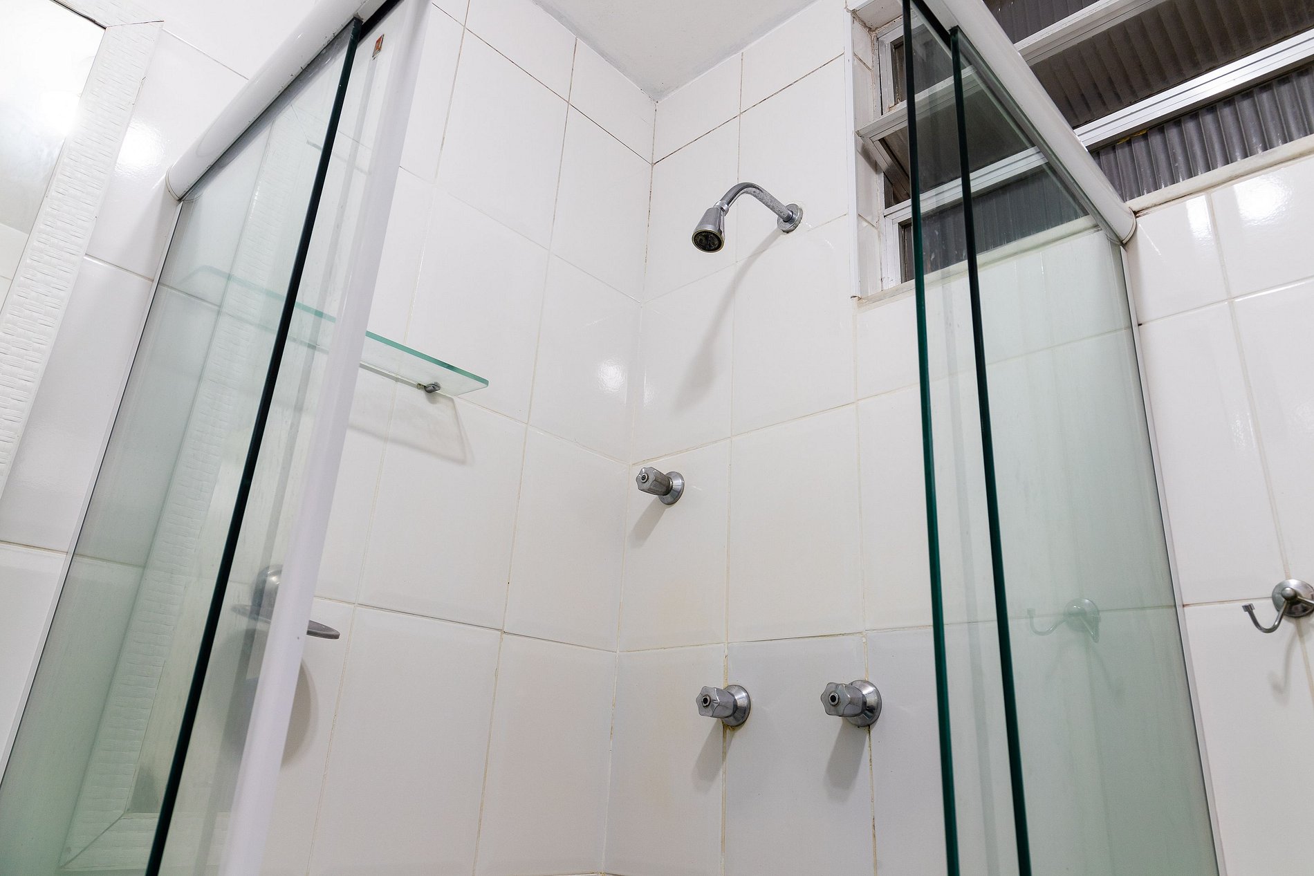 Temos um banheiro social e um lavabo para serem compartilhados entre todos os hóspedes. O banheiro social tem acesso pela sala. Já o lavabo fica dentro do quarto de serviço que foi adaptado com uma beliche.