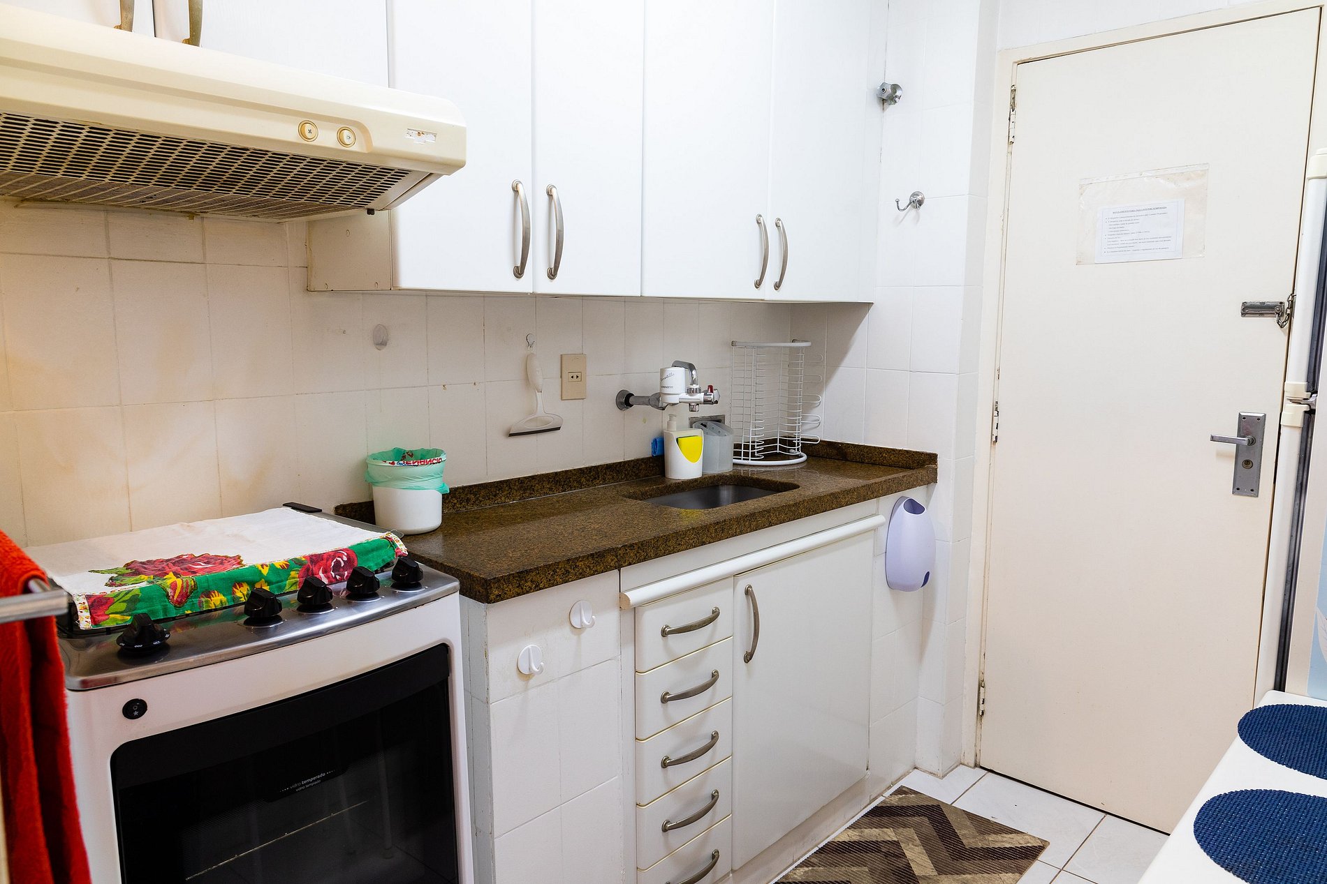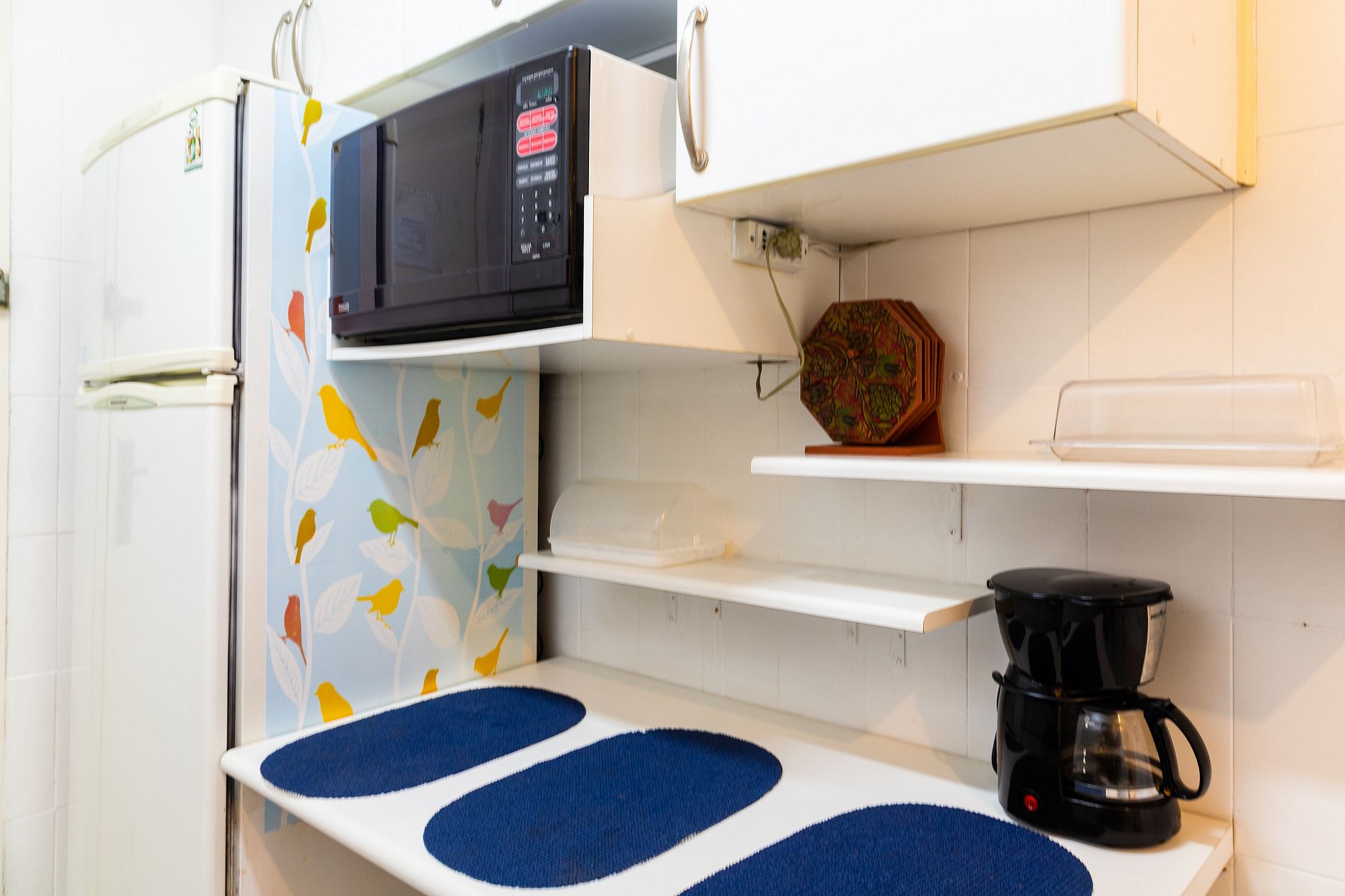 Na cozinha, temos uma geladeira com freezer, fogão, micro-ondas, cafeteira e todos os demais utensílios necessários para cozinhar no apartamento. Lembrando sempre para manterem a pia da mesma maneira que encontrarão: totalmente limpa!