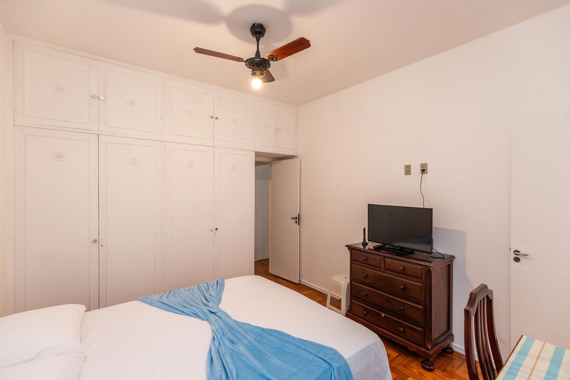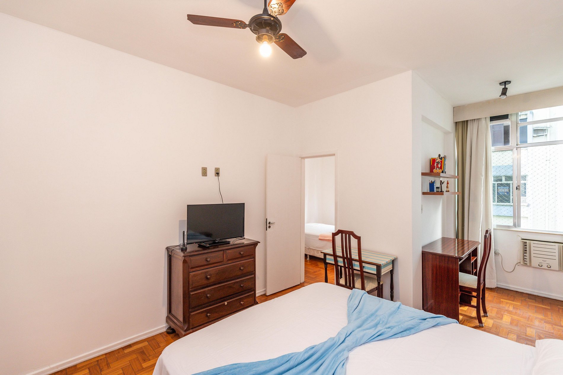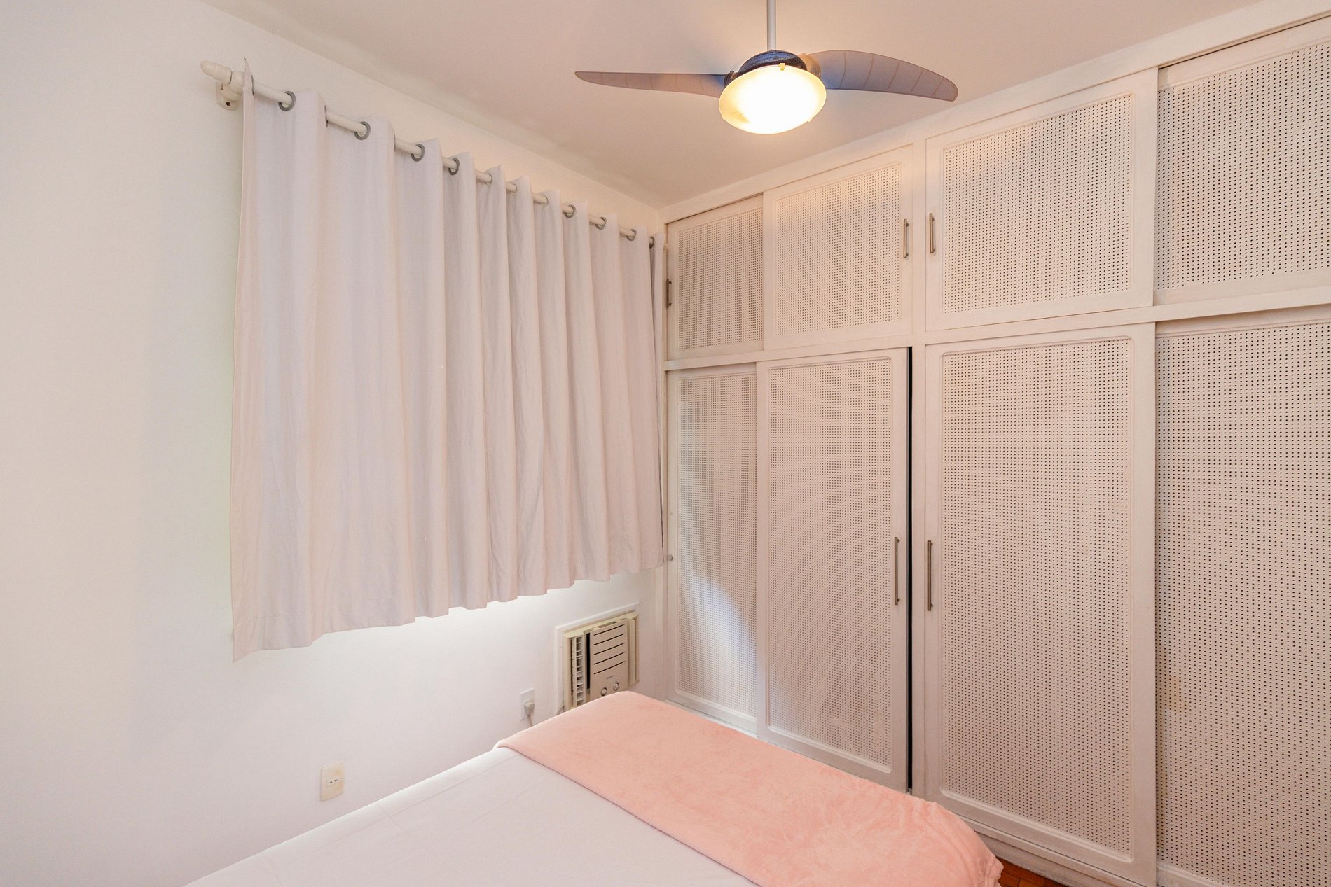 Os dois quartos possuem ar-condicionado, ventilador de teto e armário disponíveis para uso dos hóspedes.