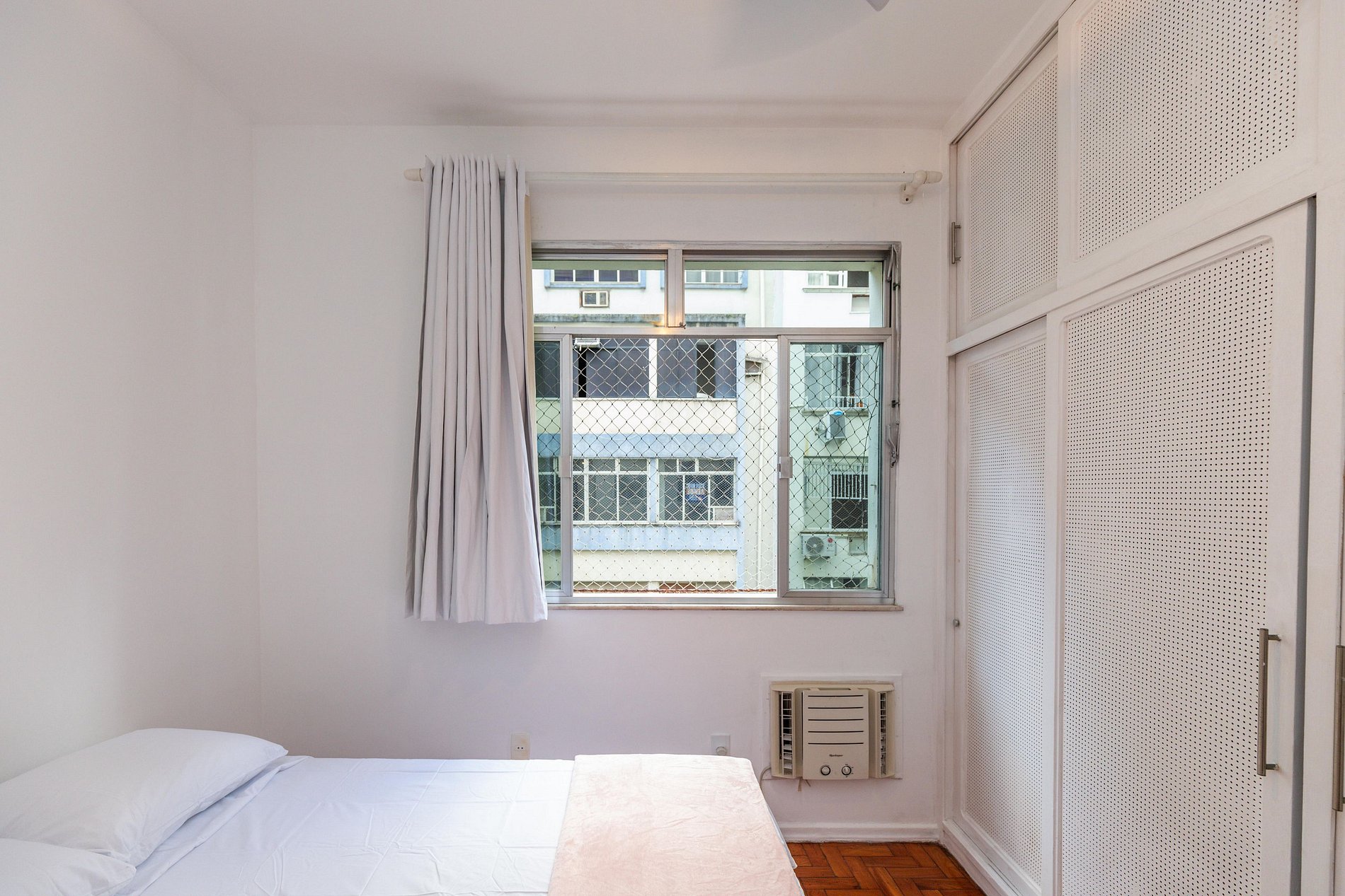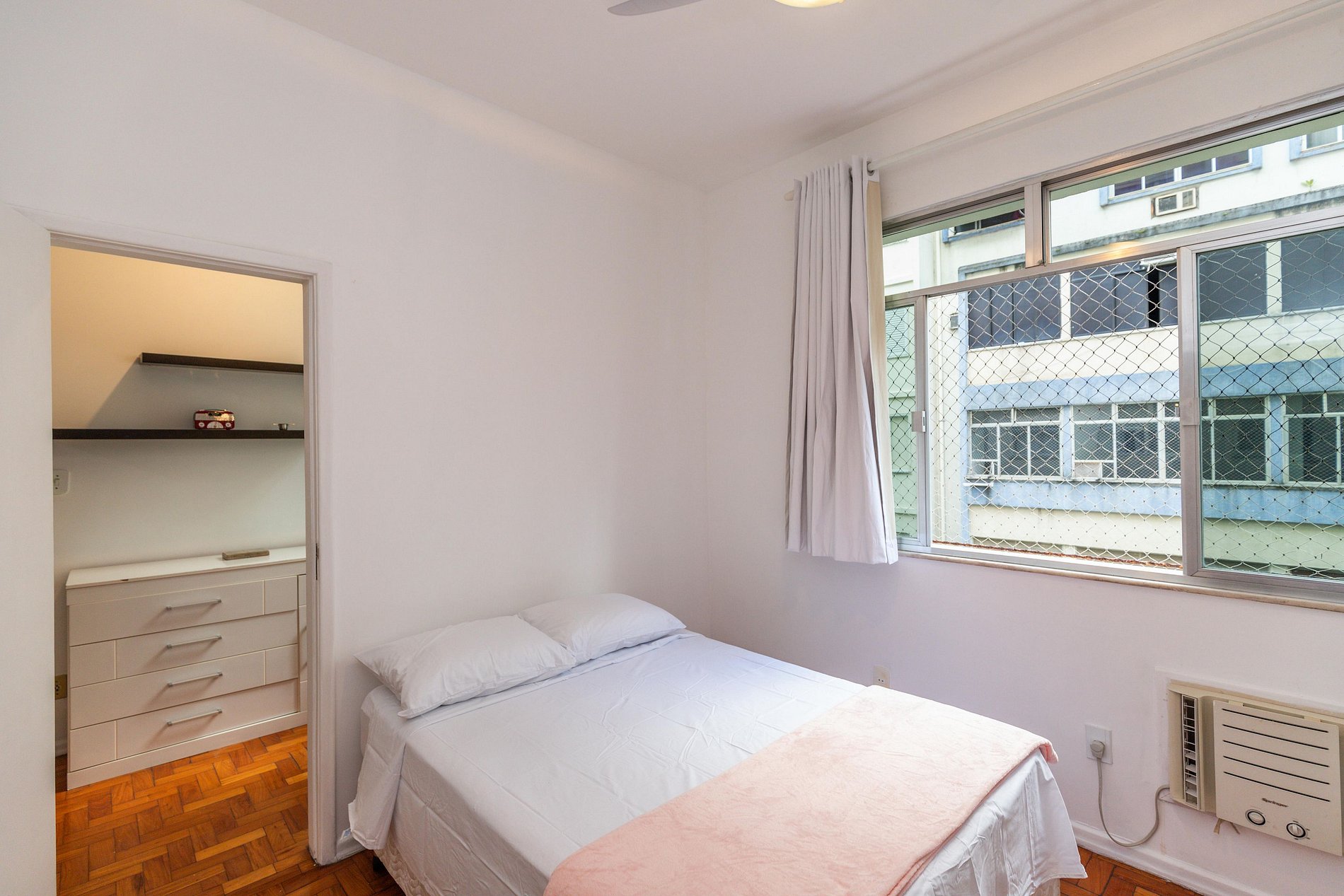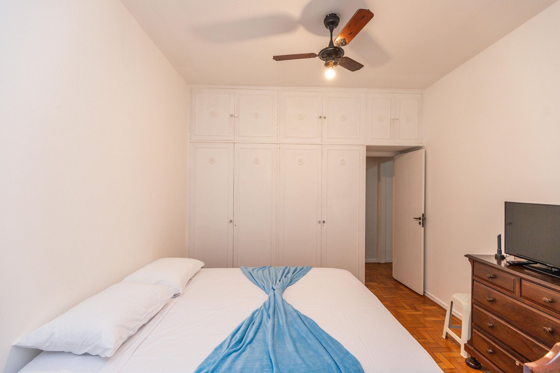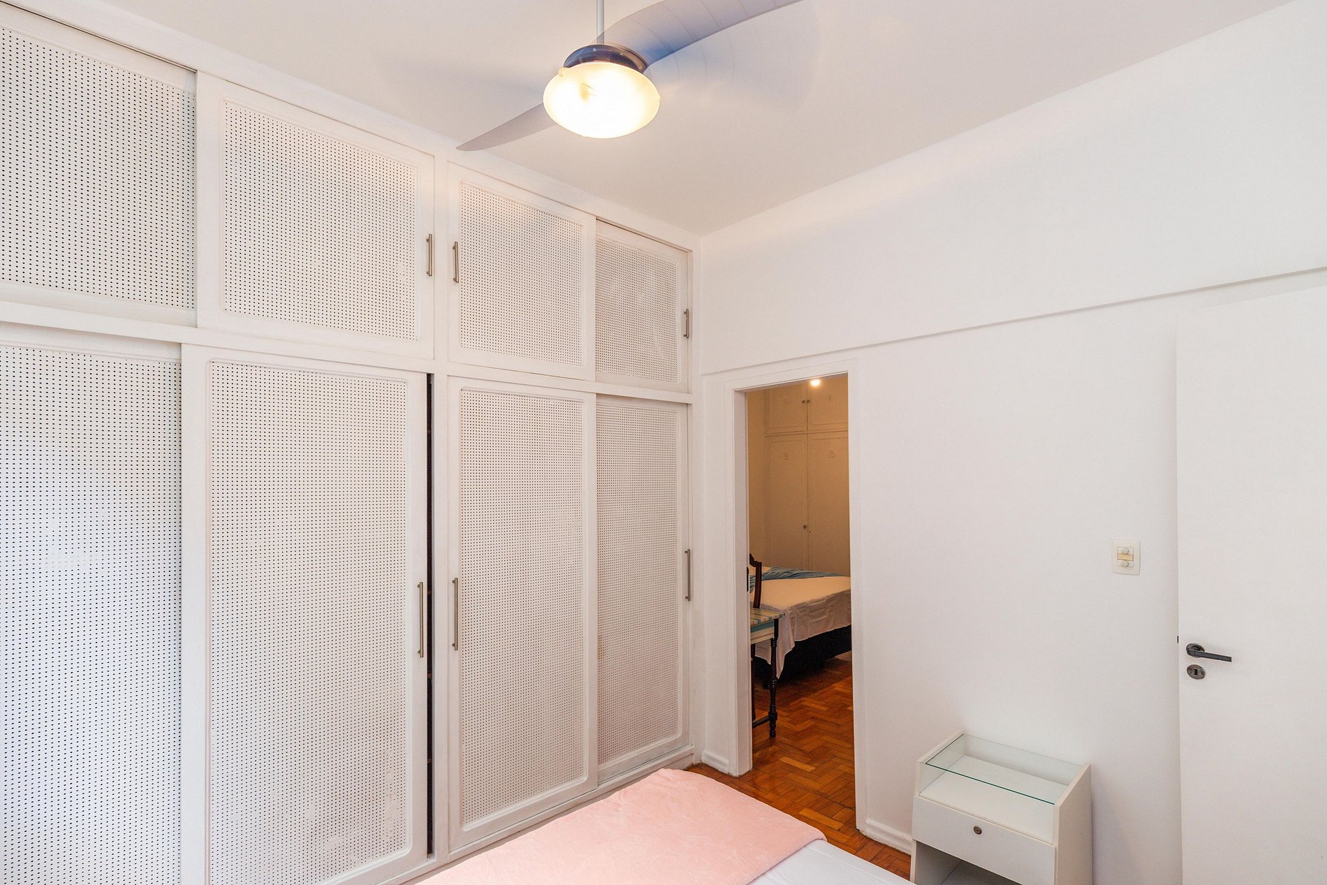 Os dois quartos possuem ar-condicionado, ventilador de teto e armário disponíveis para uso dos hóspedes.