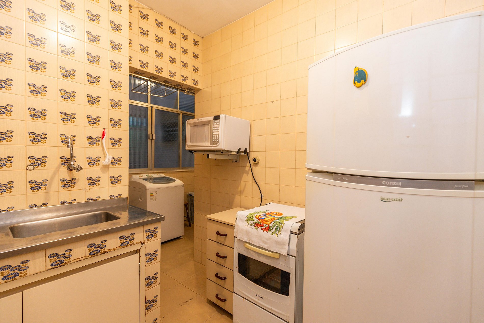 A cozinha é compacta e simples, mas equipada com tudo o que você precisa para preparar suas refeições, incluindo fogão com forno e micro-ondas.