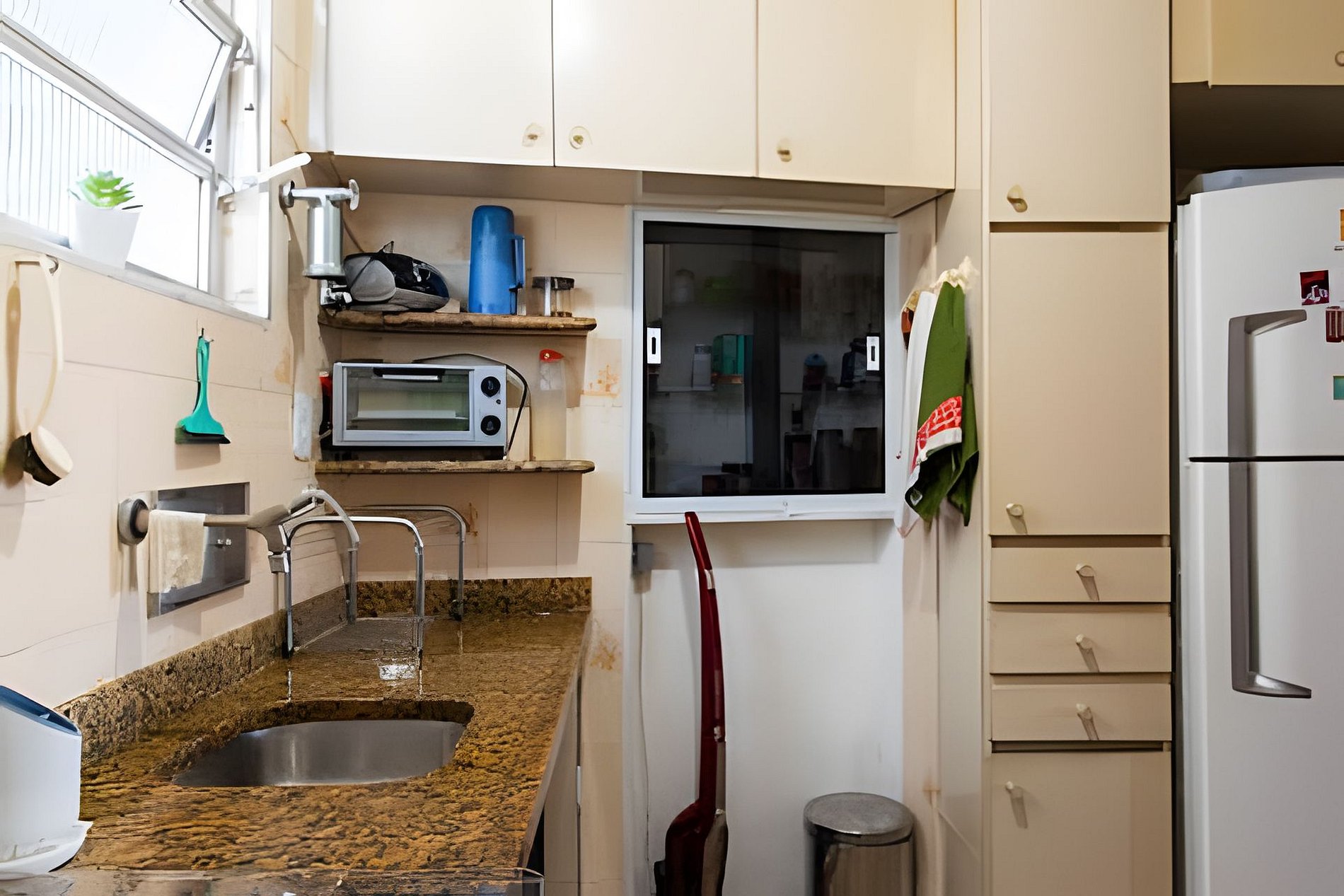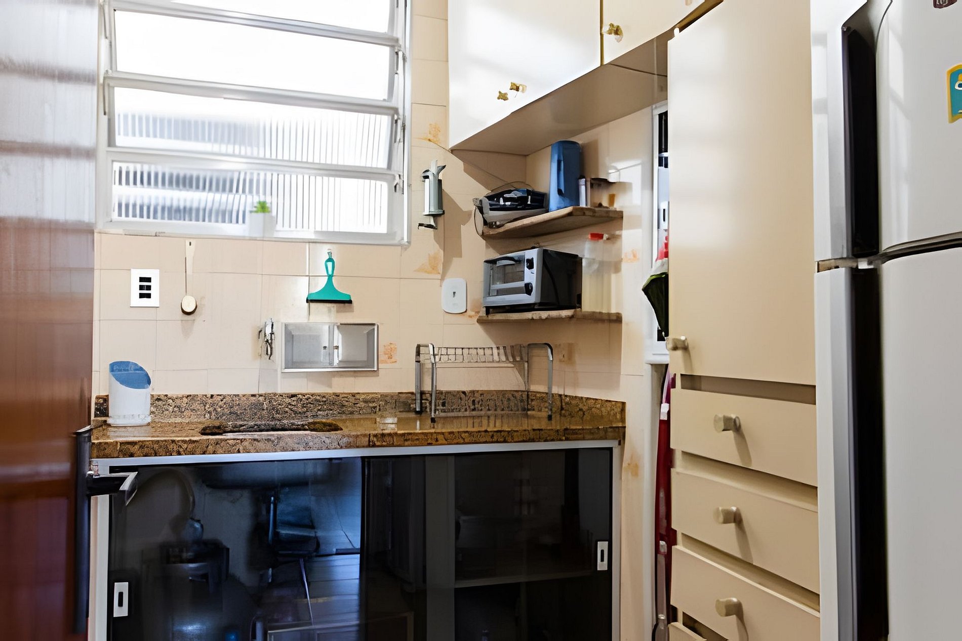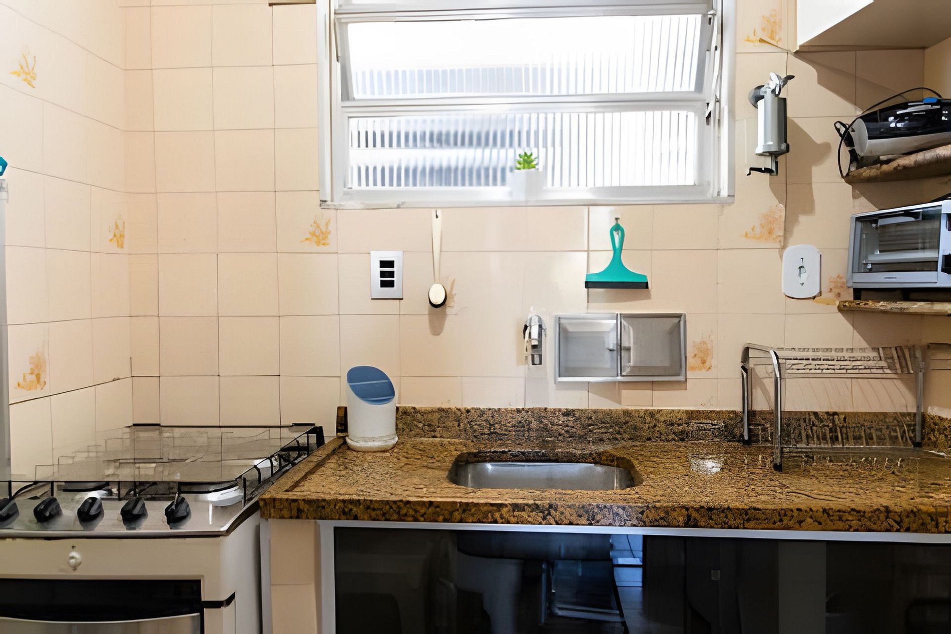 A cozinha está parcialmente disponível: é possível usar a geladeira e o micro-ondas apenas, mas cozinhar no fogão não.