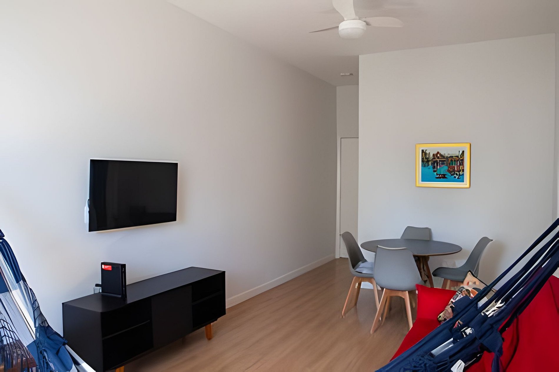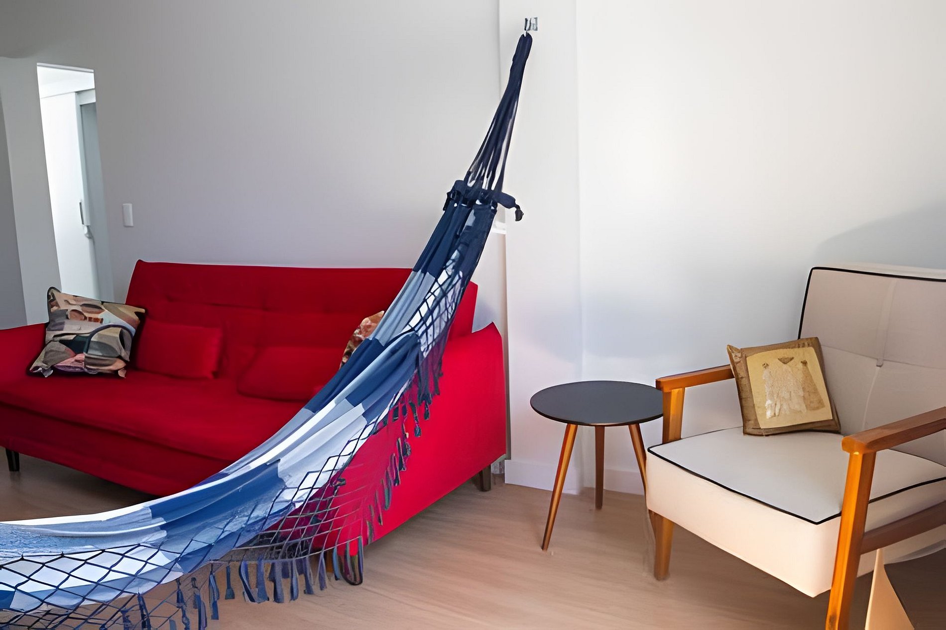 Não podemos deixar de destacar a belíssima, inspiradora e aconchegante rede que disponibilizamos aos hóspedes na sala.