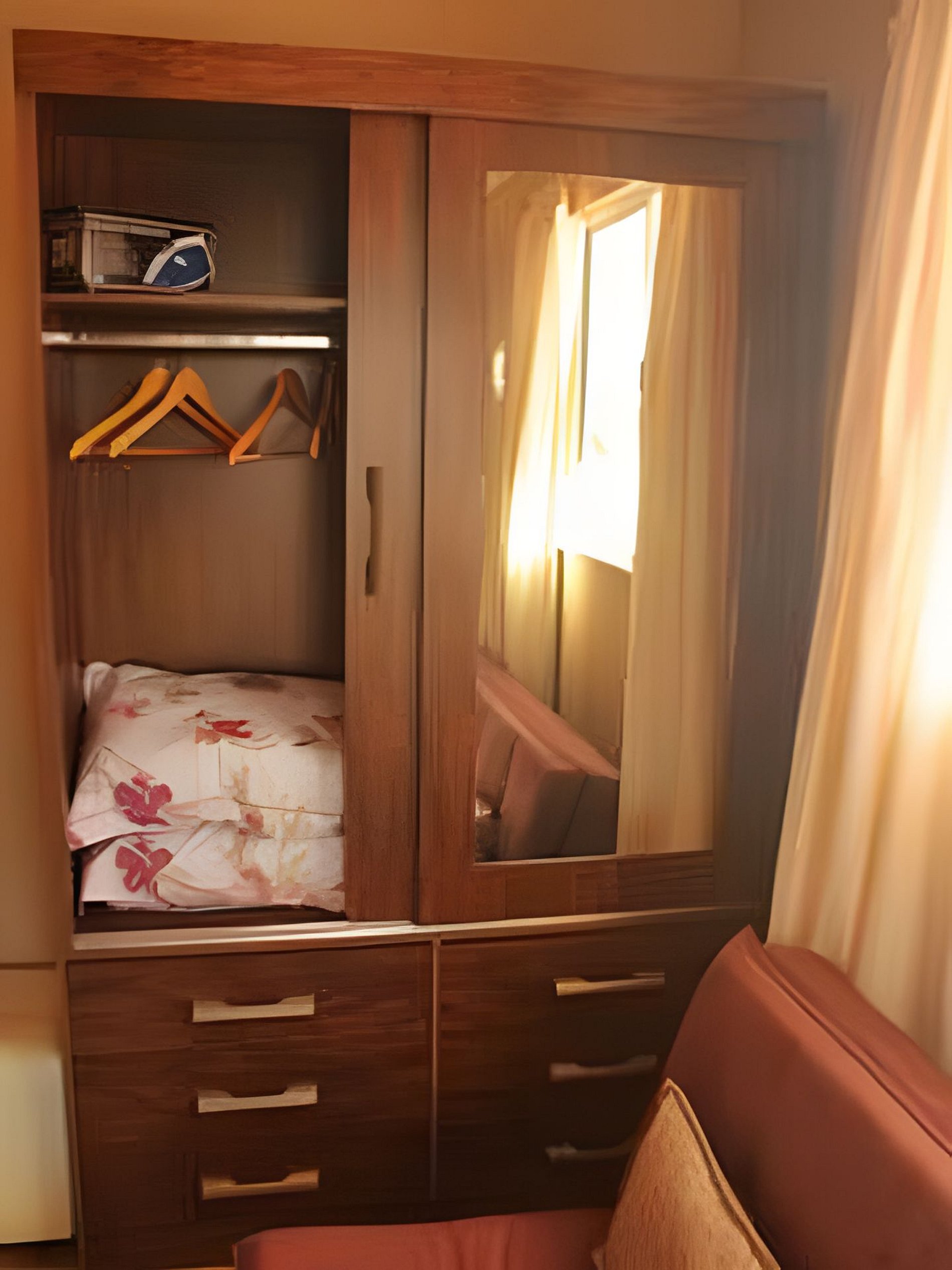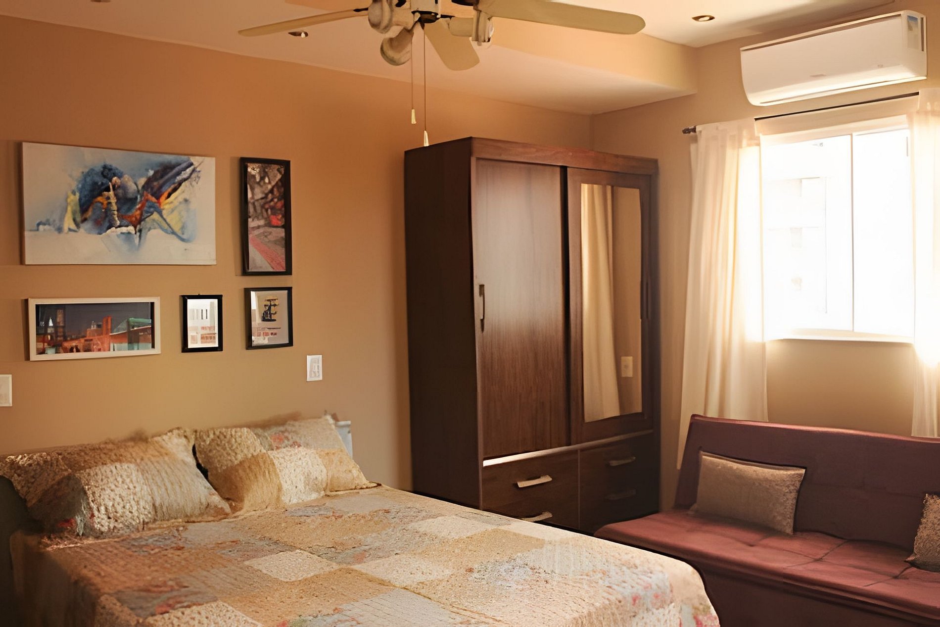 O quarto é equipado com um potente ar-condicionado split e, também ventilador de teto. Contamos com um aparelho Roku para transformar a tv em uma smartv e assim assistir aos aplicativos de streaming de sua preferência. O armário é bem grande e cabe facilmente as malas de 4 hóspedes.