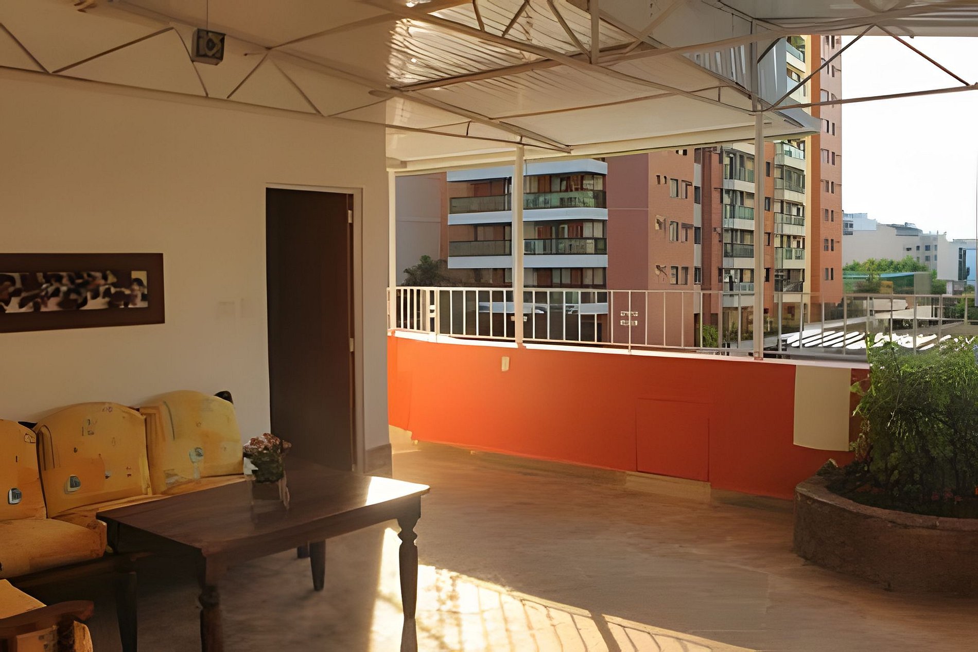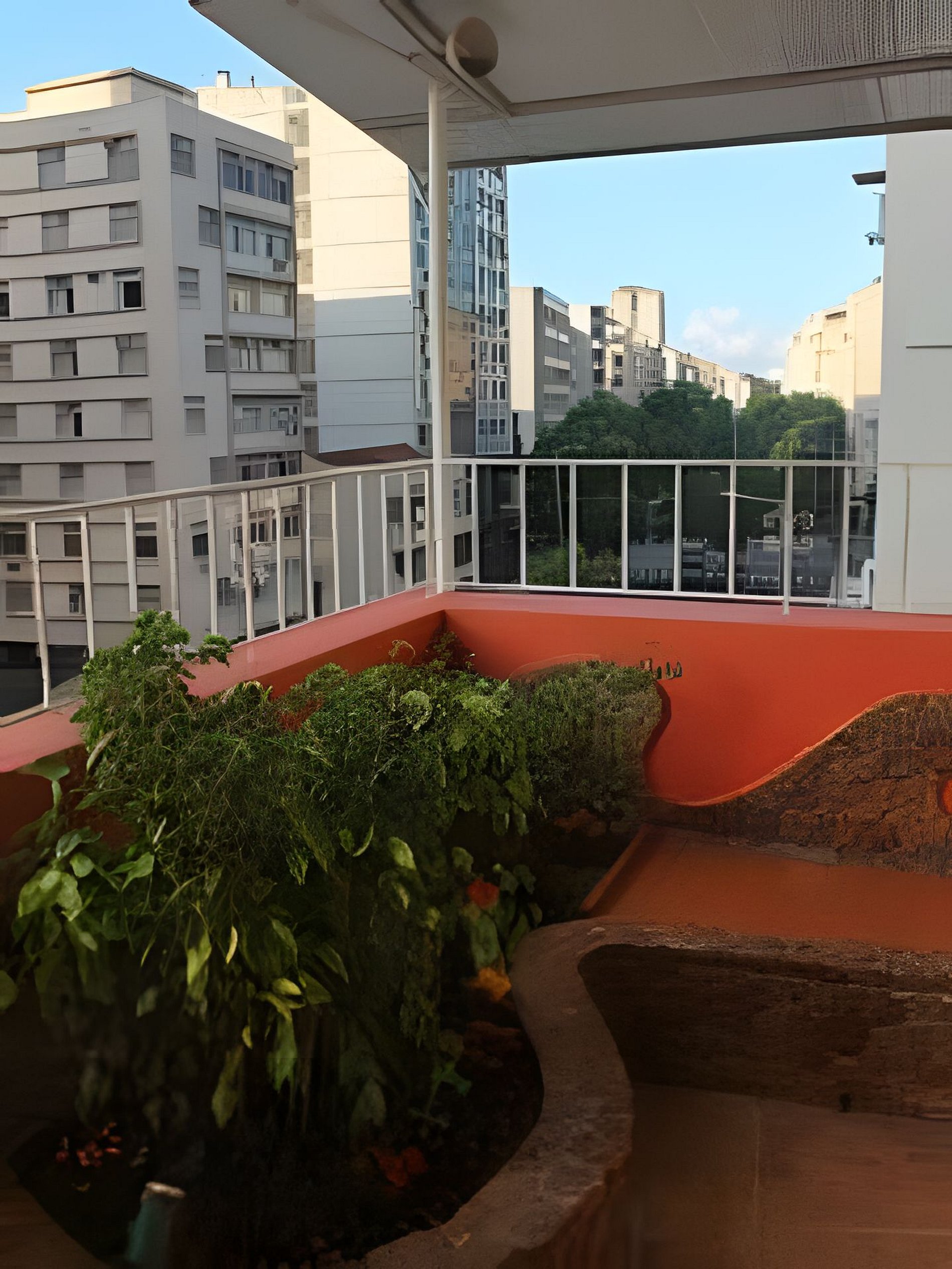 A varanda que circunda a cobertura é compartilhada entre os proprietários e hóspedes. No entanto, a área com piscina e churrasqueira é de uso exclusivo dos proprietários, não estando acessível aos hóspedes.