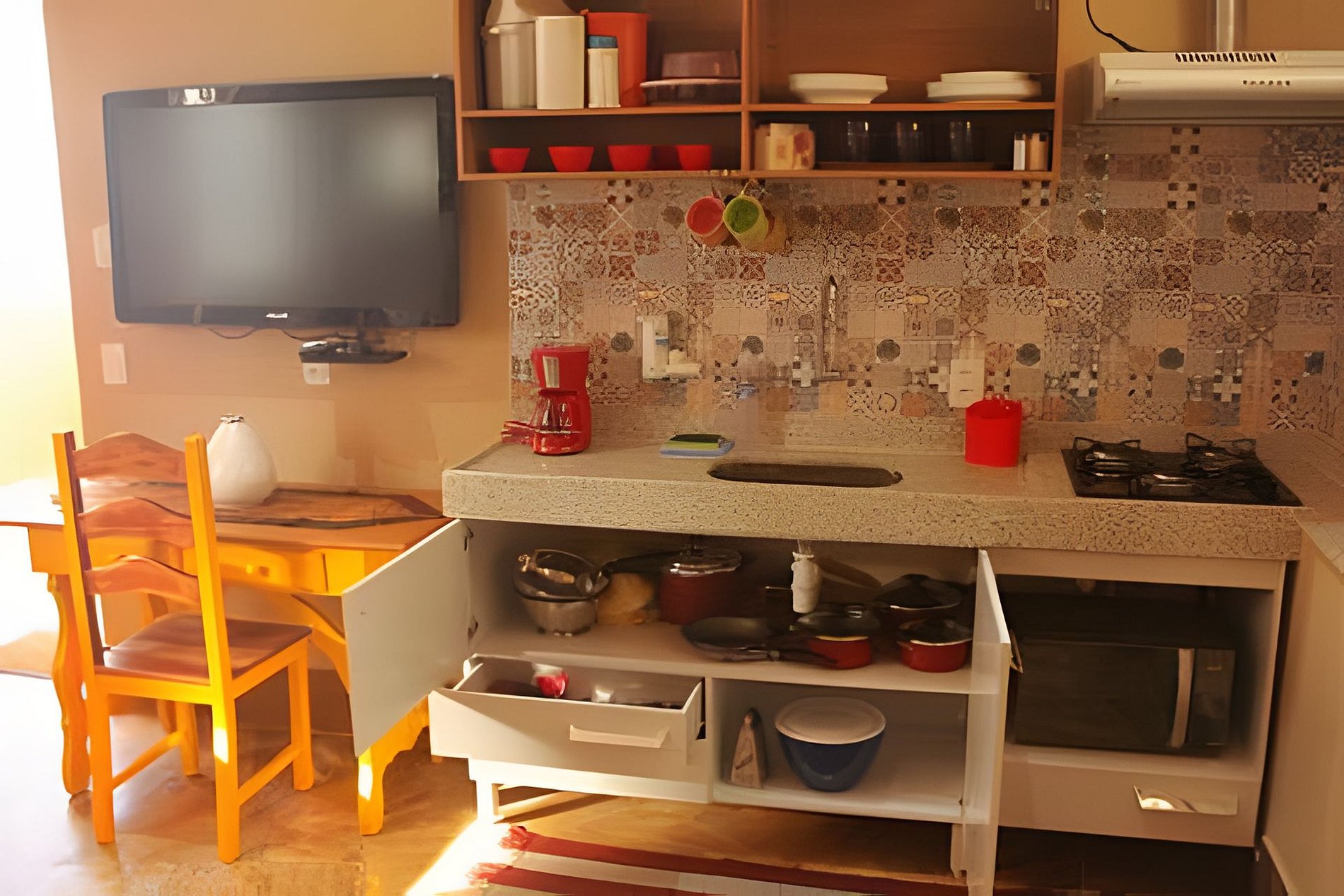 Na cozinha, além de, claro, geladeira com freezer, fogão, microondas, podemos facilitar dizendo que tem praticamente todos os utensílios conhecidos de cozinha.