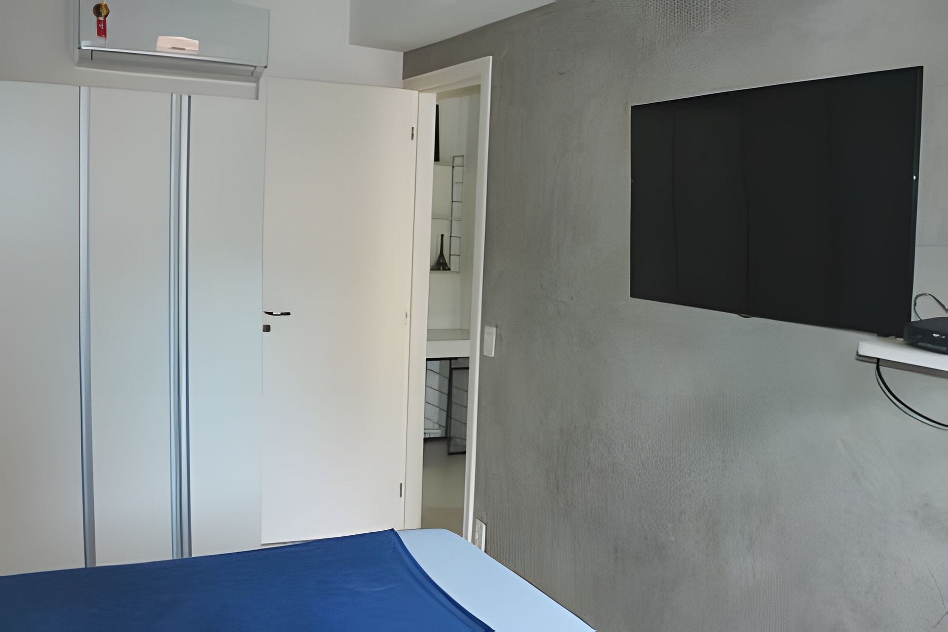 Na sala temos um confortável sofá-cama (que faz com que possamos receber até 4 hóspedes no espaço) e também conta com ar-condicionado instalado.