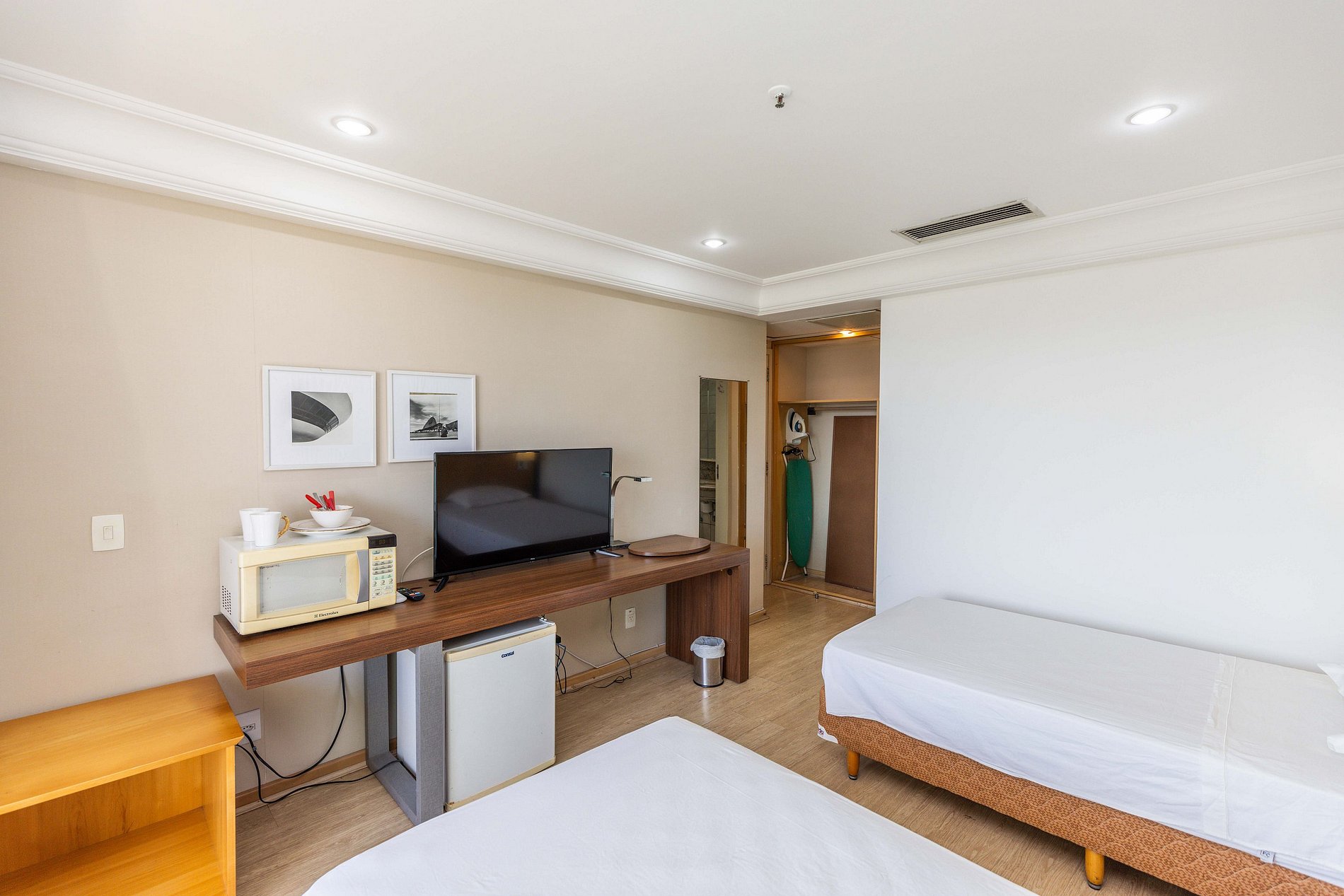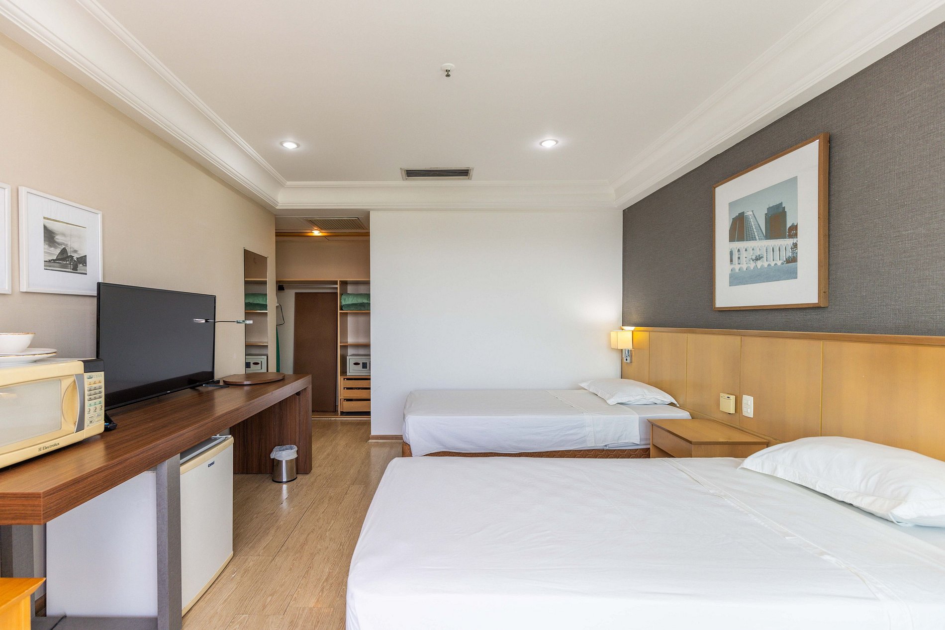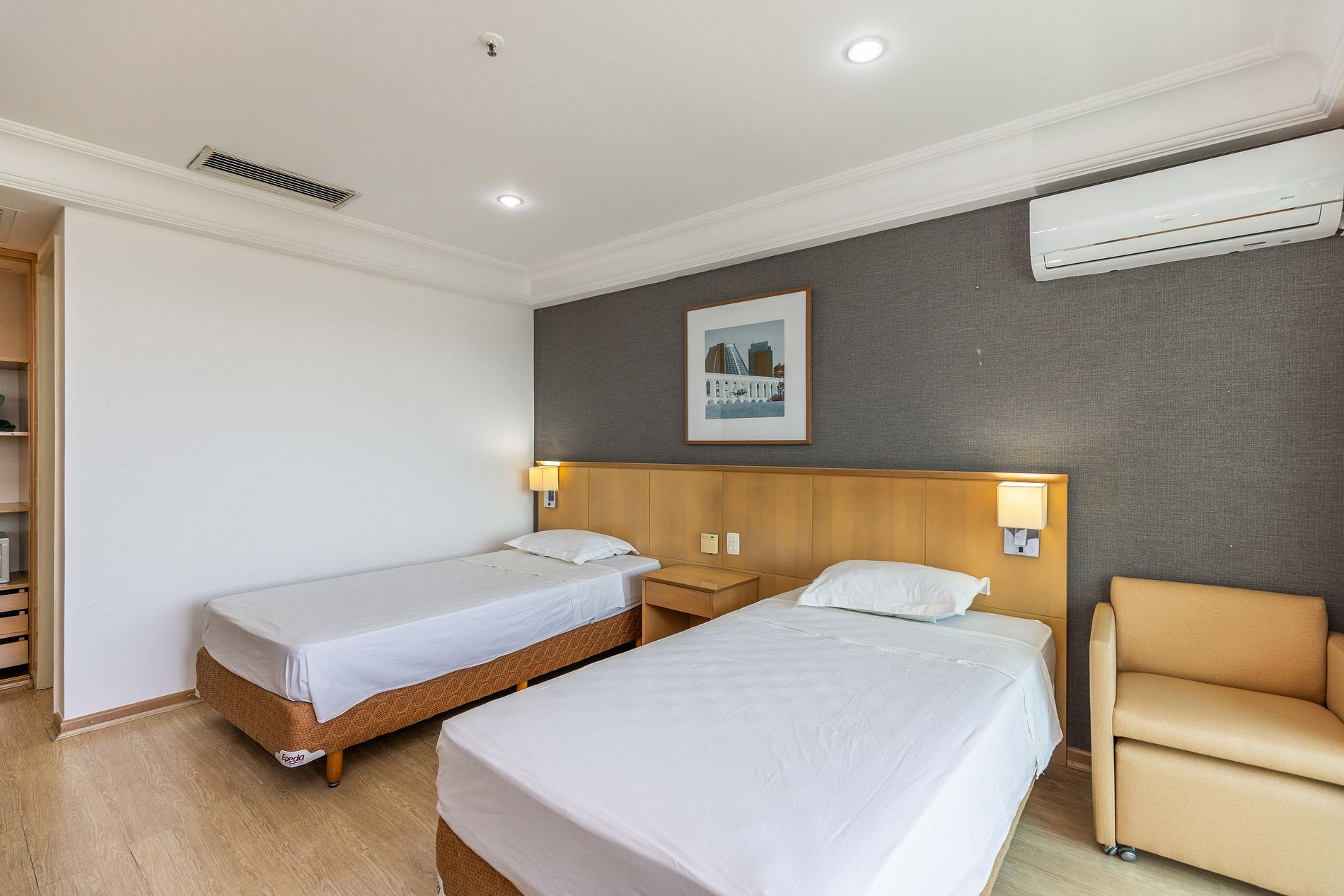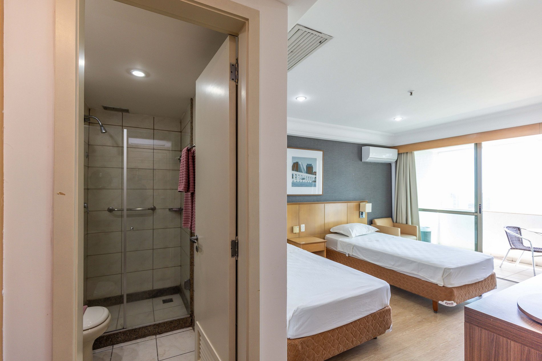 Neste espaço temos capacidade de hospedar até 3 hóspedes. Como pode-se ver nas fotos, o quarto possui duas camas de solteiro king bem grandes para receber 2 hóspedes. Caso seja da preferência do hóspede, podemos unir as duas camas para formar uma cama de casal (assim como muitos hotéis fazem).