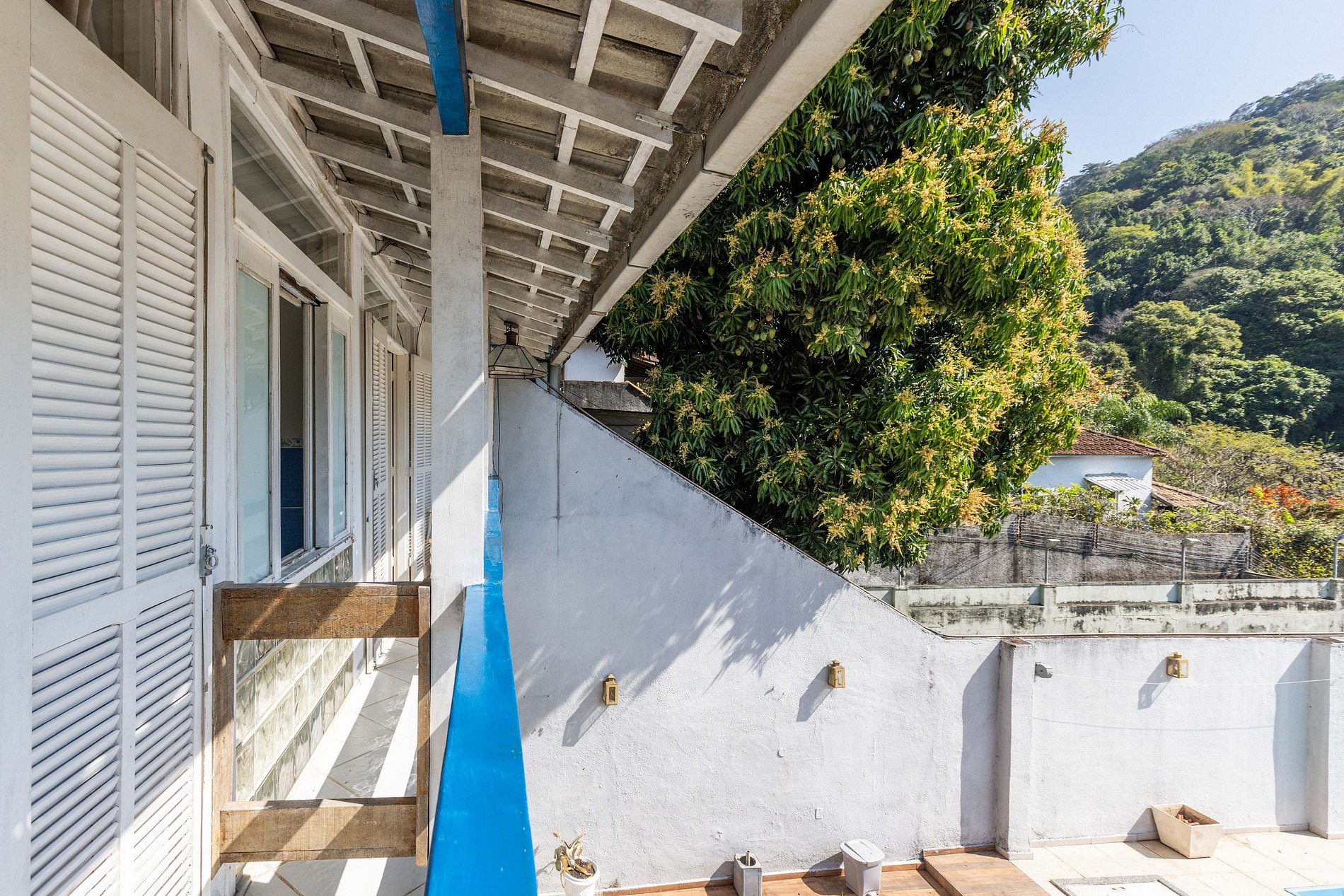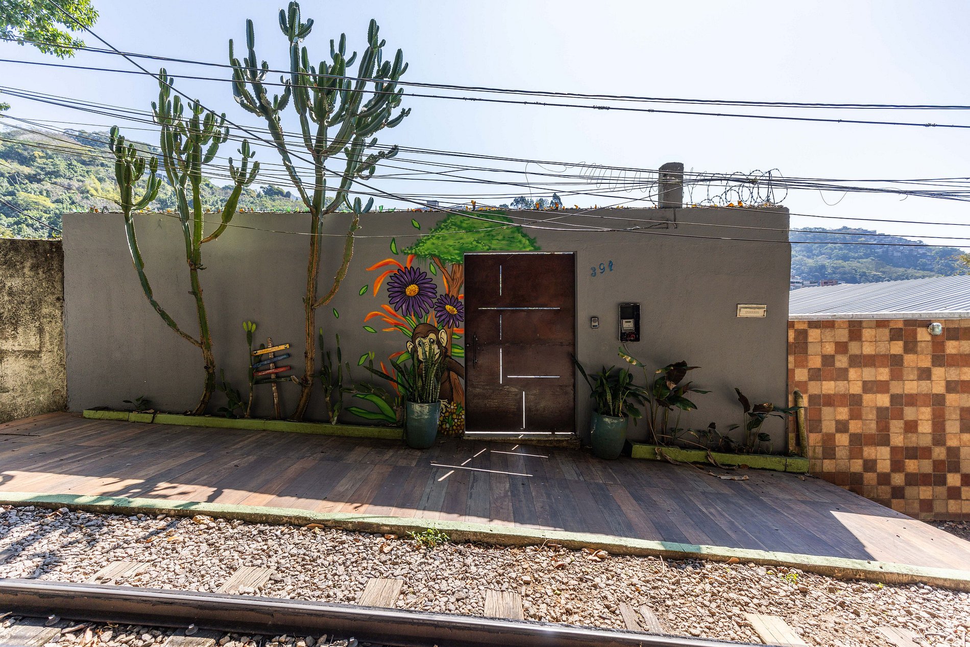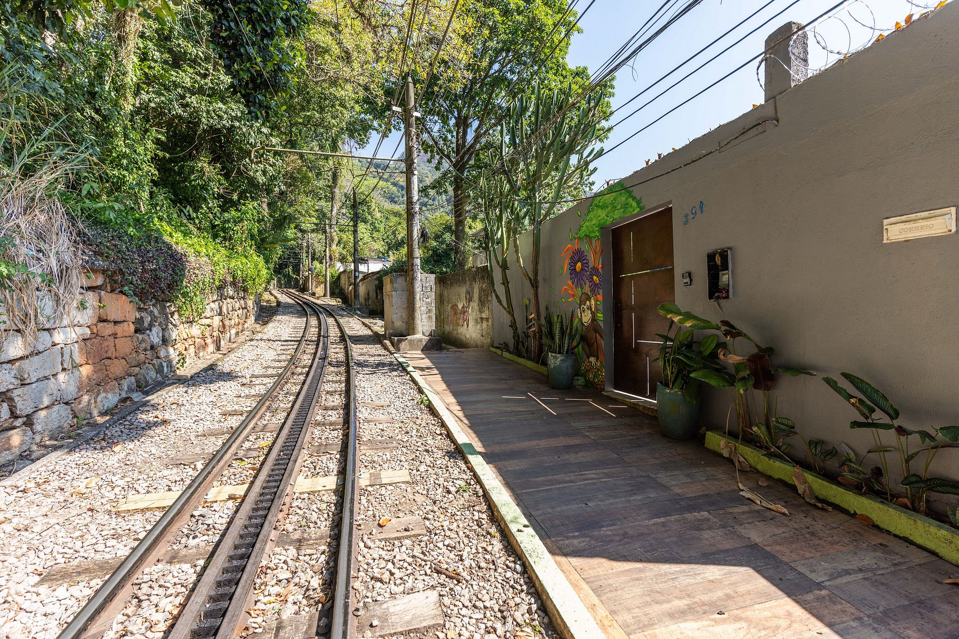É isso mesmo, esta bela casa está localizada no Corcovado em frente ao trilho de trem que leva ao Cristo Redentor. Assim, quando chegamos até o limite de onde a Rua Filinto de Almeida permite passagem de carros, precisamos fazer uma pequena caminhada de 70 metros para chegar até a casa.
