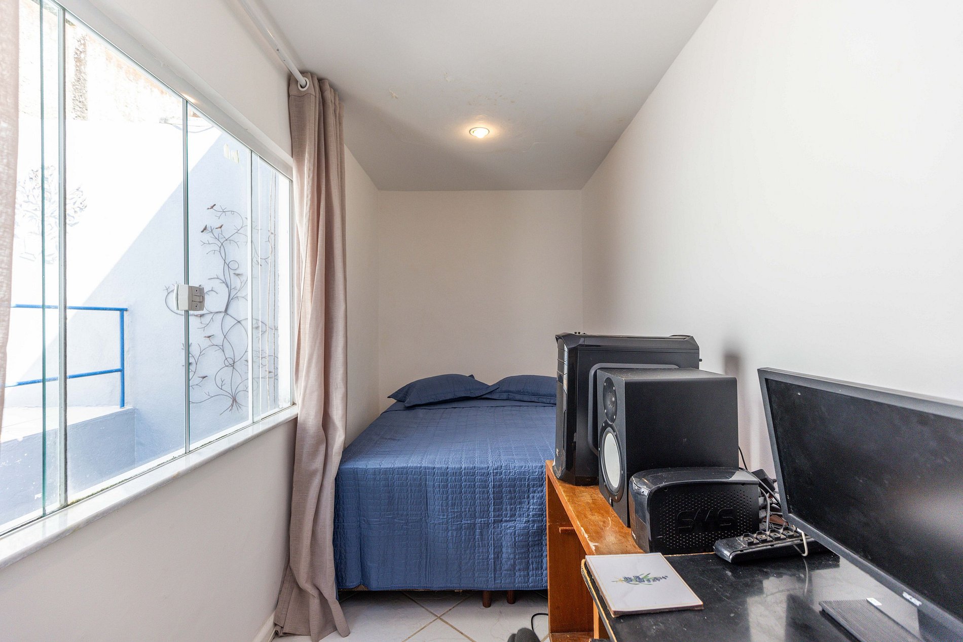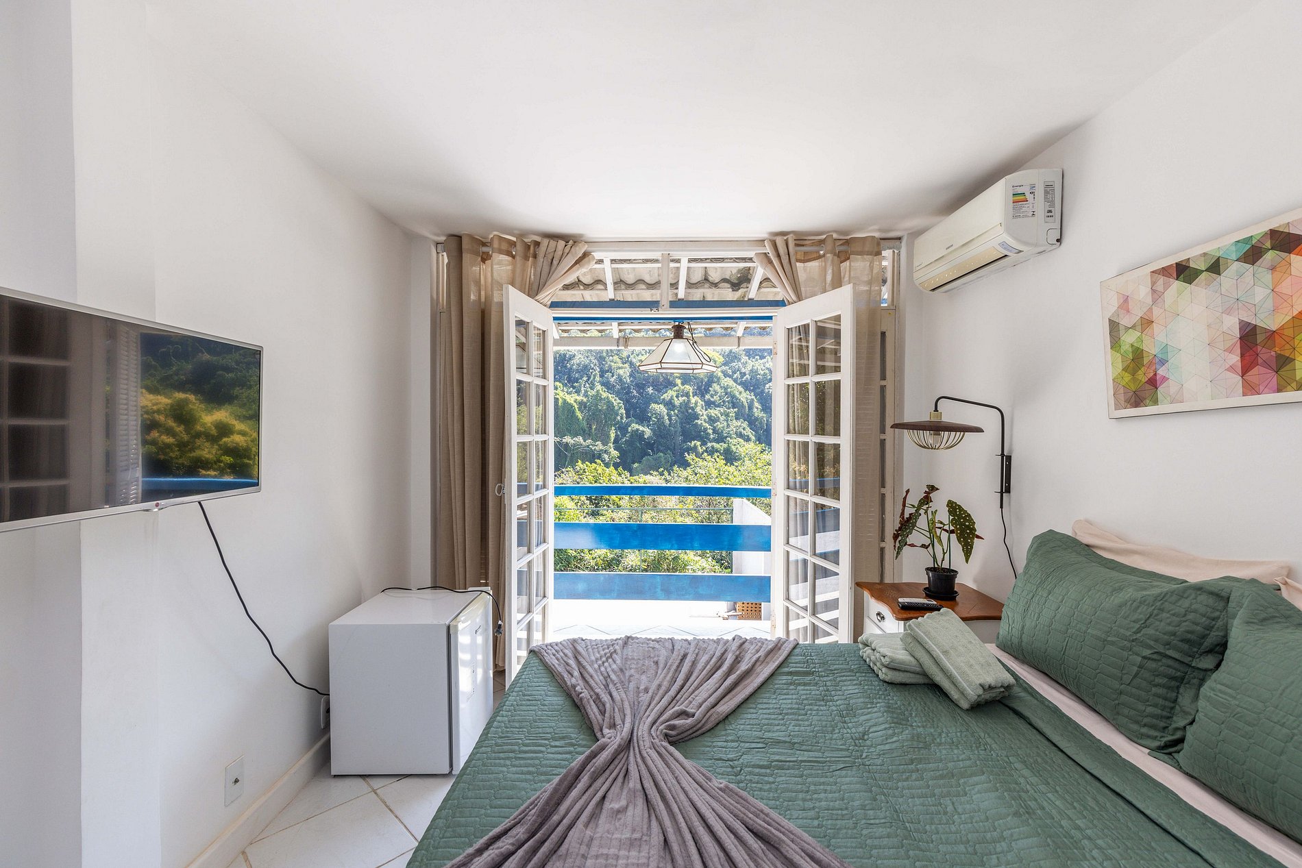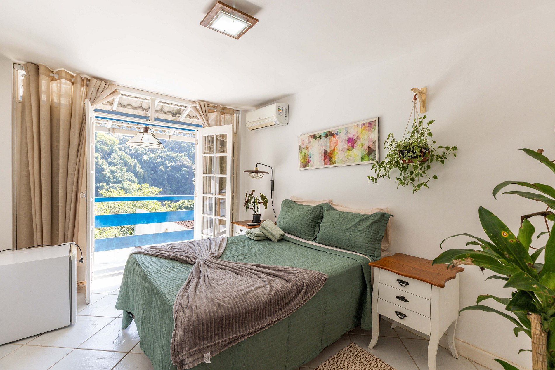 O último quarto é o único que não possui ar condicionado. Mas podem acreditar que é fresco porque estar situado na montanha e rodeado pela floresta propicia um micro clima único na casa. Este quarto possui duas camas de solteiro que, unidas ou não, acomodam mais 2 hóspedes e, desta forma, chegamos ao nosso número máximo de 10 hóspedes.