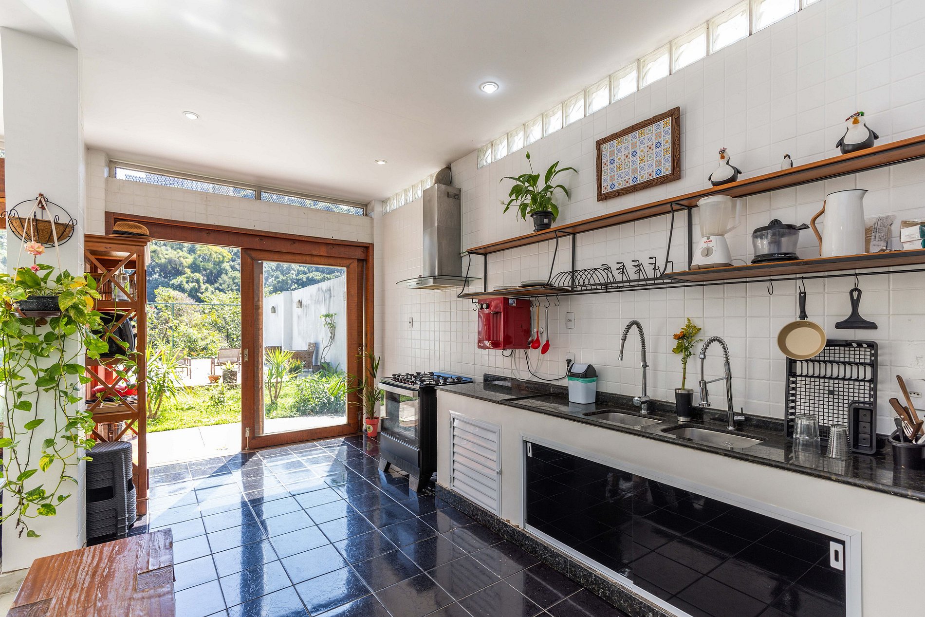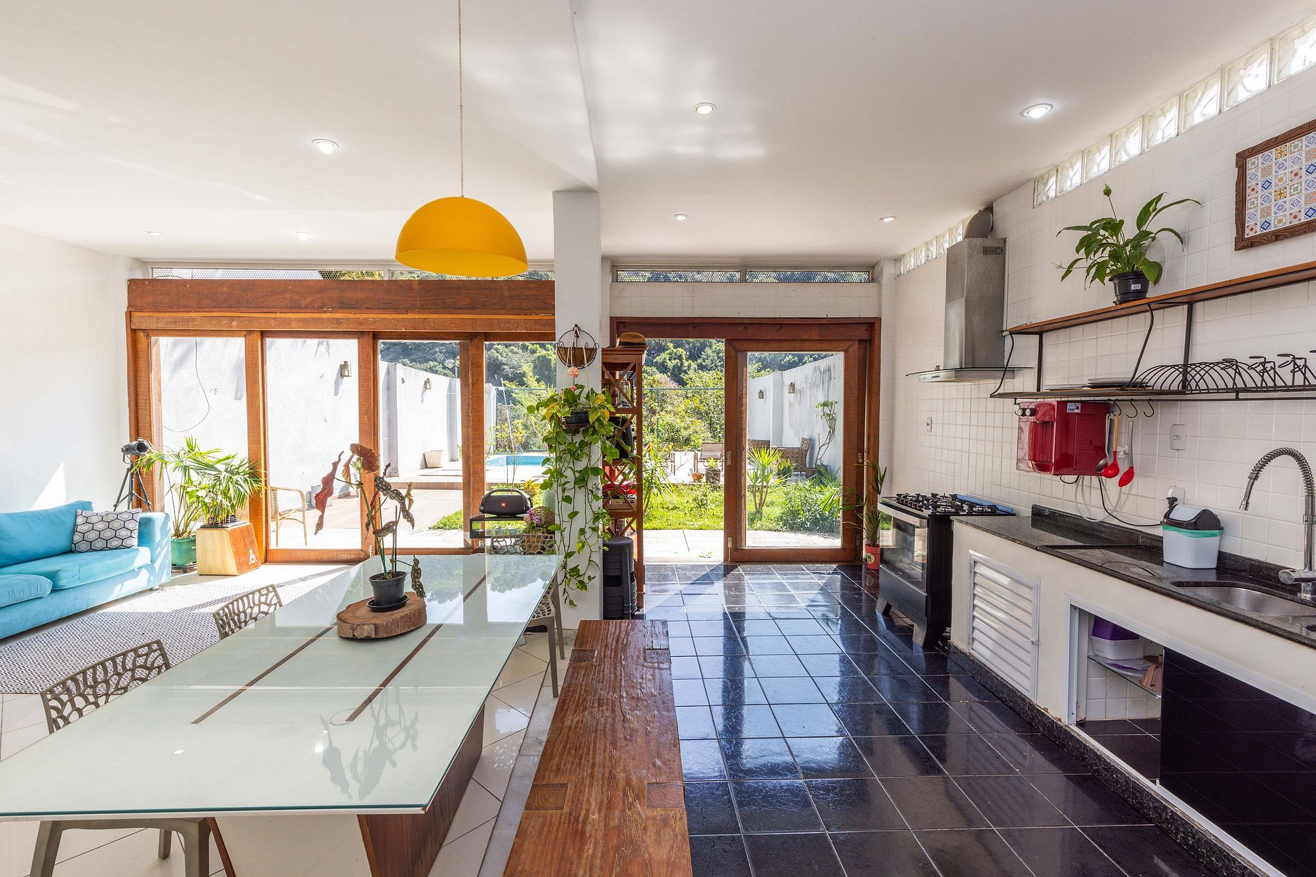 A cozinha possui todos os itens básicos necessários para que o hóspede possa cozinhar e fazer suas refeições em casa. O ambiente é integrado à sala e acessa direto a área de piscina, propiciando momentos de conexão entre amigos e familiares.