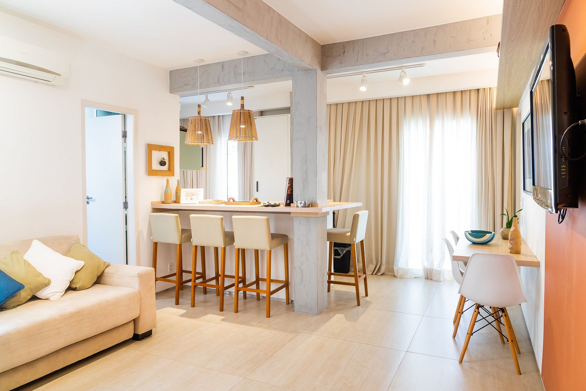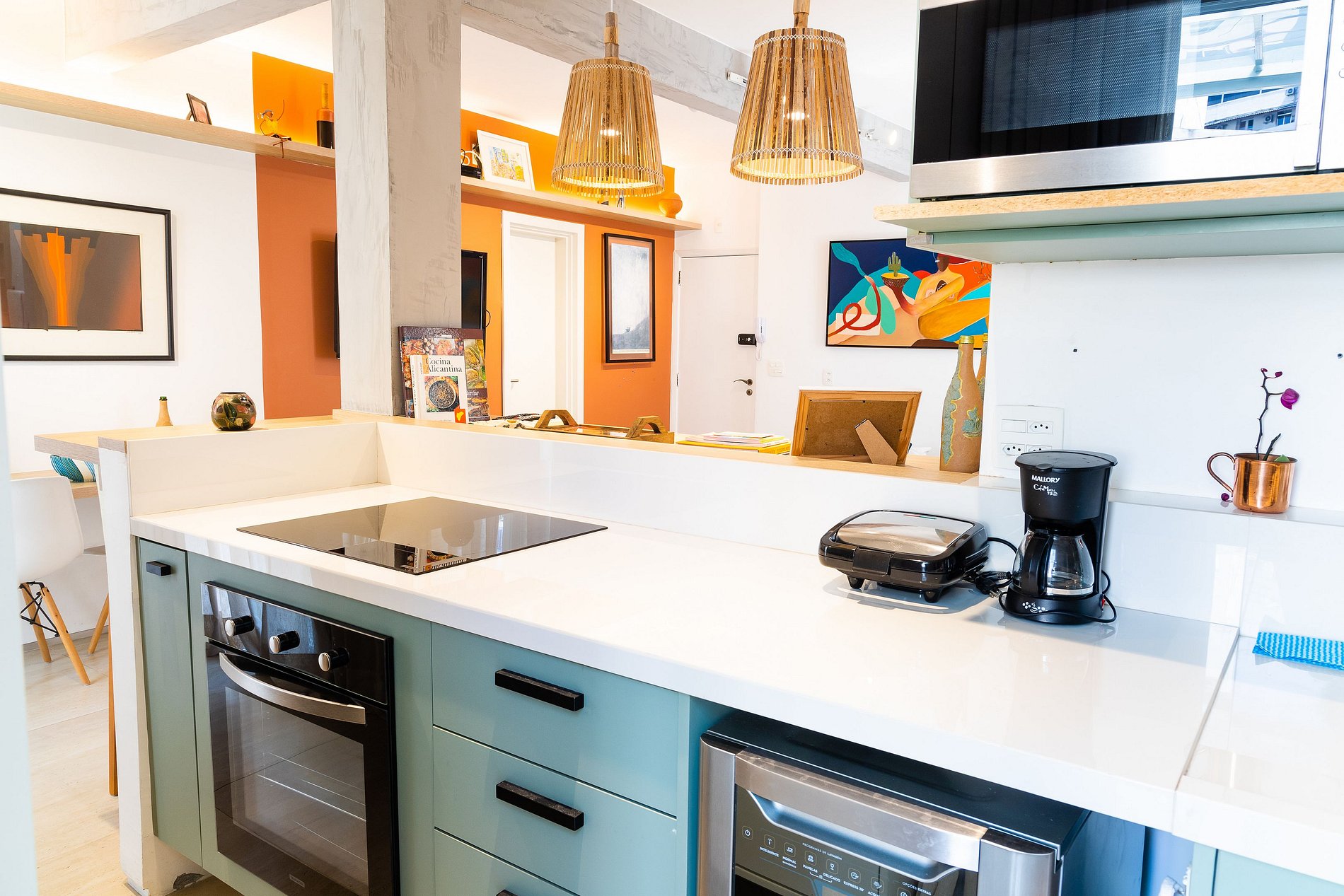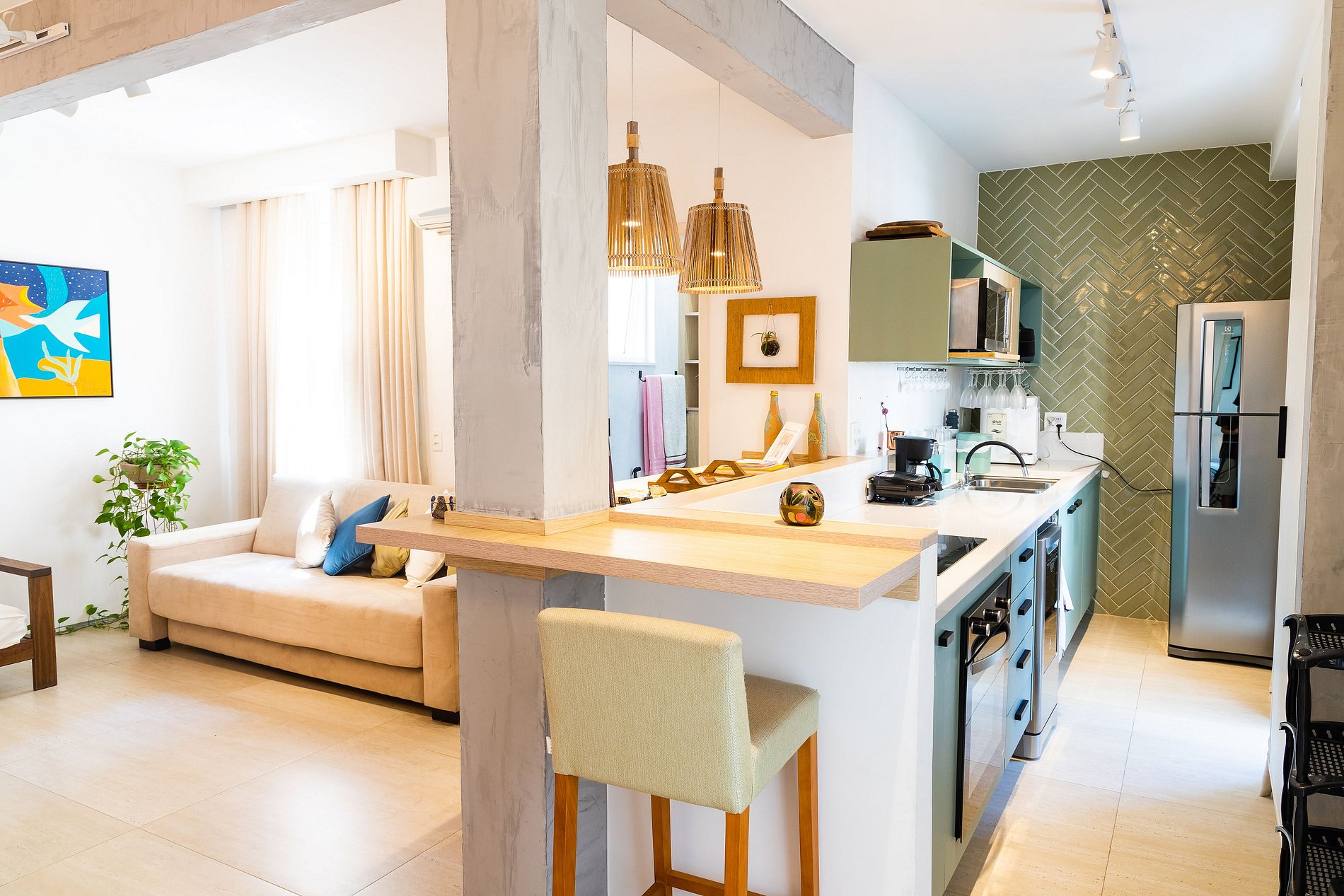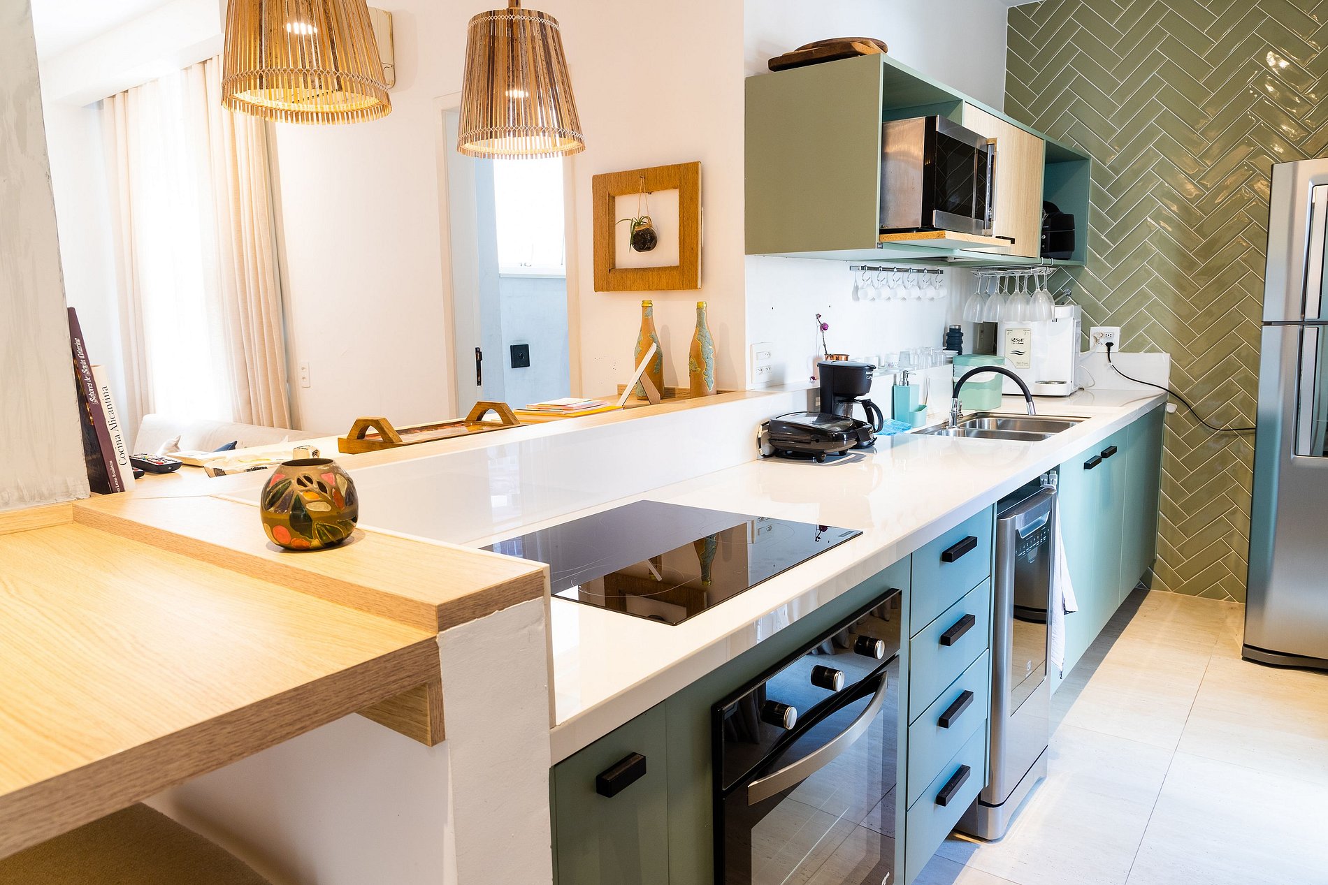 -> Cozinha Americana: A cozinha integrada à sala oferece um espaço prático e funcional, perfeito para quem gosta de preparar refeições em casa sem perder o contato com os demais hóspedes. Equipada com eletrodomésticos modernos e utensílios de alta qualidade, você terá tudo o que precisa para se sentir em casa.
