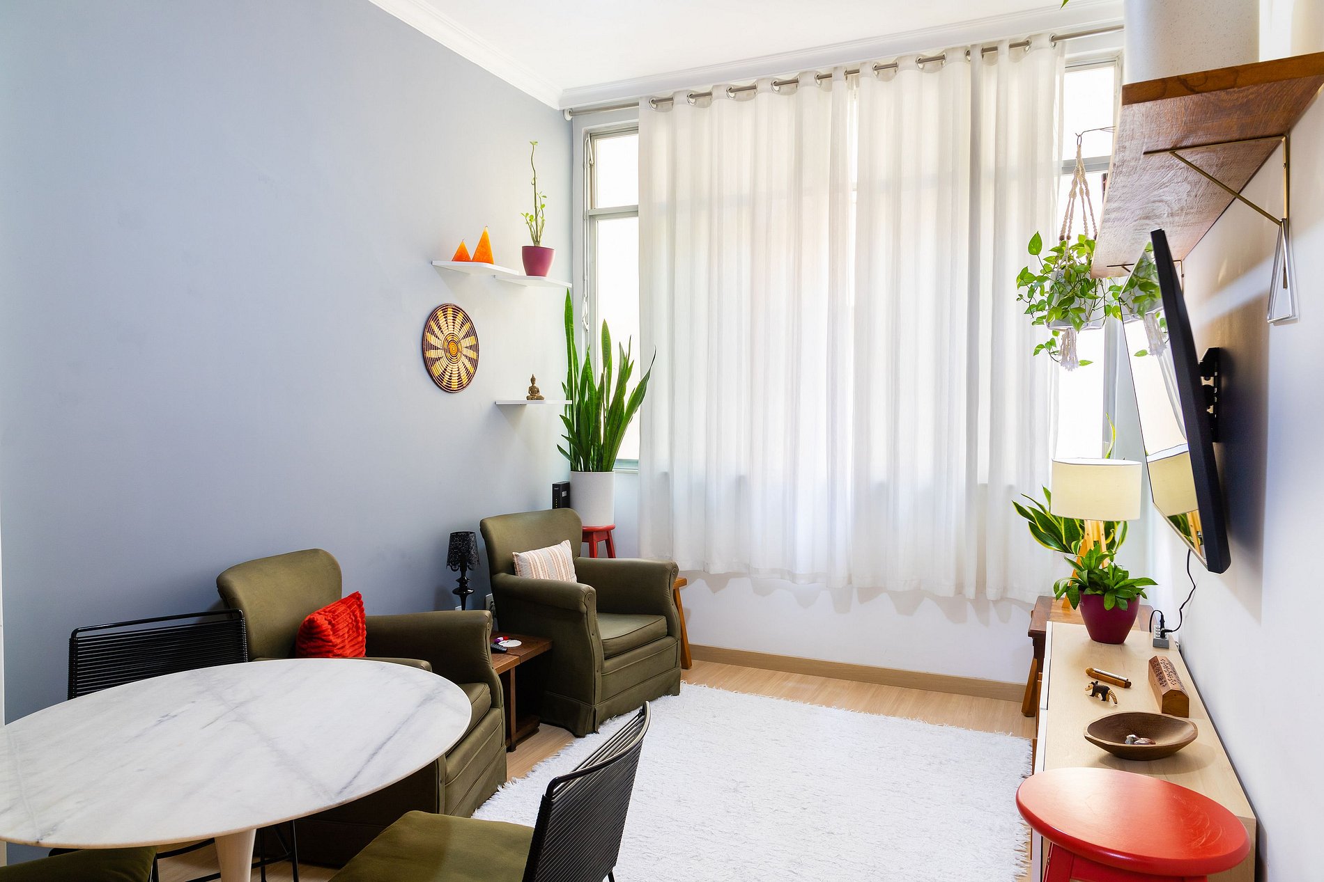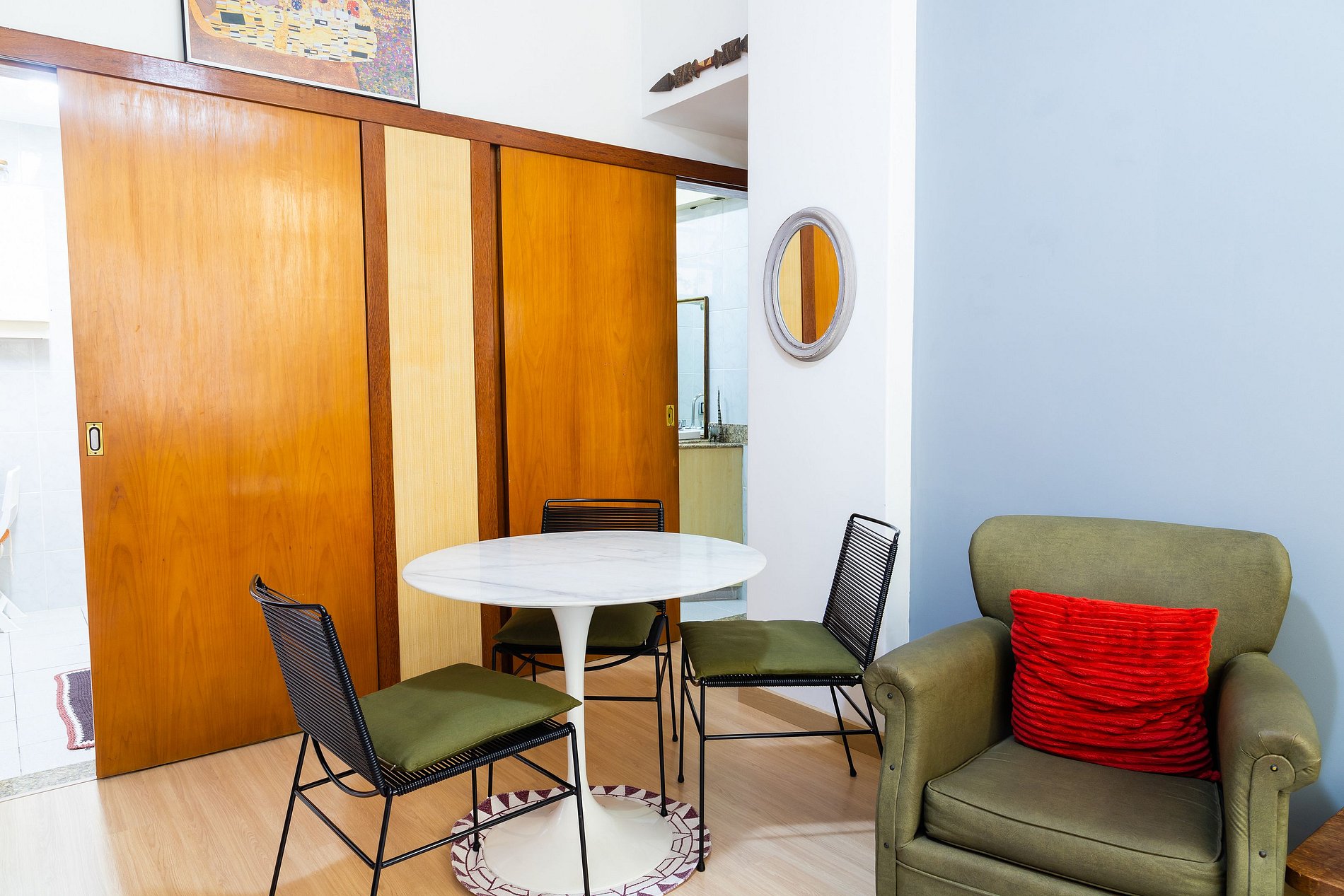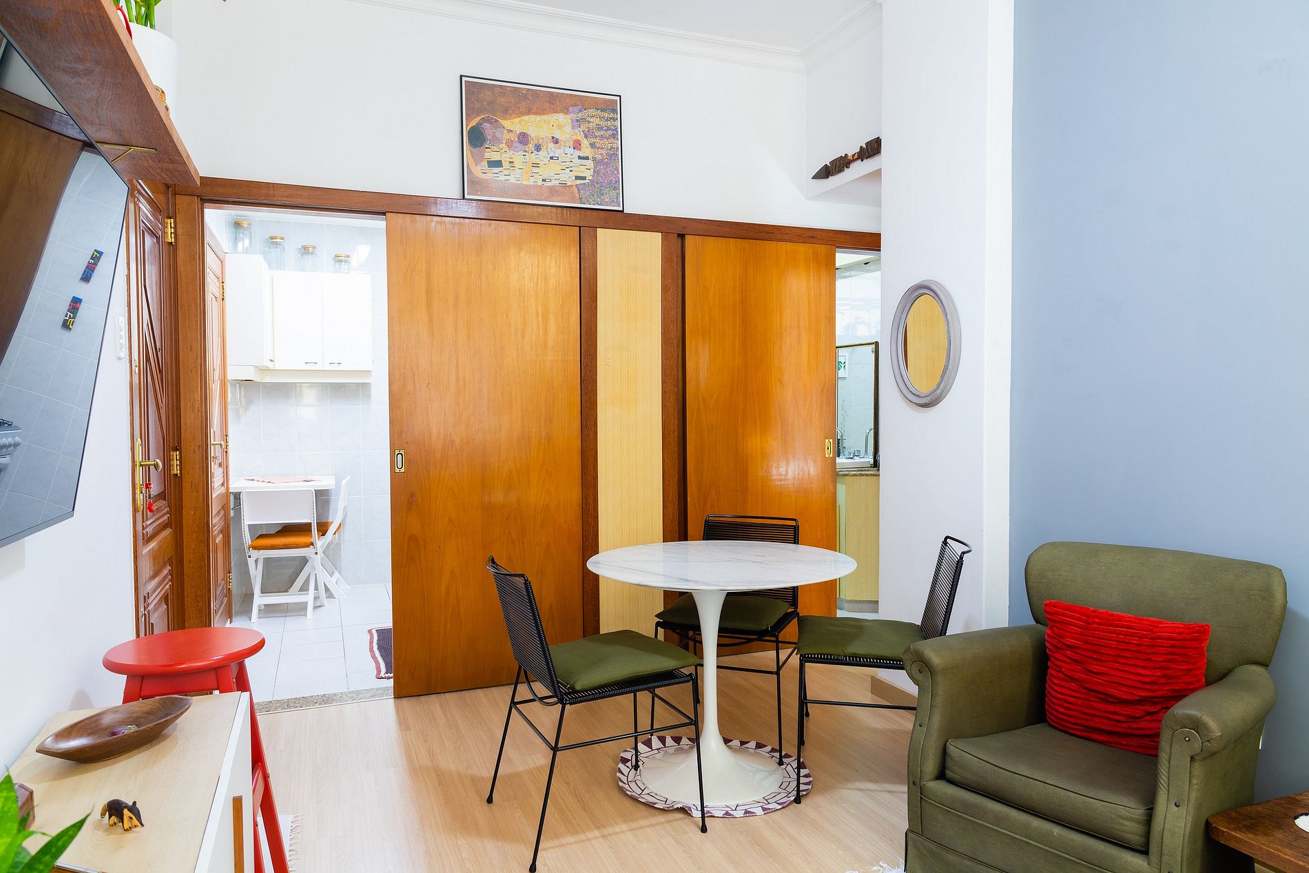Bem-vindo ao seu refúgio em Botafogo. Este apartamento de 1 quarto combina praticidade e charme em um dos bairros mais vibrantes do Rio. Com uma decoração autêntica que mistura o estilo clássico carioca com toques modernos, o espaço é pensado para proporcionar conforto e uma atmosfera acolhedora. No quarto, a cama de casal, o ar-condicionado e a pequena mesa de trabalho tornam o ambiente ideal tanto para descansar quanto para realizar atividades remotamente. A sala espaçosa, com ventilador de teto, mesa de jantar e poltronas confortáveis, oferece o ambiente perfeito para relaxar após um dia de passeios. A SmartTV é ideal para você curtir suas séries favoritas ou navegar na internet. Já a cozinha compacta está equipada com todos os utensílios essenciais, permitindo que você prepare refeições como se estivesse em casa. A área de serviço, com tanque e máquina de lavar, oferece mais praticidade para estadias mais longas.