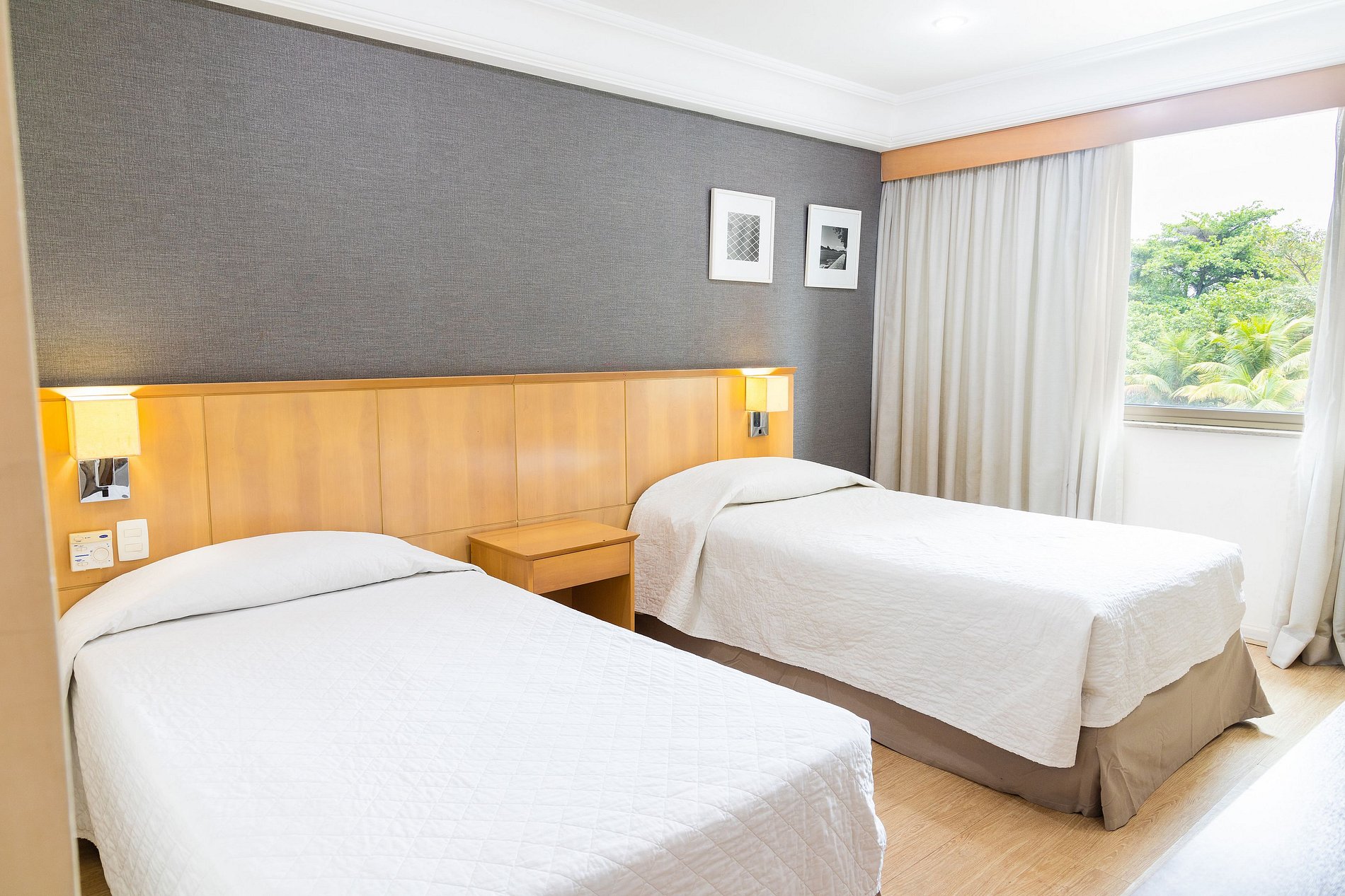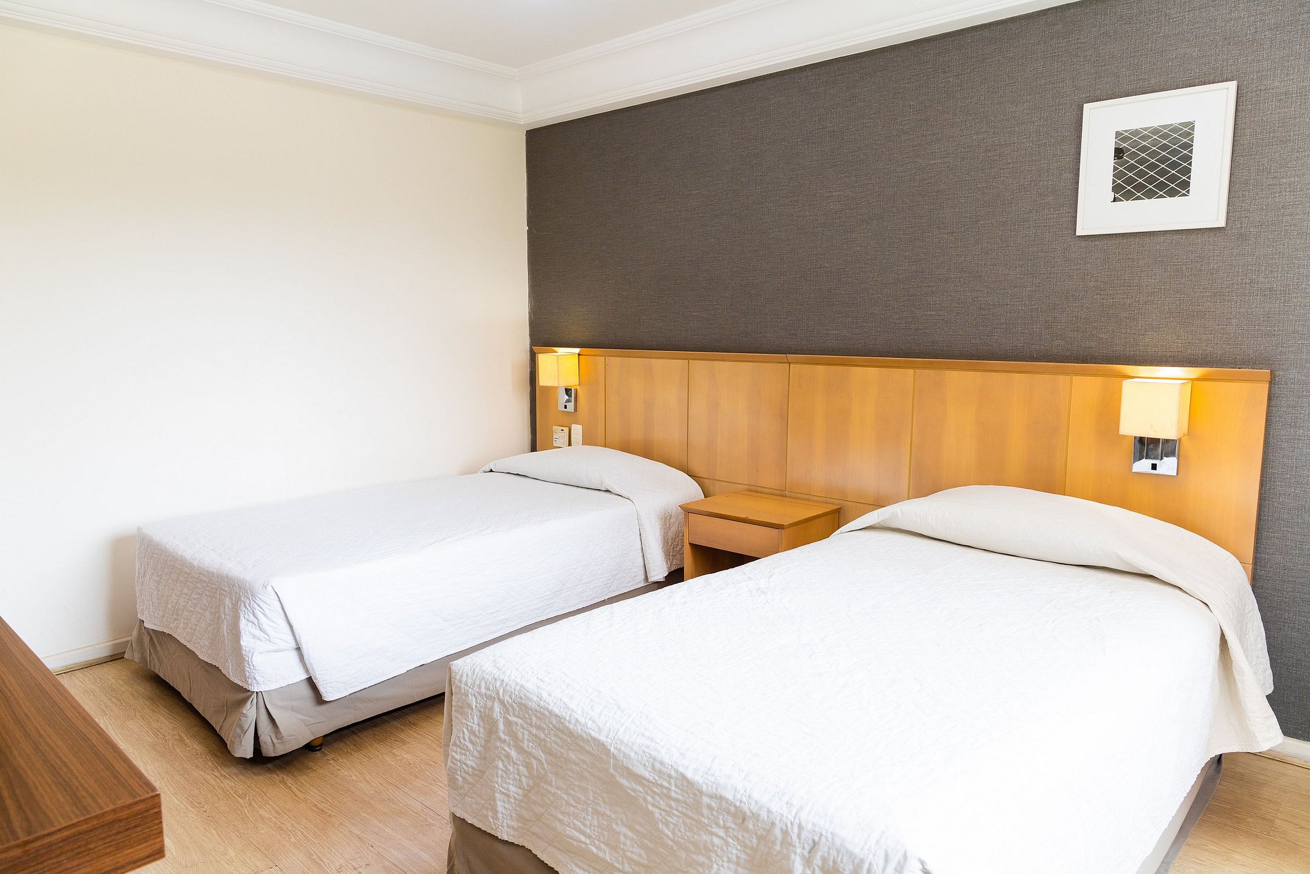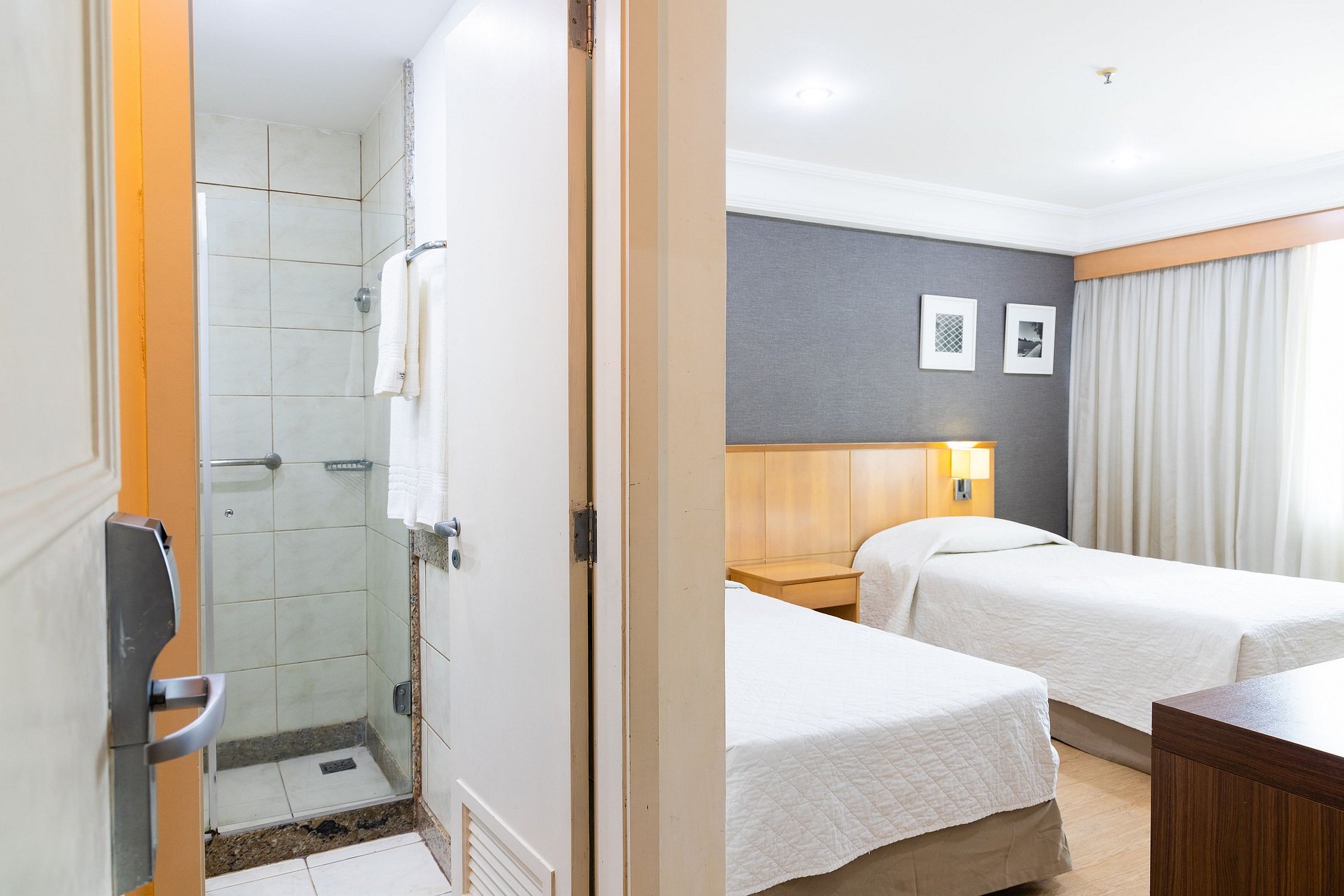 Neste espaço temos capacidade de hospedar até 3 hóspedes. Como pode-se ver nas fotos, o quarto possui duas camas de solteiro king bem grandes para receber 2 hóspedes. Caso seja da preferência do hóspede, podemos unir as duas camas para formar uma cama de casal (assim como muitos hotéis fazem). O terceiro hóspede se acomoda em um colchonete, destes de enrolar da Ortobom.