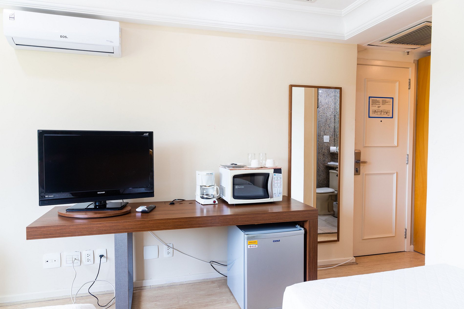 O apartamento possui tábua e ferro de passar roupa e no banheiro temos secador de cabelo. Contamos também com microondas e cafeteira para maior conforto dos hóspedes.