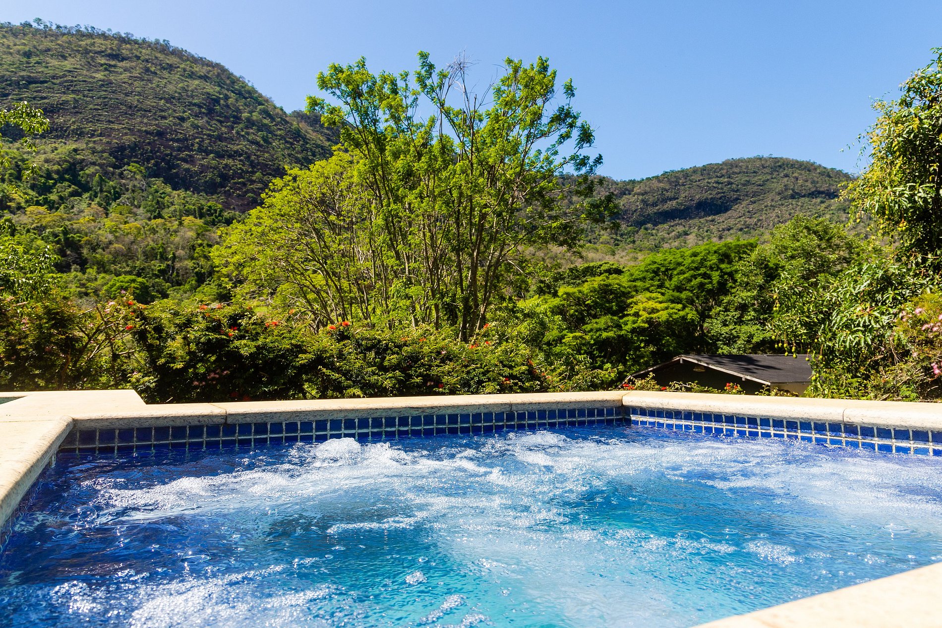 Na área externa, você encontrará uma charmosa piscina particular com hidromassagem, ideal para relaxar enquanto aprecia a vista panorâmica das montanhas que cercam o condomínio.