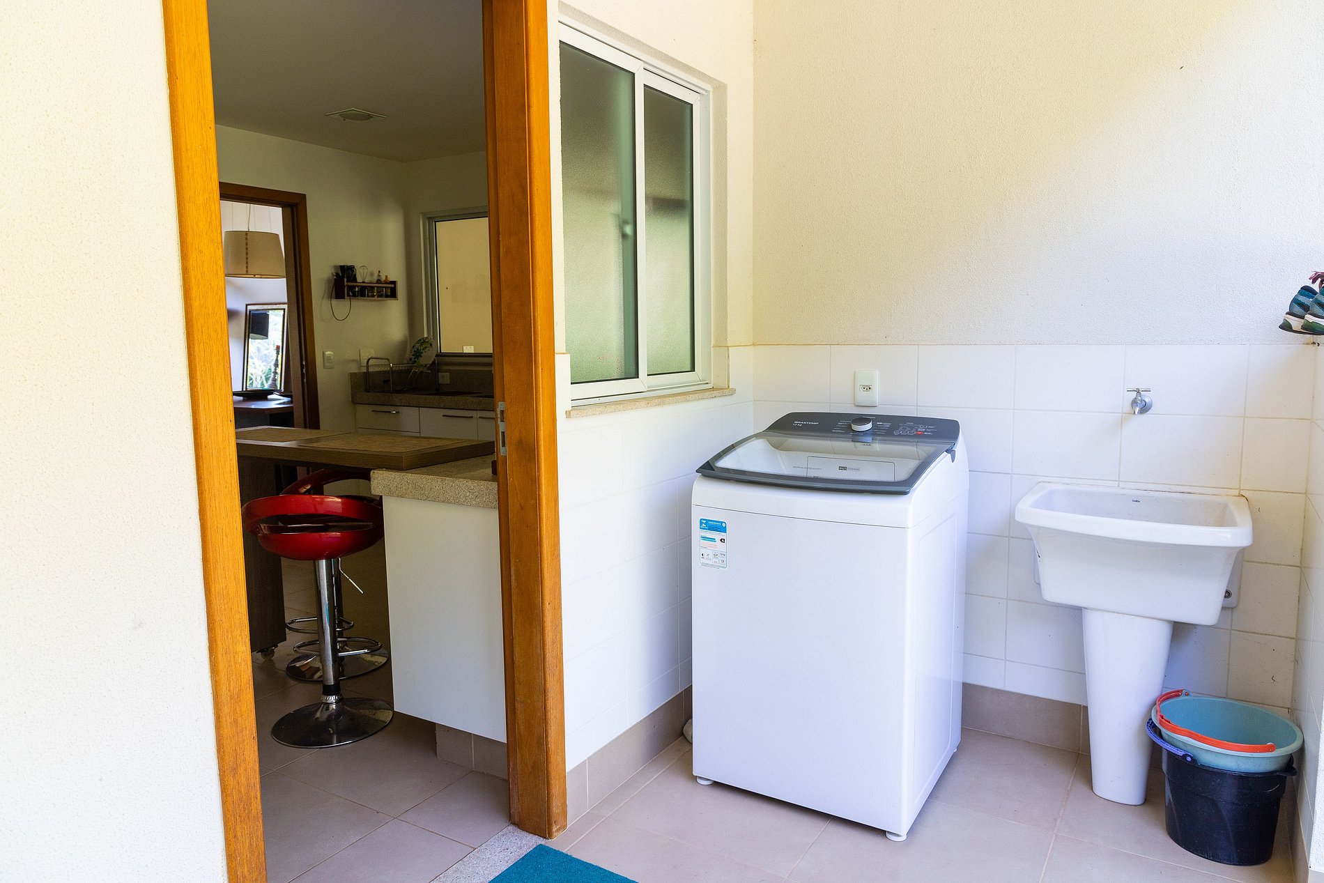 - Área de serviço equipada com máquina de lavar roupas e tanque.