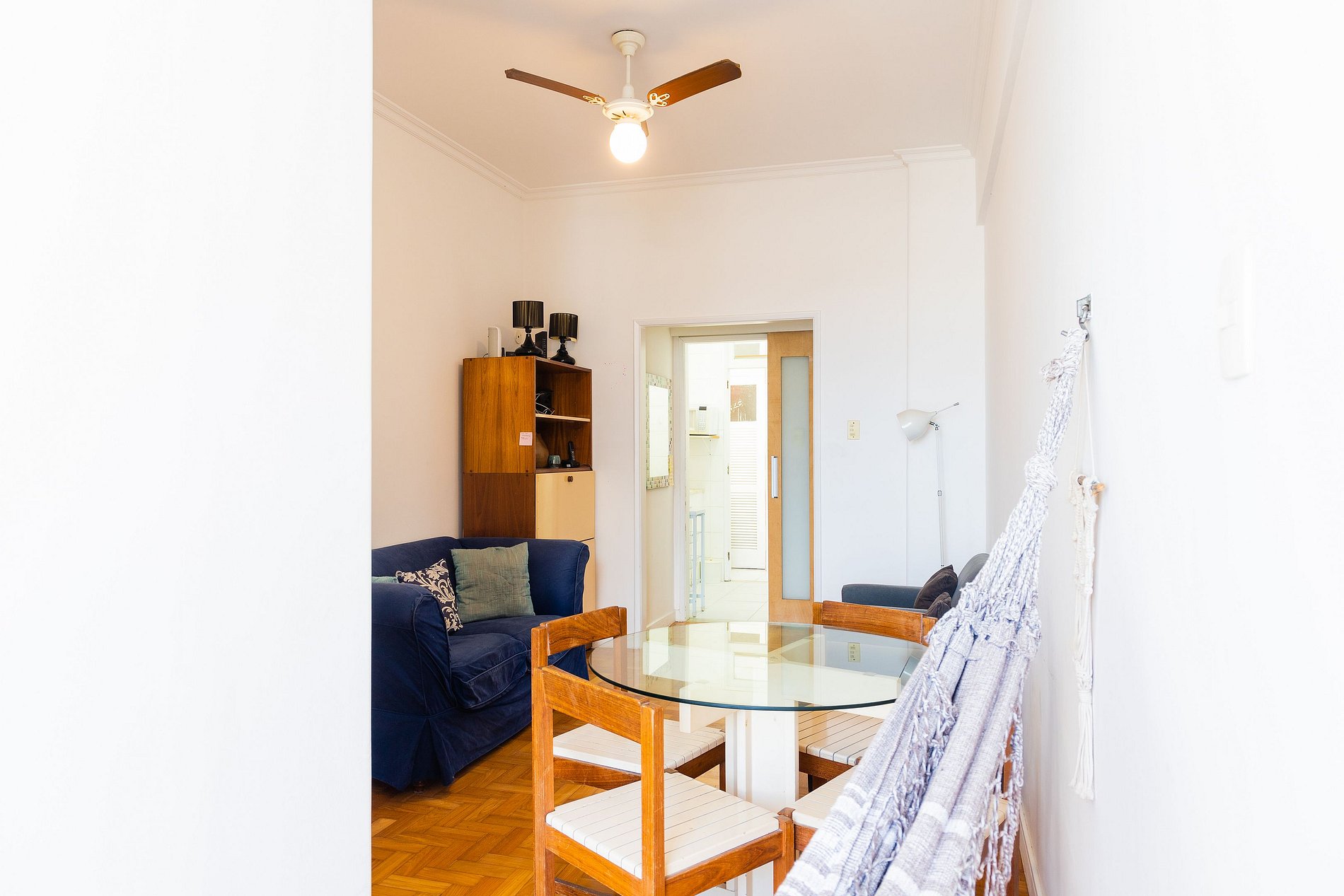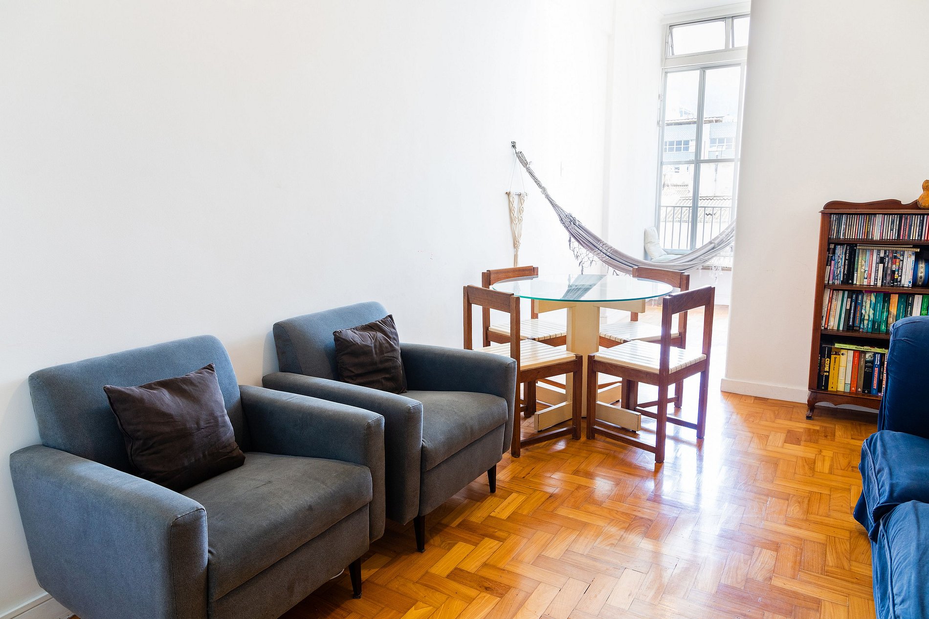 Ao entrar, você é recebido por uma sala arejada, com sofás bem posicionados, uma estante com livros para momentos de tranquilidade, e uma rede irresistível que convida ao descanso.