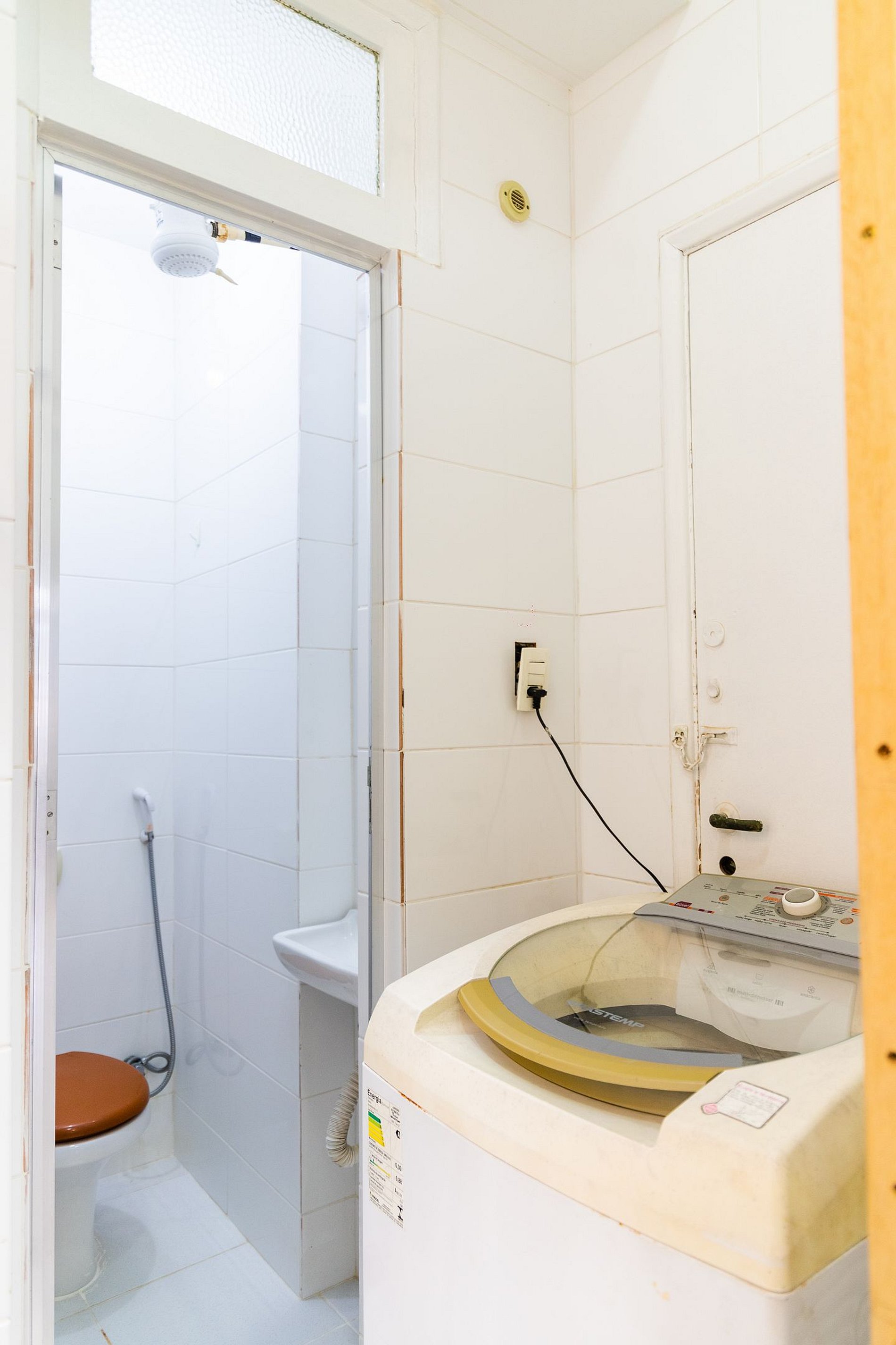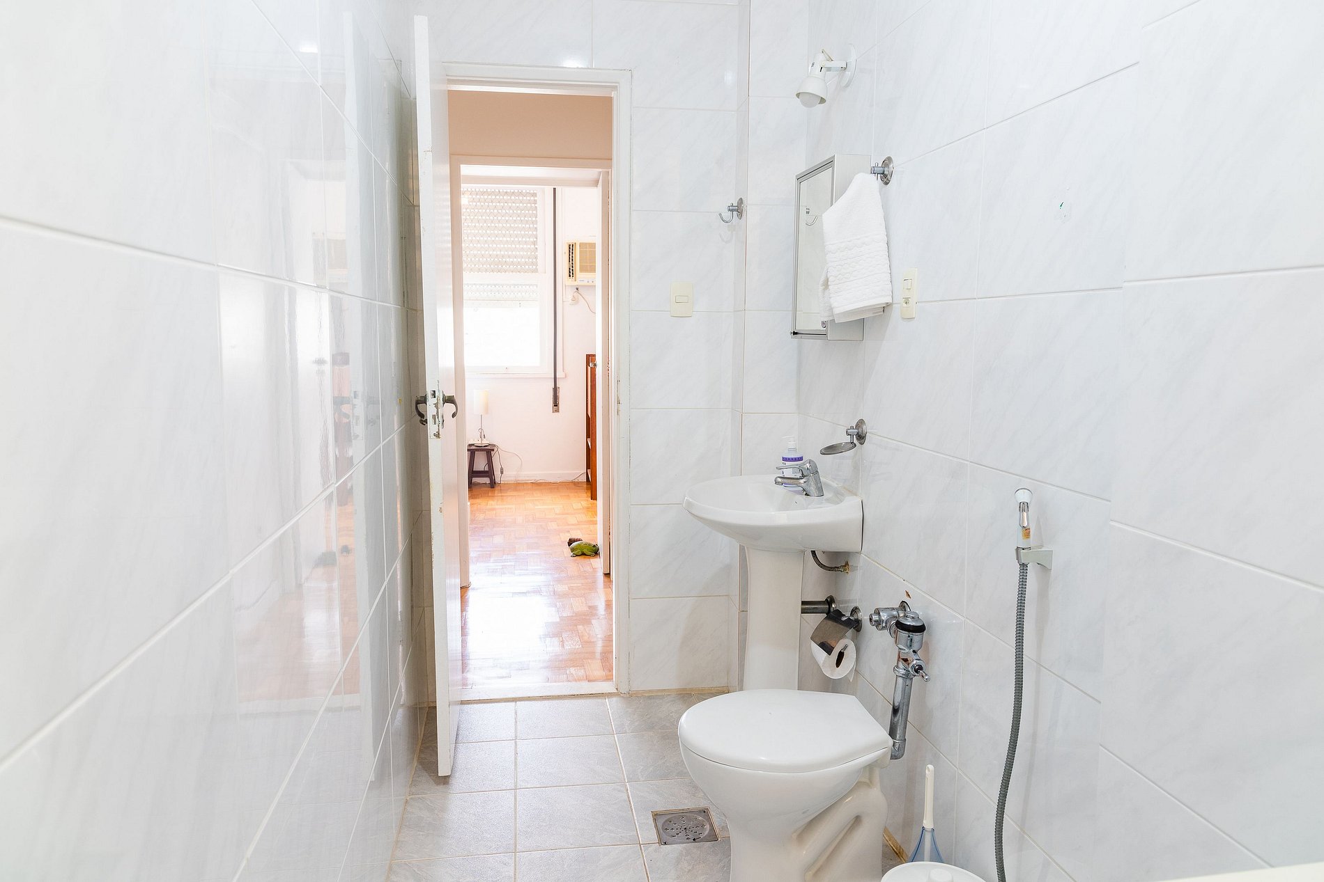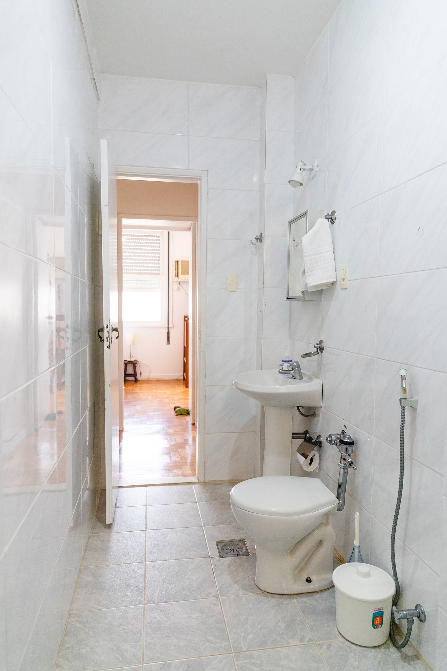 O banheiro principal, localizado em frente ao quarto, é amplo e remete ao charme dos apartamentos antigos do Rio, todo em azulejos clássicos. Além disso, há um lavabo, oferecendo ainda mais conveniência para sua estadia.