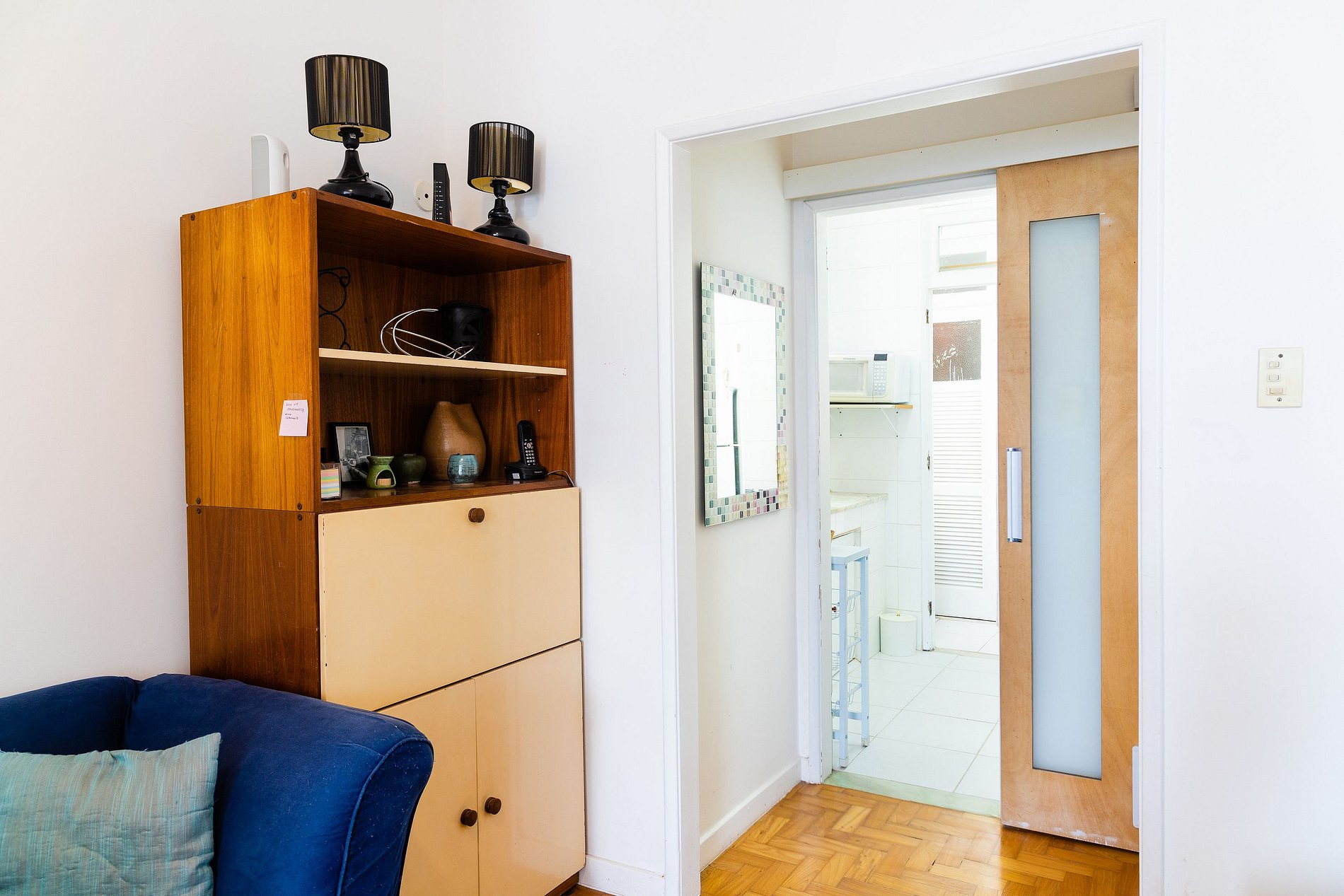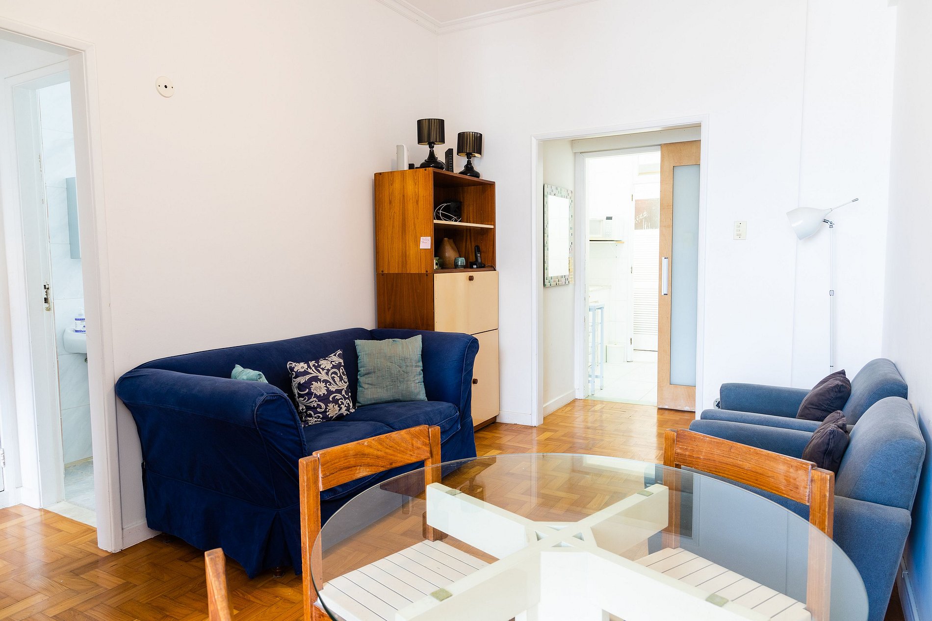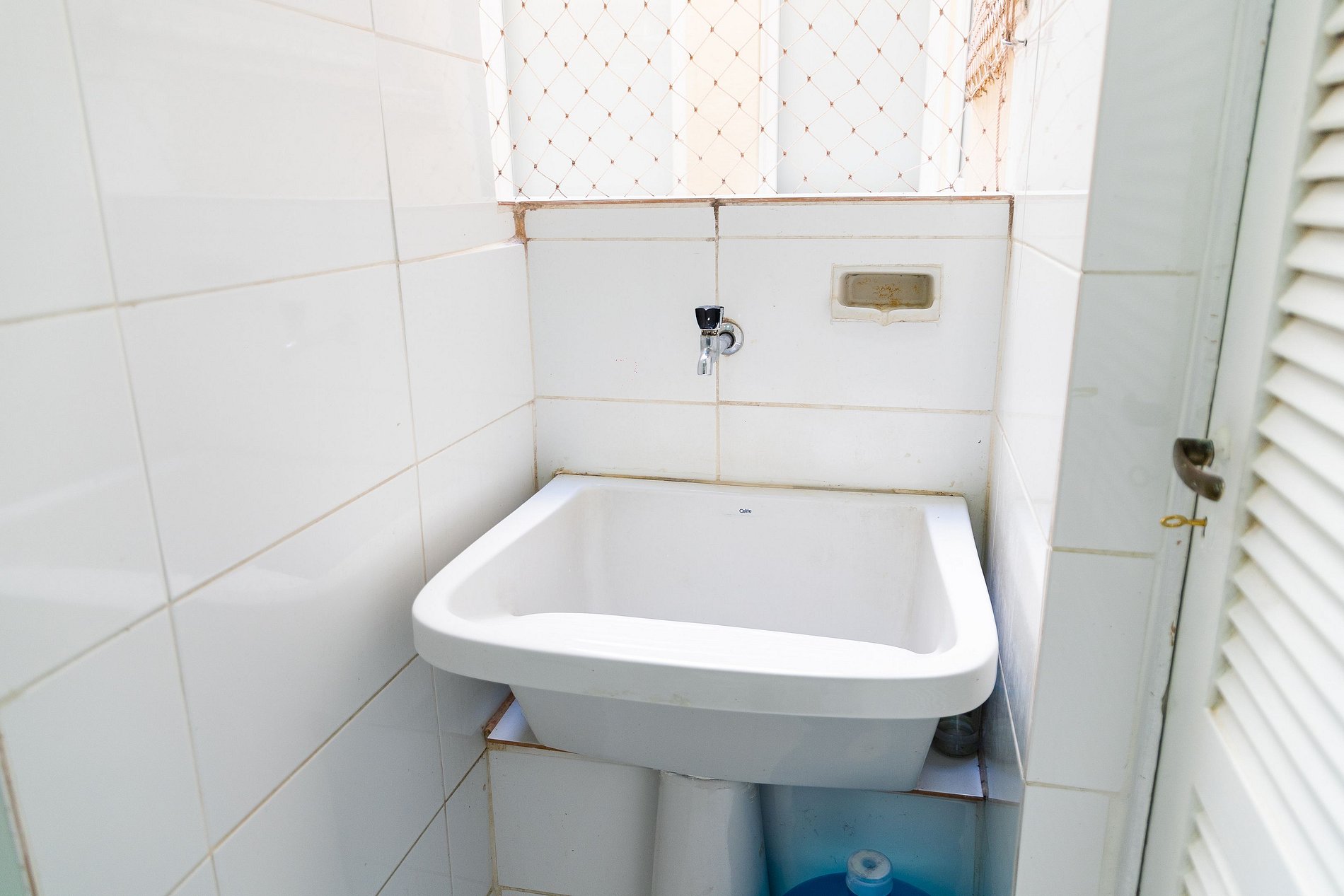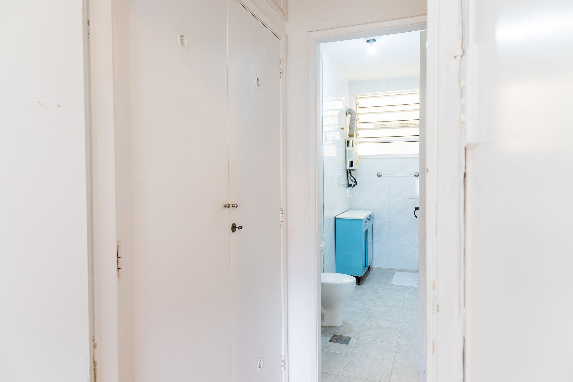 O banheiro principal, localizado em frente ao quarto, é amplo e remete ao charme dos apartamentos antigos do Rio, todo em azulejos clássicos. Além disso, há um lavabo, oferecendo ainda mais conveniência para sua estadia.