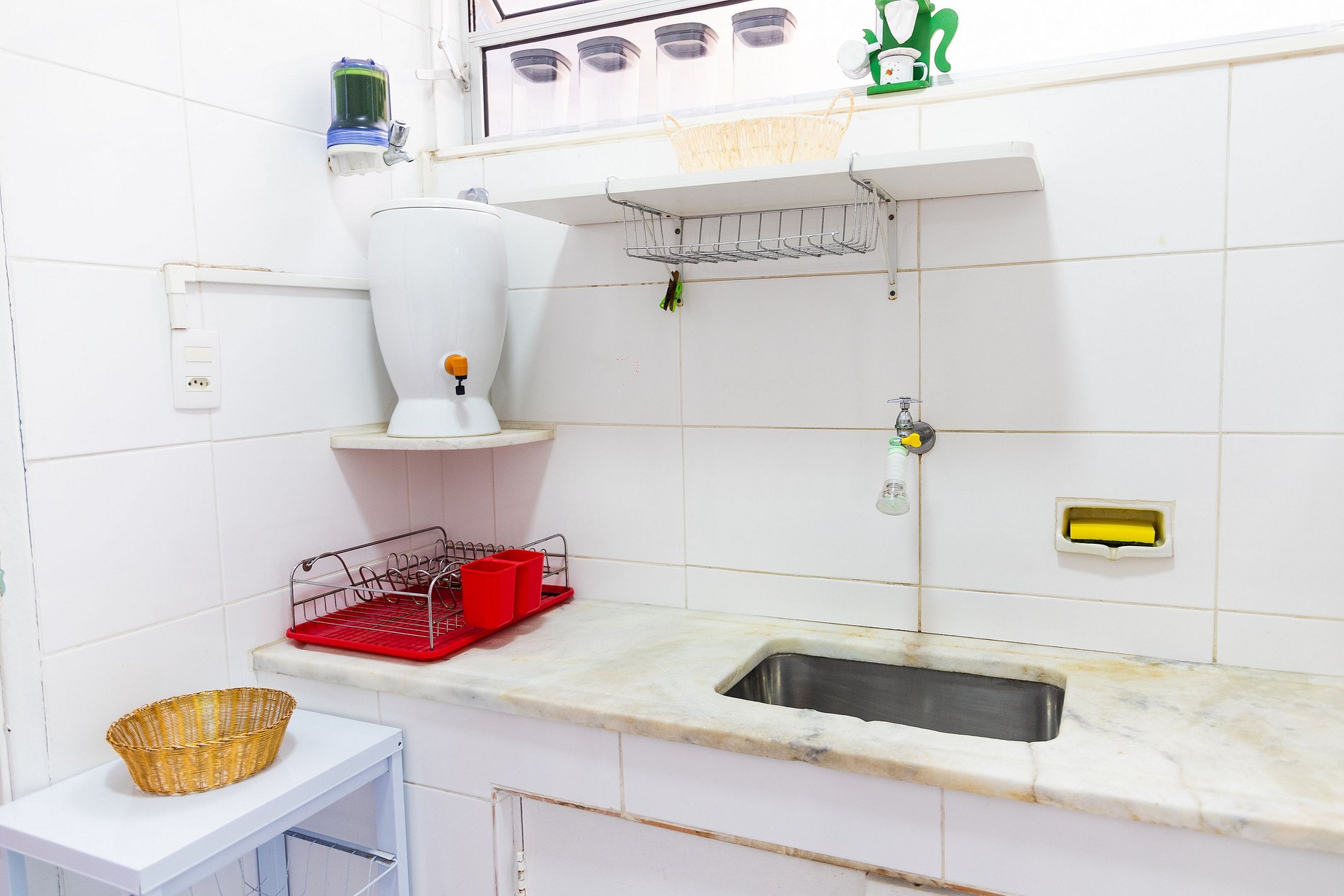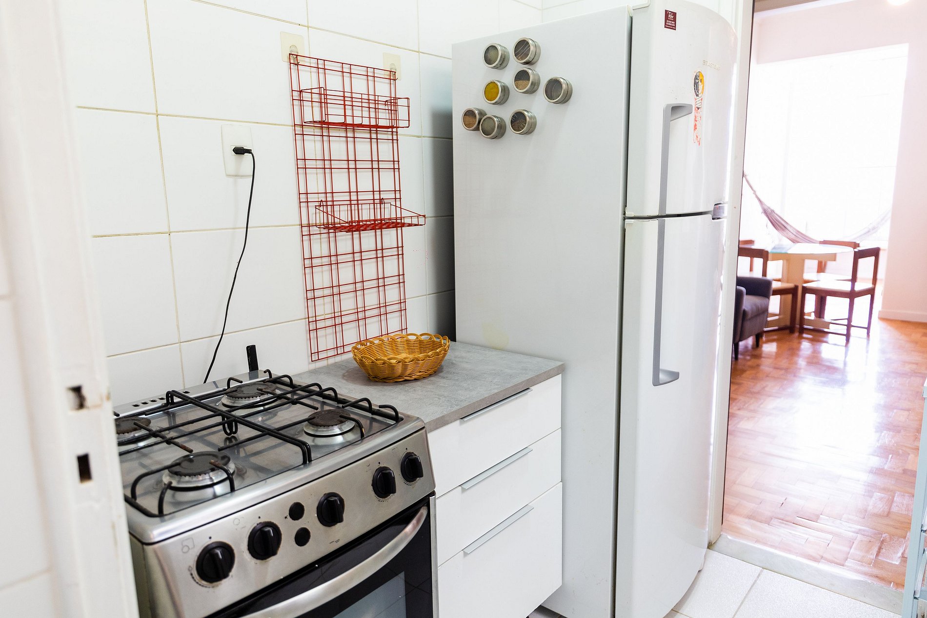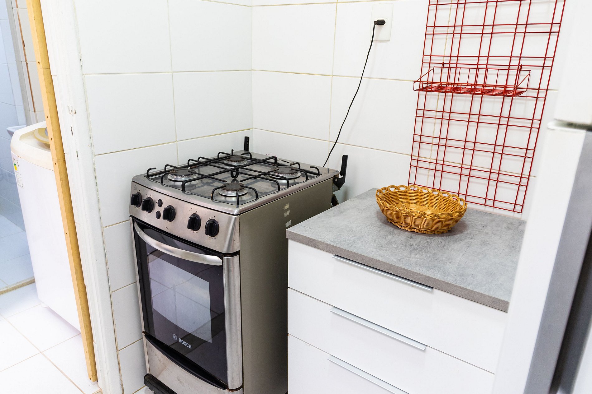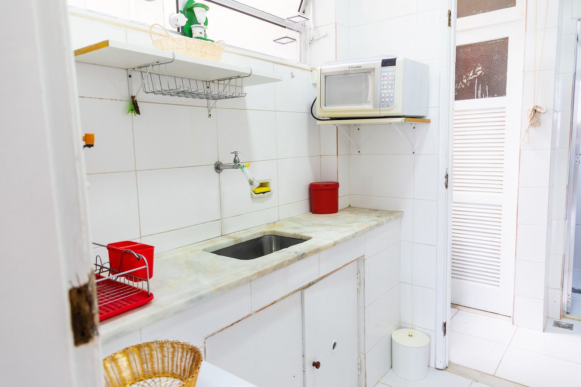 A cozinha, embora compacta, está bem equipada com utensílios e eletrodomésticos básicos para que você possa preparar suas refeições no apartamento, aproveitando o clima aconchegante do espaço.