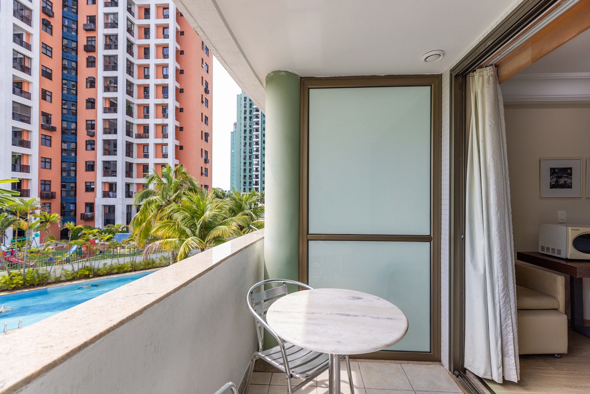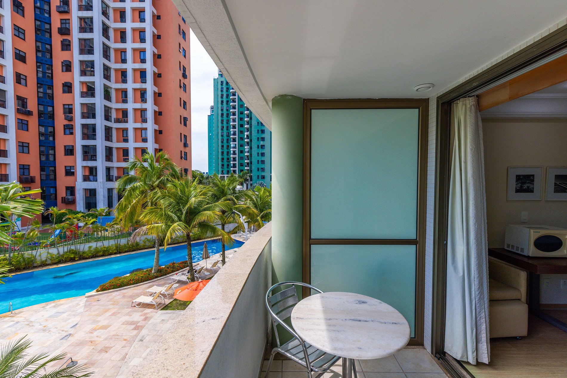 Falando especificamente deste apartamento que estamos disponibilizando, possui tv a cabo (Claro), internet, ar condicionado com controle de temperatura, varanda que dá vista para a piscina e mesa para trabalho.