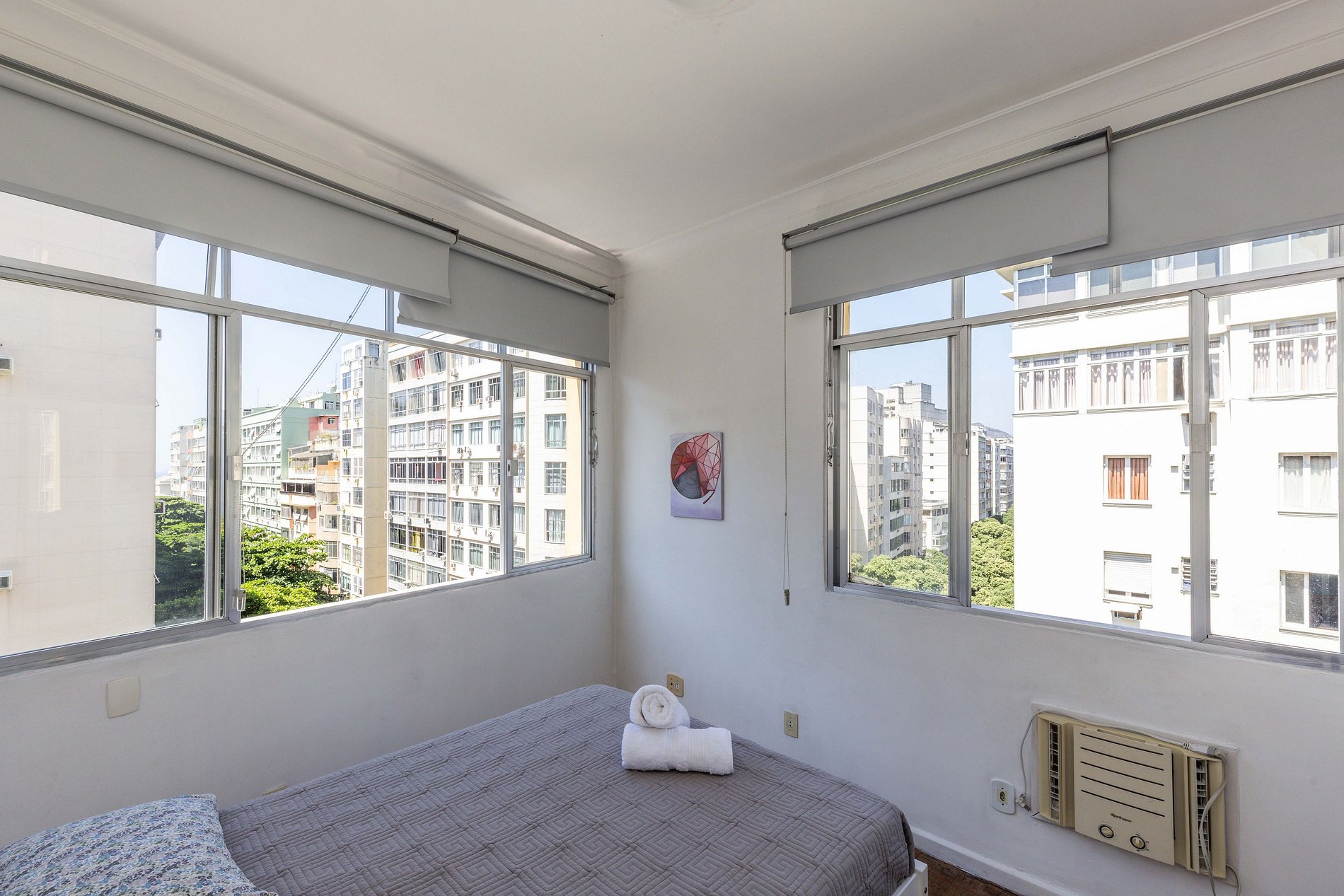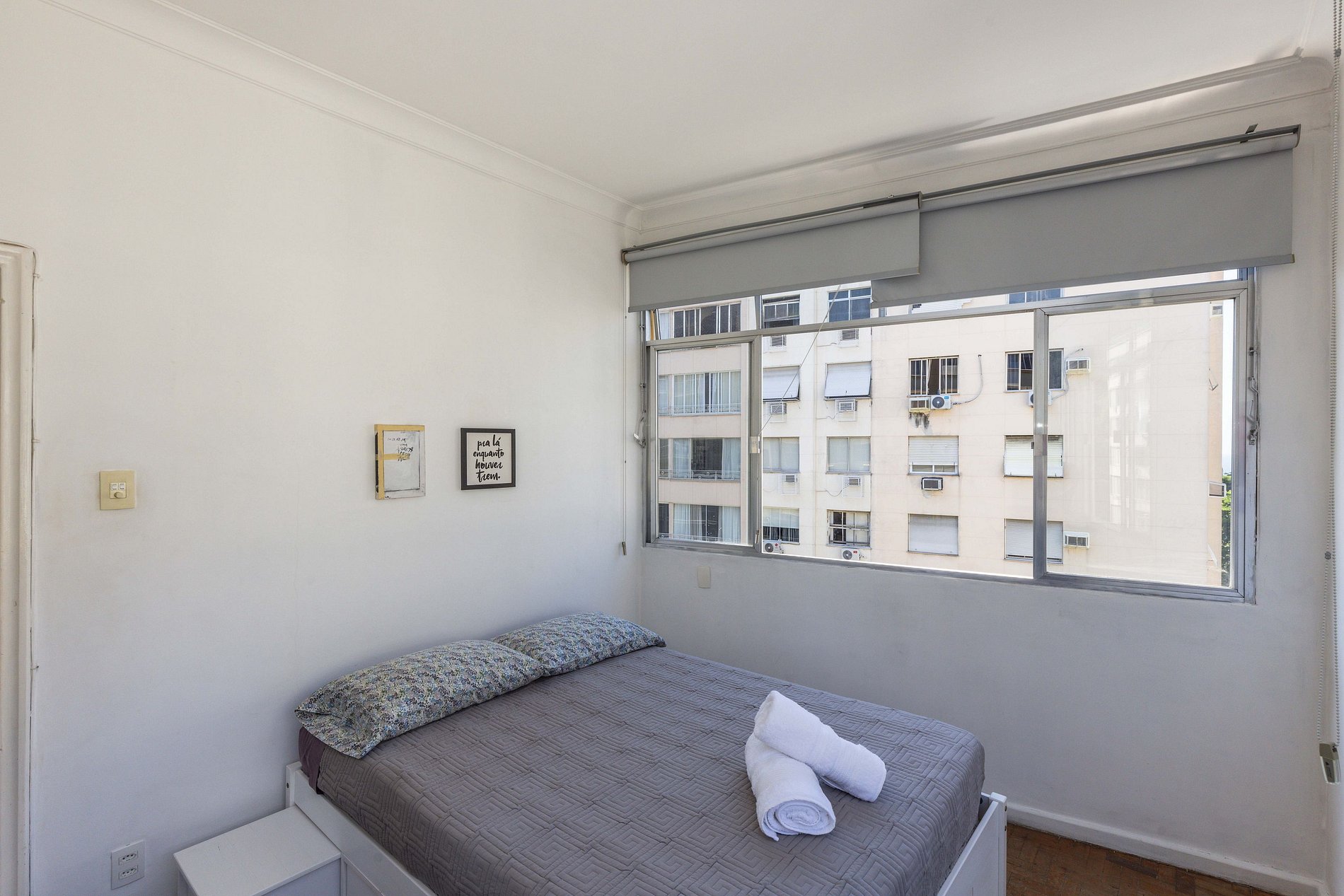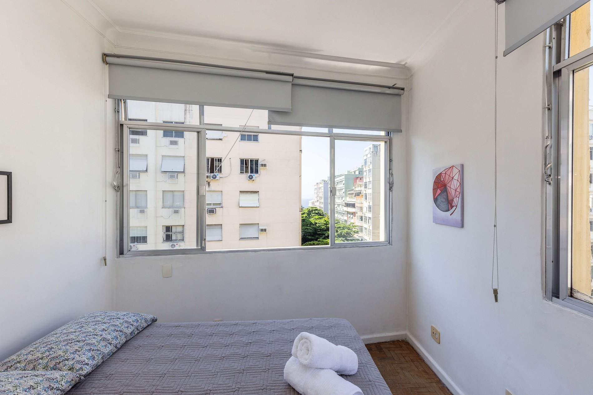 Ao final do corredor, chega-se ao encantador quarto, que oferece uma vista privilegiada: pela janela, é possível contemplar tanto a exuberante reserva de Mata Atlântica de Copacabana quanto o deslumbrante mar azul ao fundo. Com uma confortável cama de casal, persianas blackout que bloqueiam totalmente a passagem de luz para um descanso perfeito e climatização proporcionada por um ar-condicionado de janela, este espaço é o refúgio ideal para recarregar as energias.