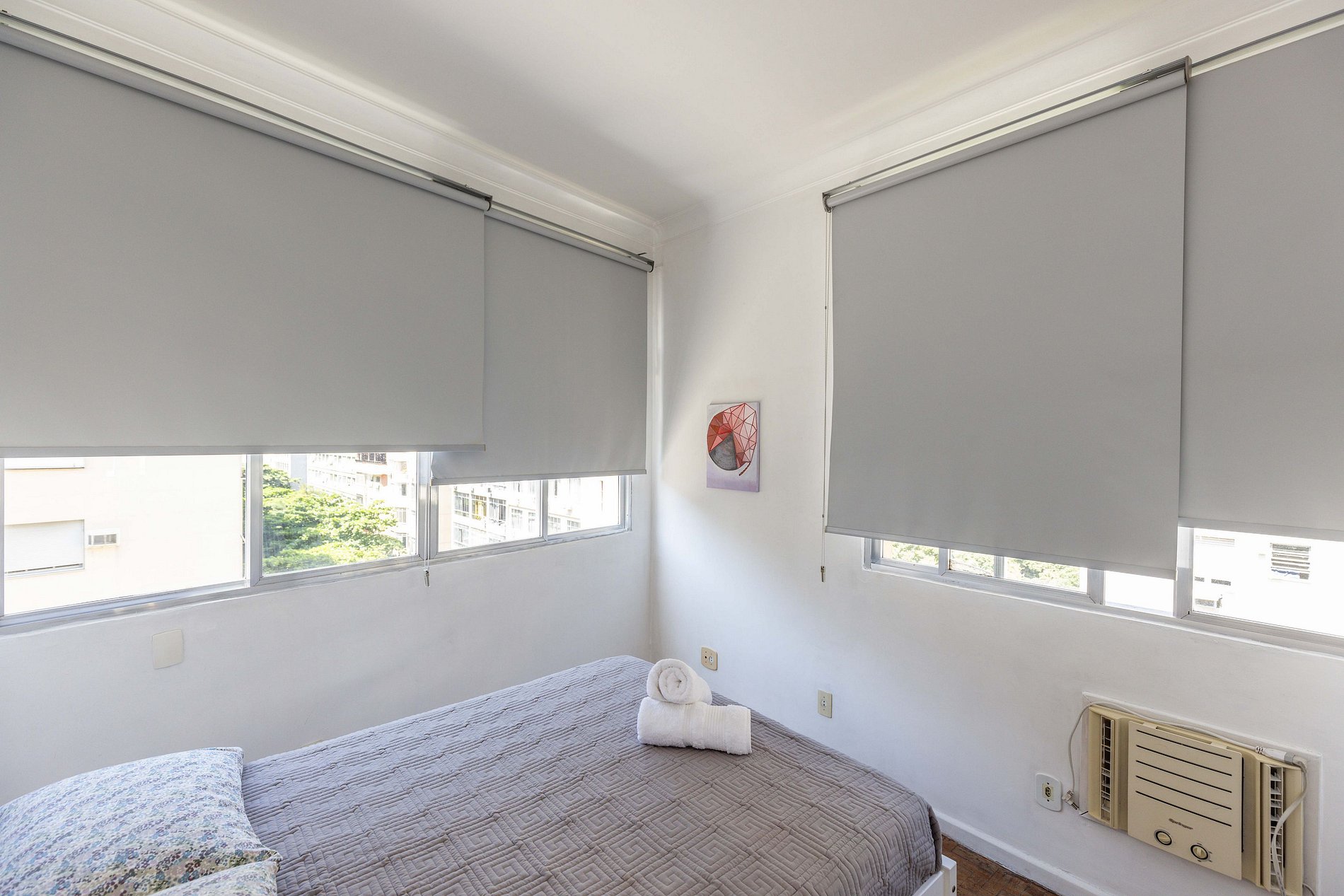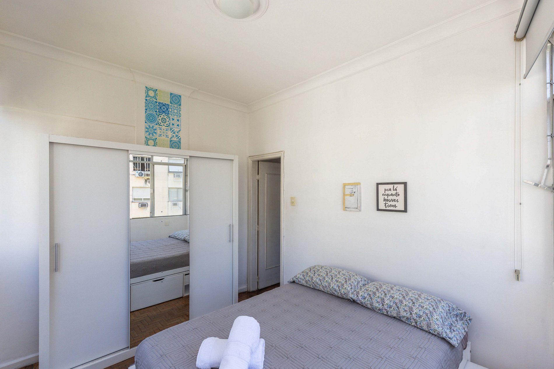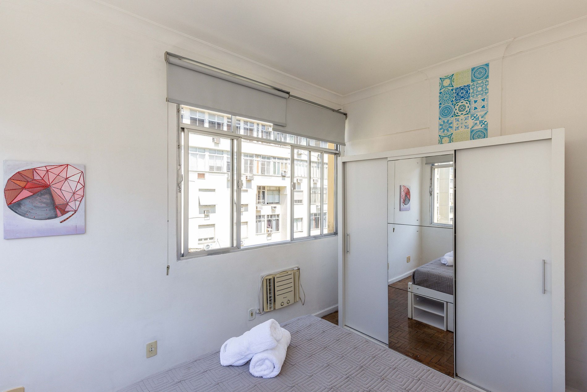 Ao final do corredor, chega-se ao encantador quarto, que oferece uma vista privilegiada: pela janela, é possível contemplar tanto a exuberante reserva de Mata Atlântica de Copacabana quanto o deslumbrante mar azul ao fundo. Com uma confortável cama de casal, persianas blackout que bloqueiam totalmente a passagem de luz para um descanso perfeito e climatização proporcionada por um ar-condicionado de janela, este espaço é o refúgio ideal para recarregar as energias.