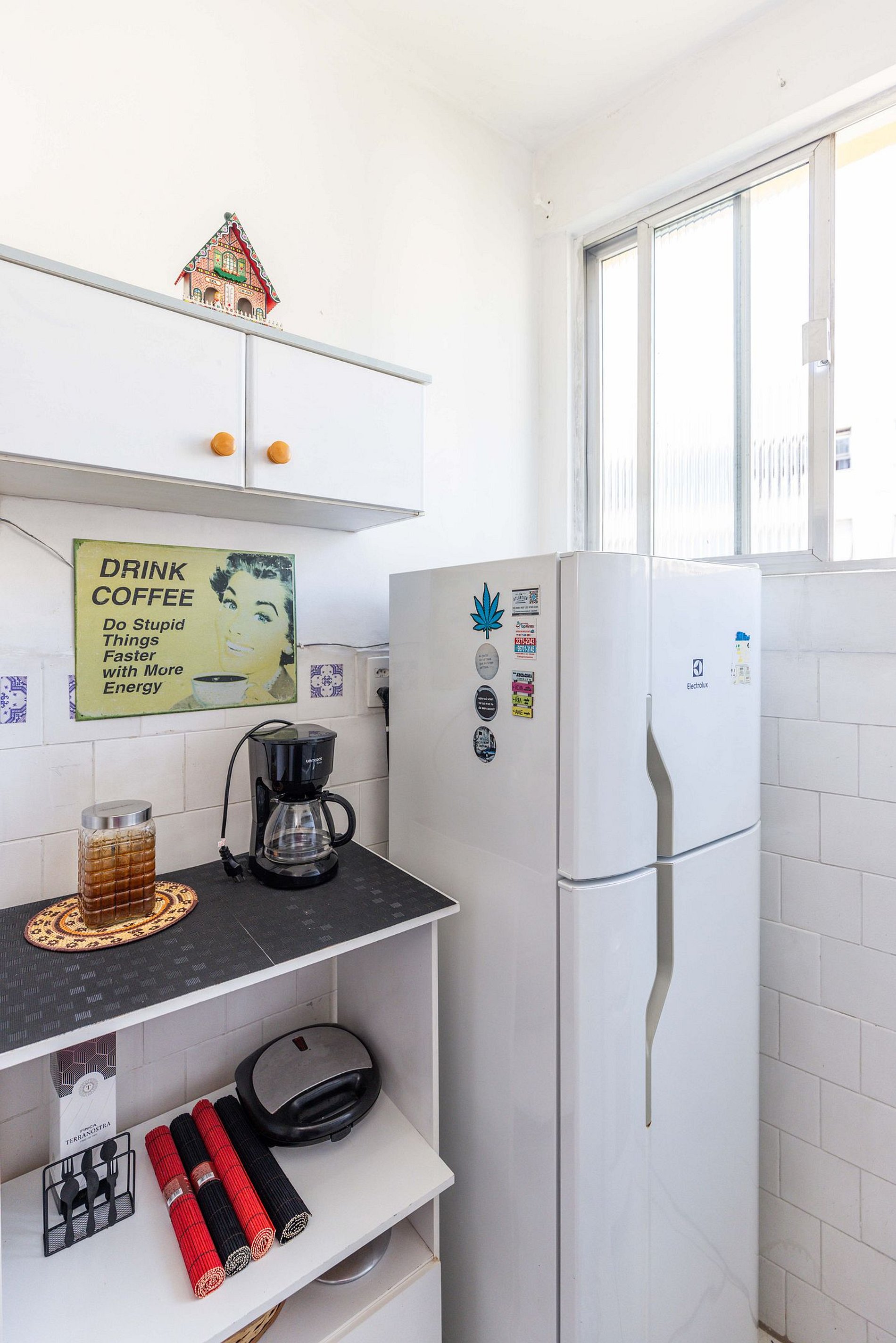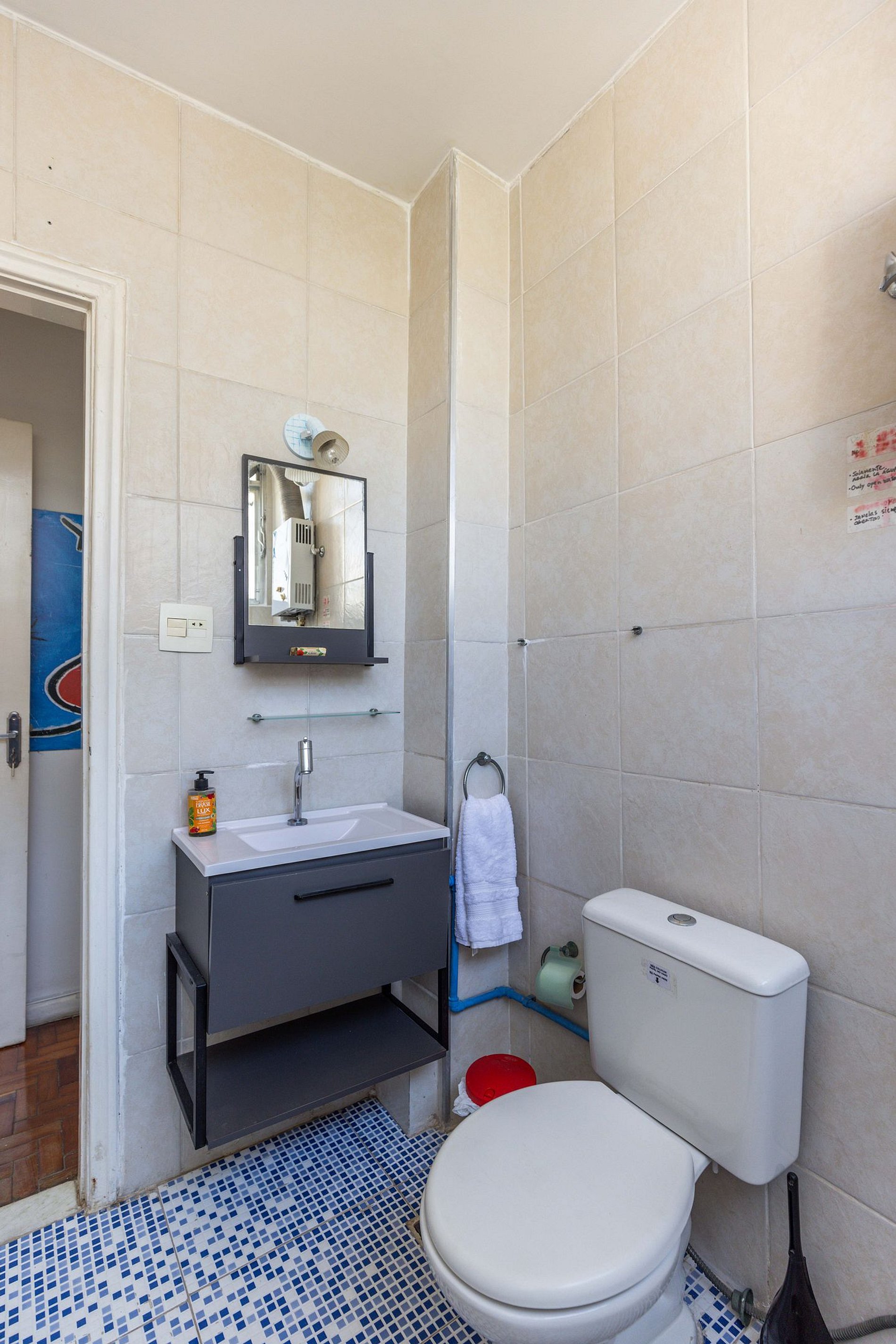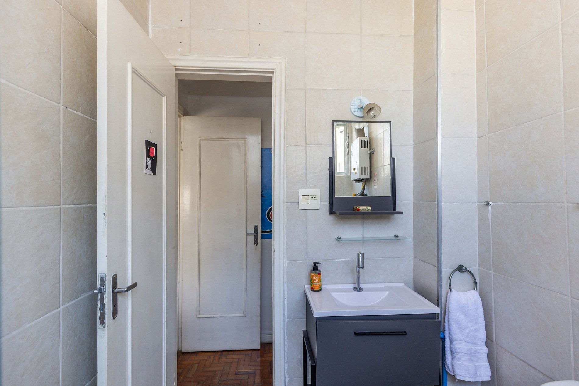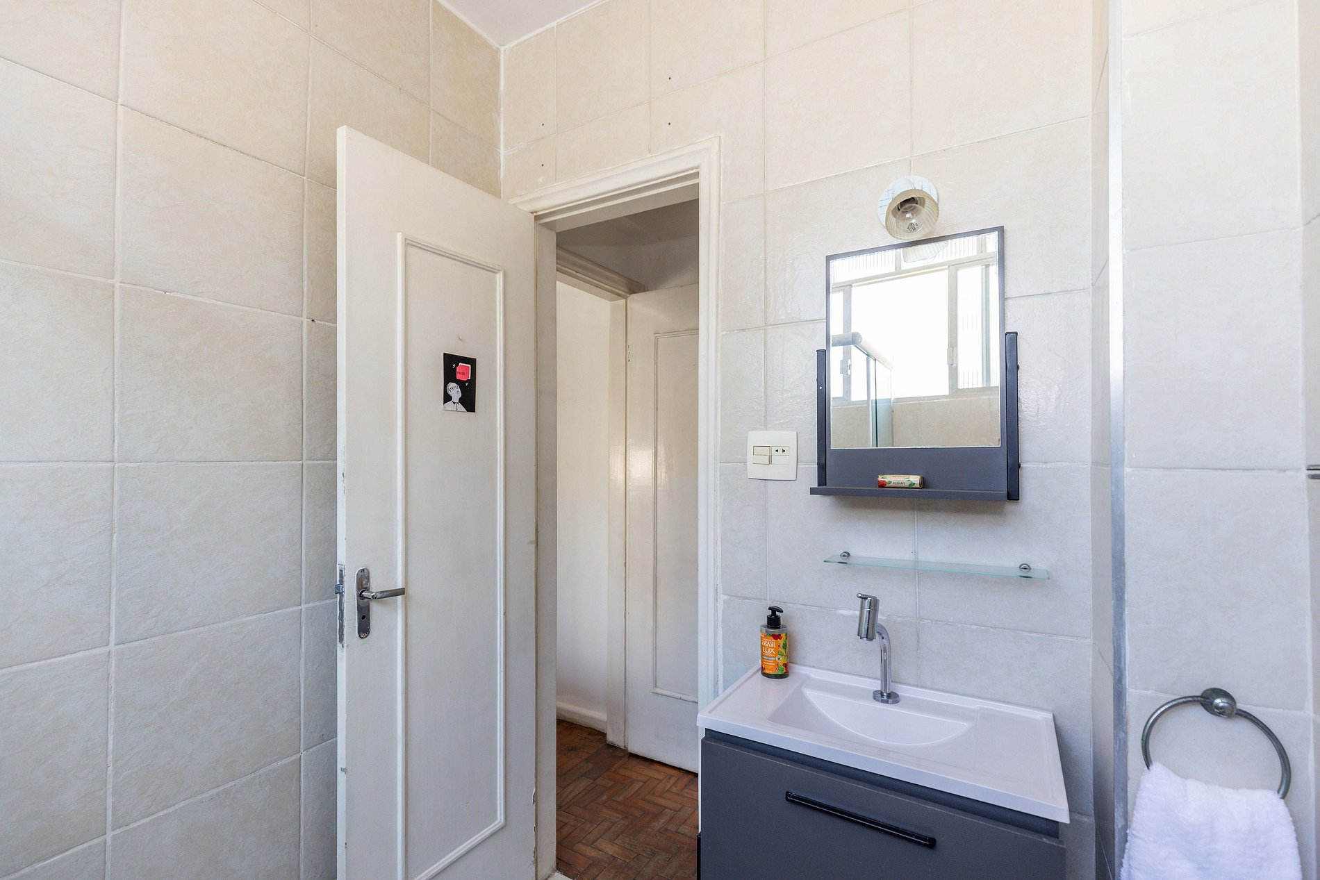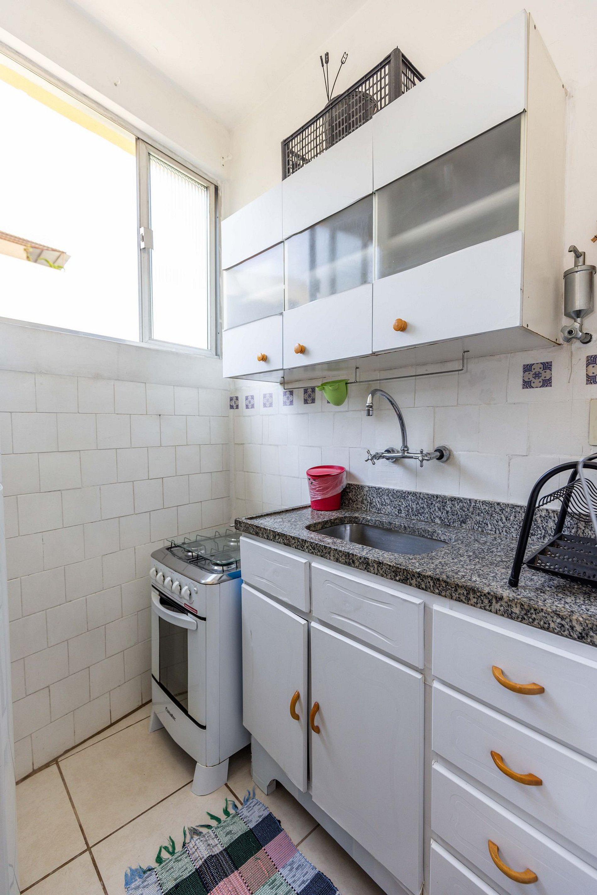 Seguindo pelo corredor, encontra-se uma cozinha compacta, mas muito bem planejada, equipada com os itens básicos necessários para que você possa preparar suas refeições com facilidade e conforto. Logo após, o banheiro se revela com um arranjo inteligente, super arejado e pensado para proporcionar praticidade no dia a dia.