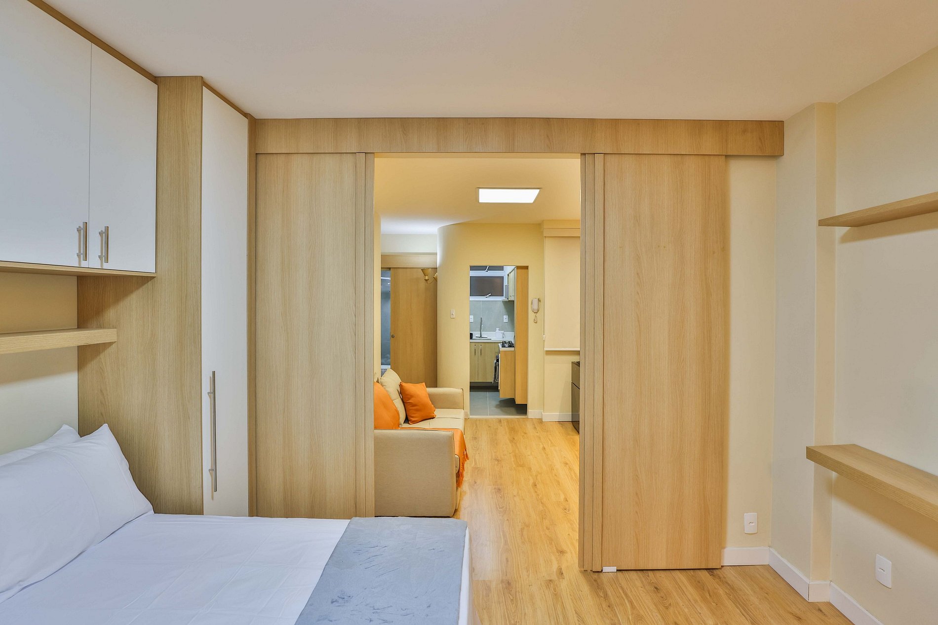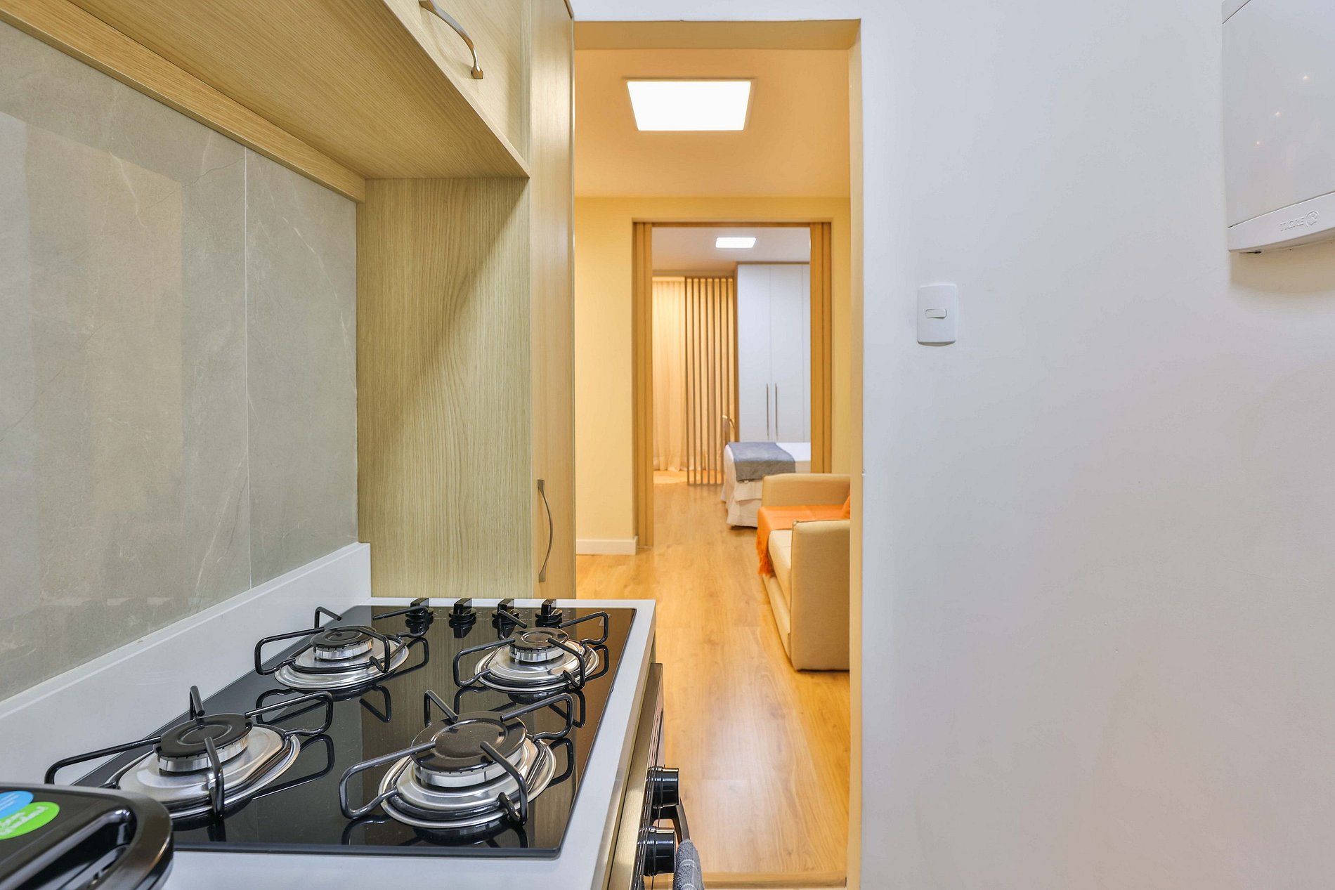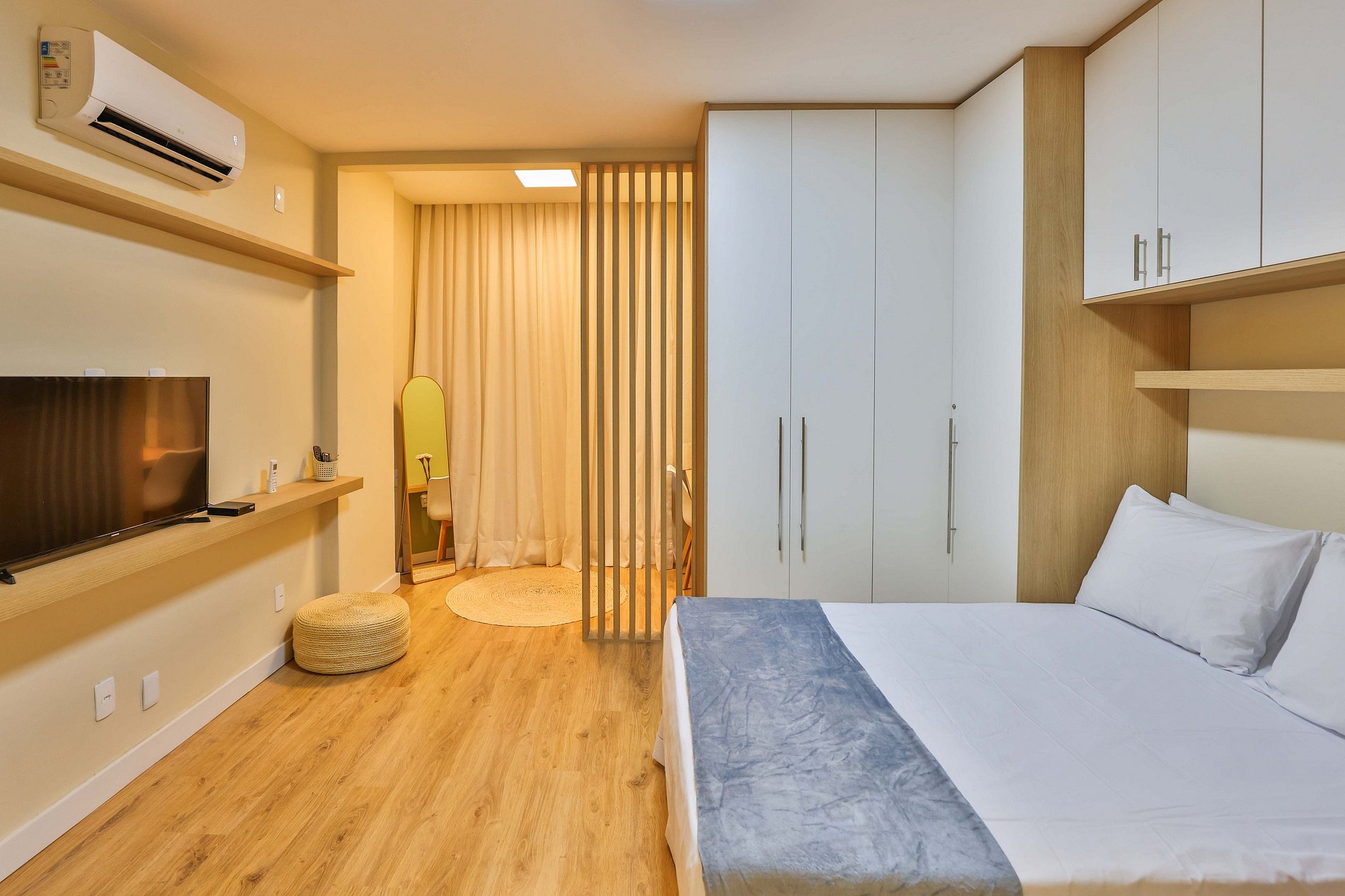 Ao entrar, você será recebido por uma elegante sala de estar, equipada com uma SmartTV de 40 polegadas com acesso à TV a cabo, ar-condicionado e um confortável sofá-cama, acomodando até dois hóspedes. O grande destaque deste ambiente é o sofisticado acabamento de madeira que envolve uma das paredes e esconde uma charmosa porta de correr, proporcionando privacidade ao quarto.