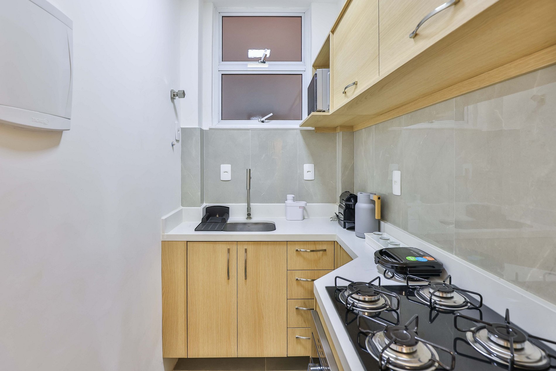 A cozinha, apesar de compacta, foi inteligentemente planejada para otimizar o espaço e oferecer tudo o que você precisa para preparar suas refeições. Equipada com utensílios básicos, ela proporciona praticidade sem comprometer a estética e funcionalidade.