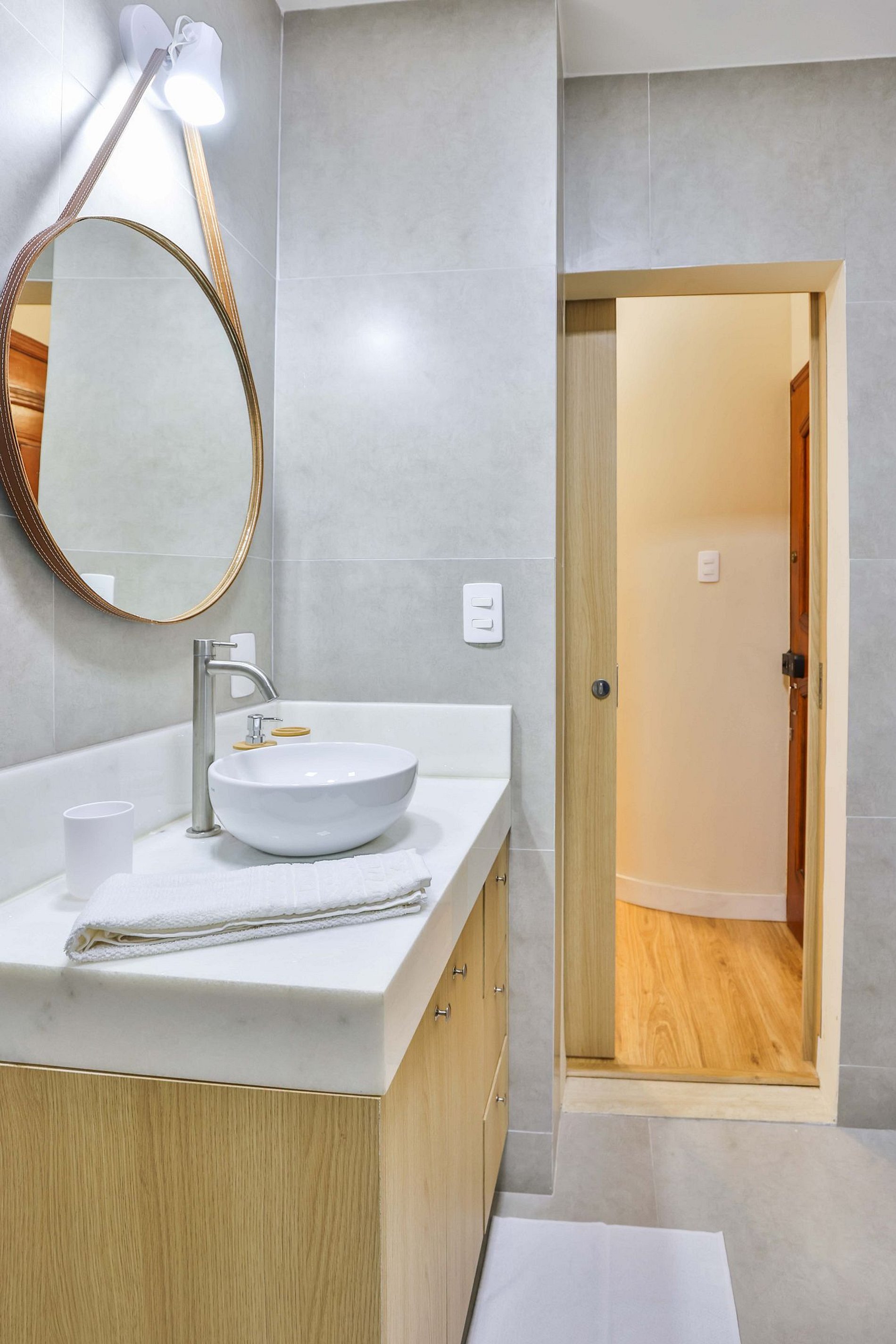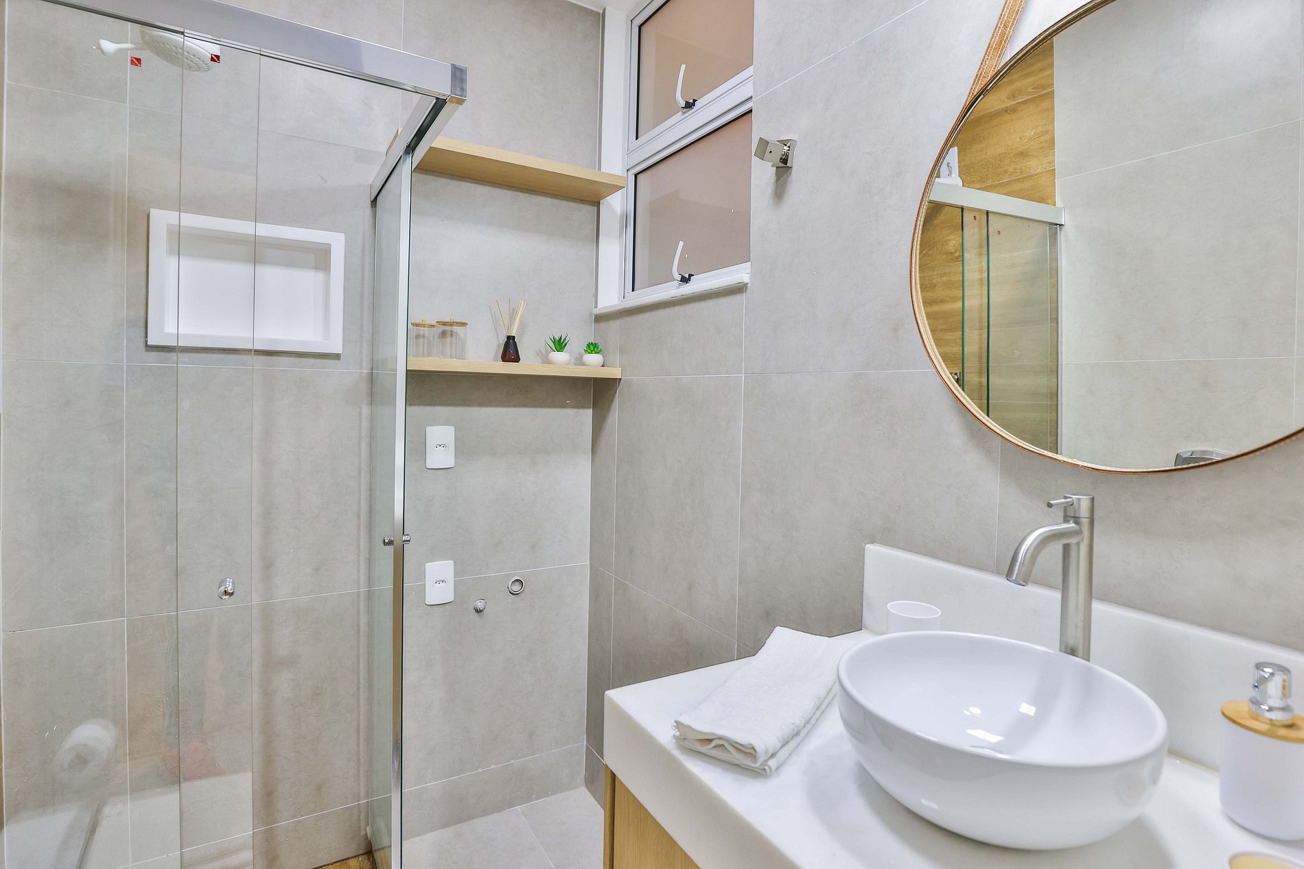 O banheiro, por sua vez, é um ambiente elegante e funcional, projetado para atender às necessidades do hóspede com conforto e estilo.