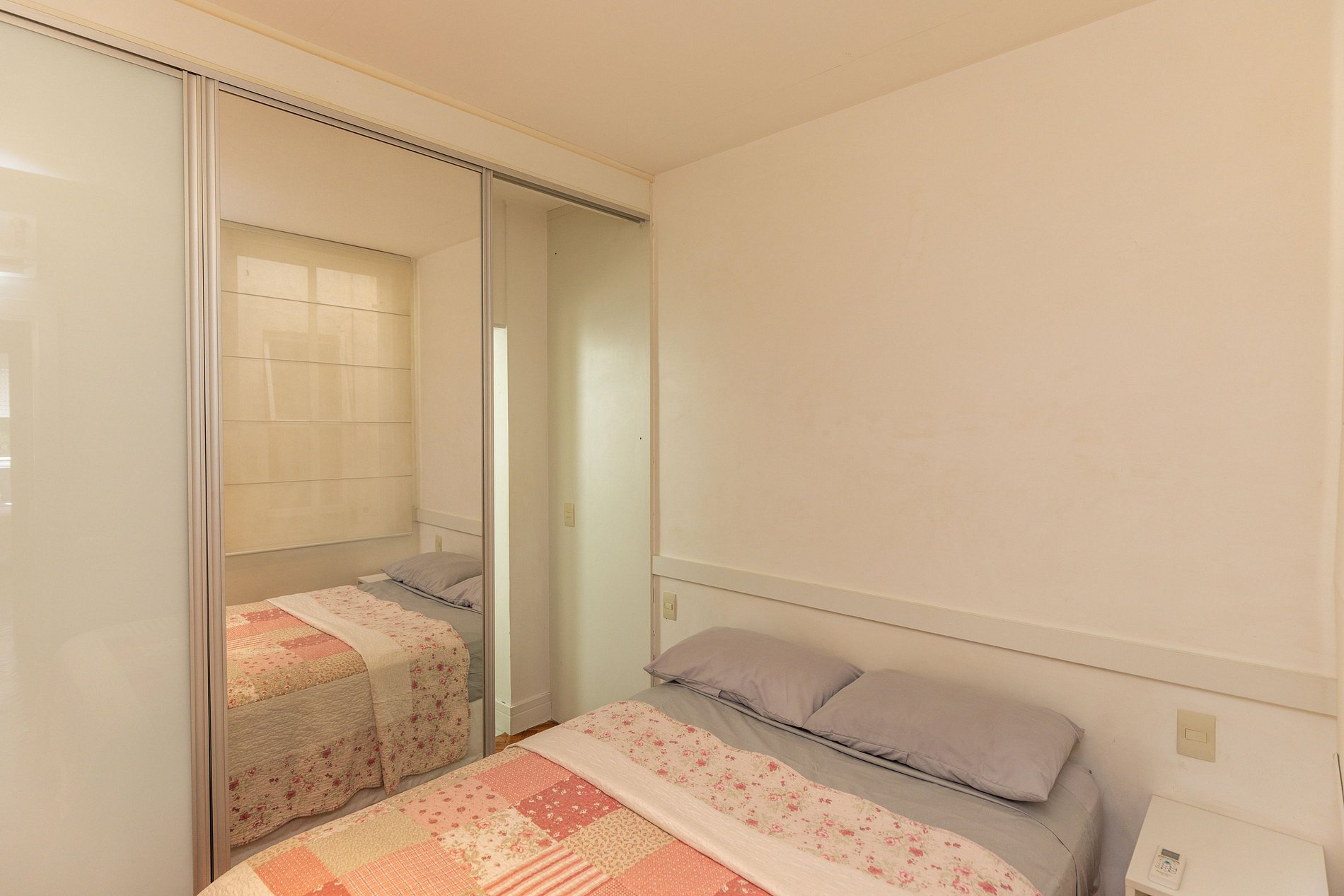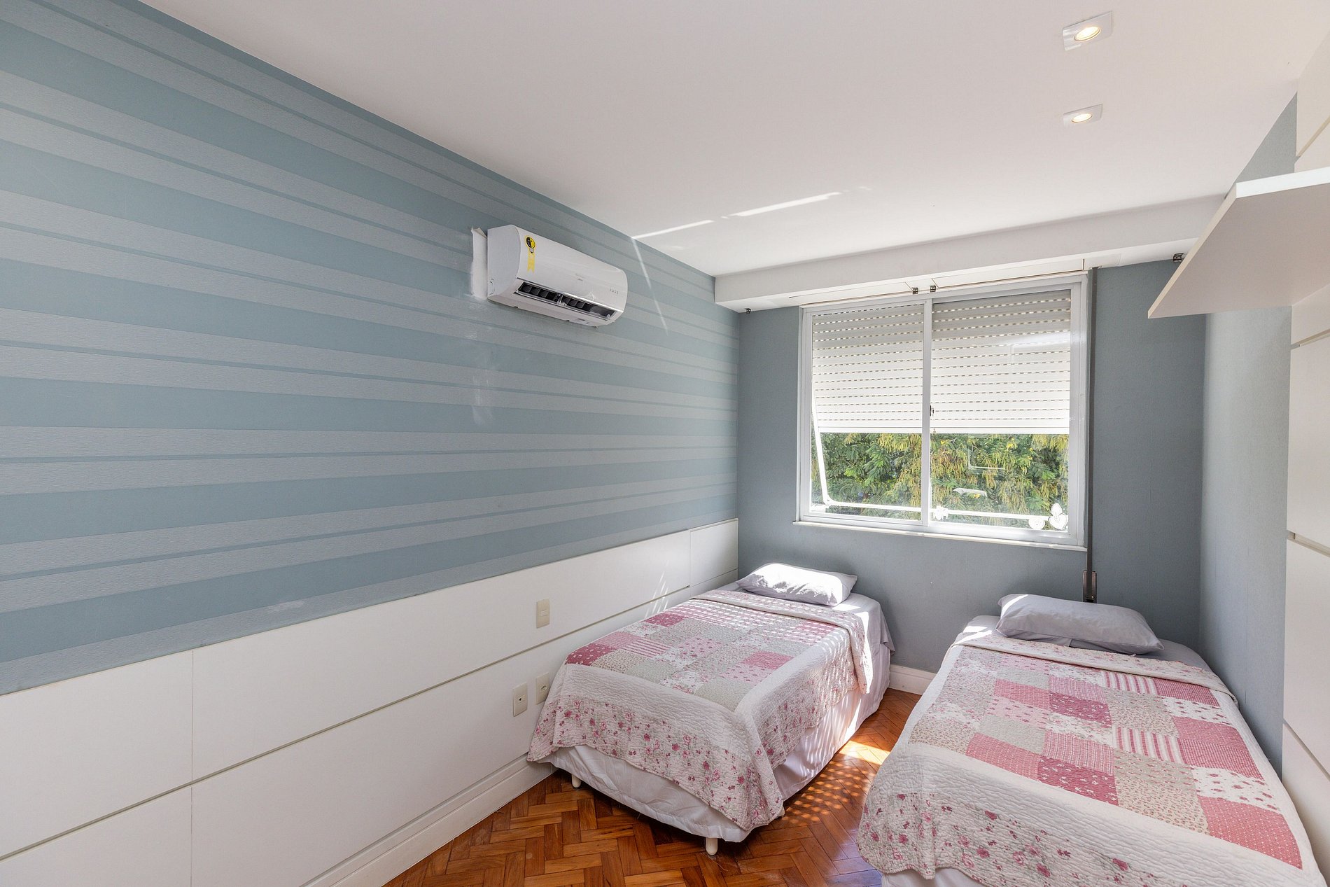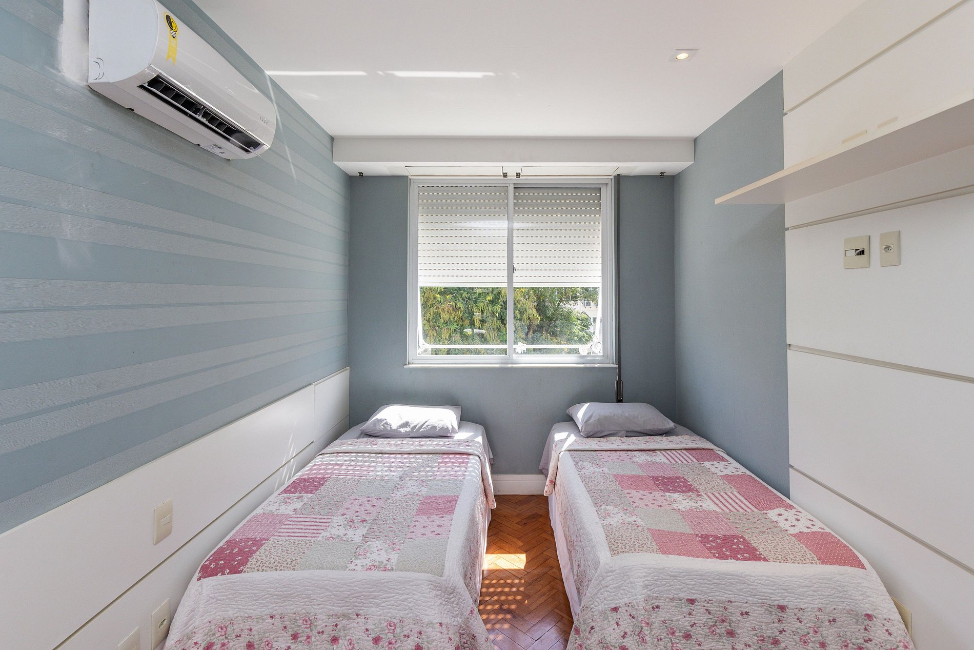 O apartamento acomoda confortavelmente até quatro pessoas. A suíte conta com uma cama de casal e ar-condicionado. O segundo quarto, também com ar-condicionado, possui duas camas de solteiro e é atendido por um banheiro social completo.