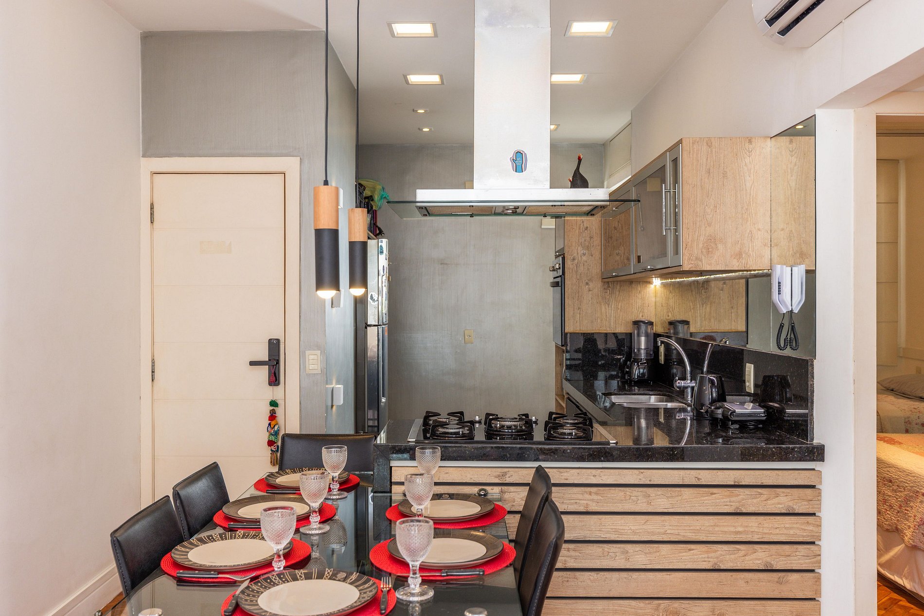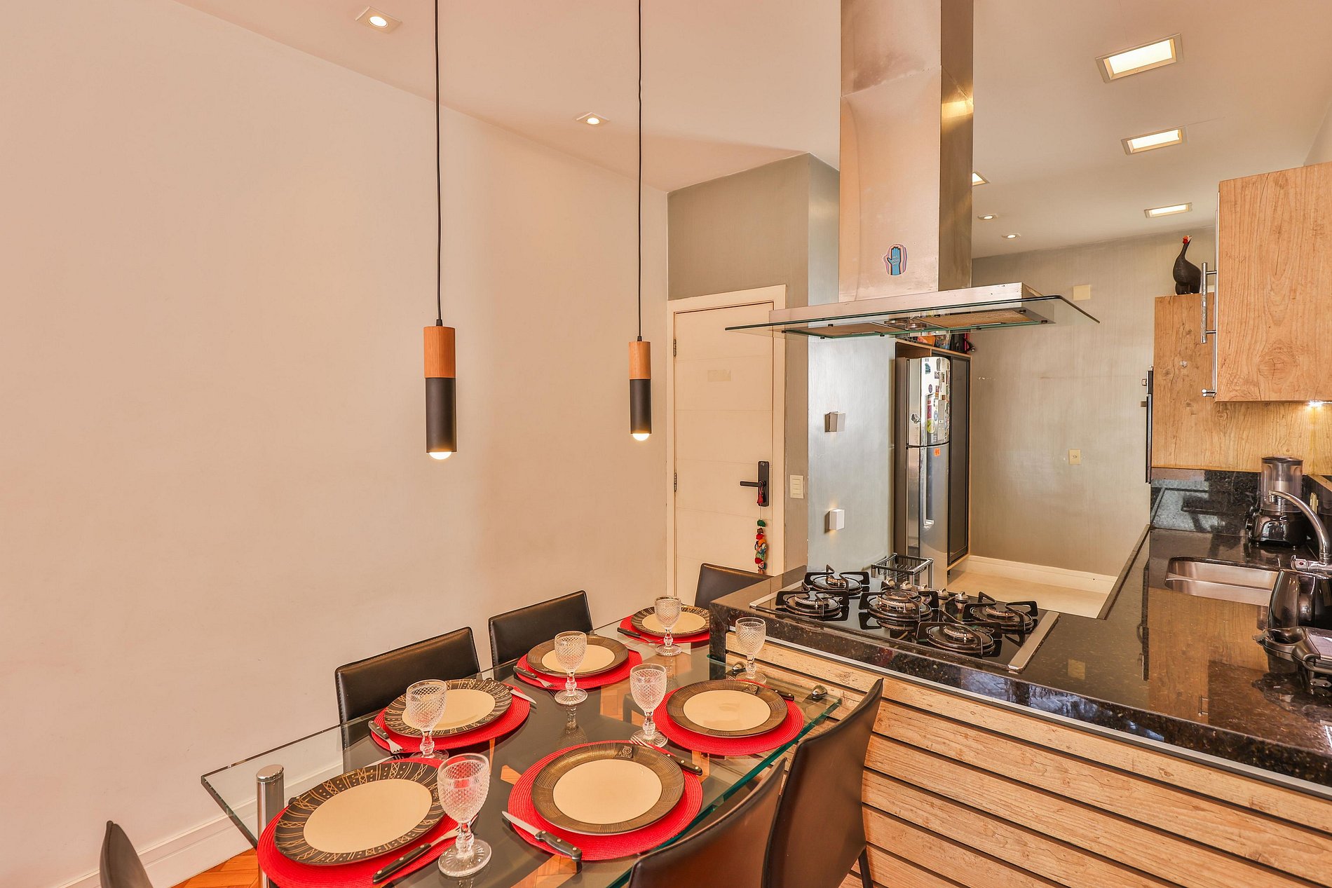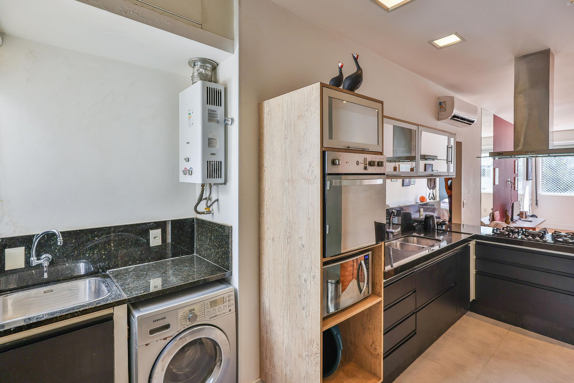 A mesa de jantar delimita bem a transição entre a sala e a cozinha, que é prática e funcional, com armários planejados, eletrodomésticos bem posicionados e todos os utensílios básicos para preparar e fazer suas refeições. Nos fundos, uma pequena área de serviço com máquina lava e seca e varal de chão está disponível para uso dos hóspedes.