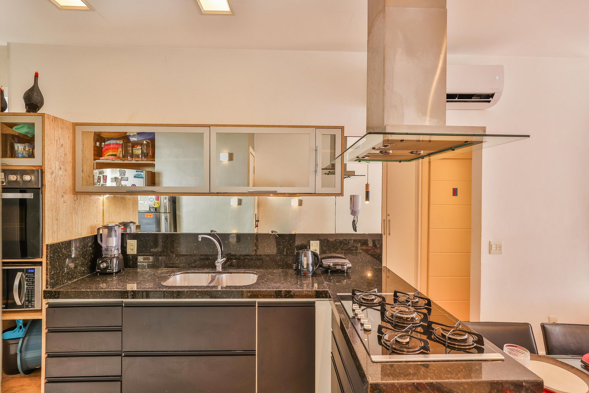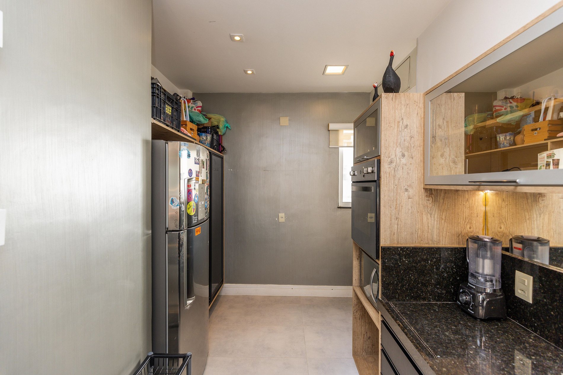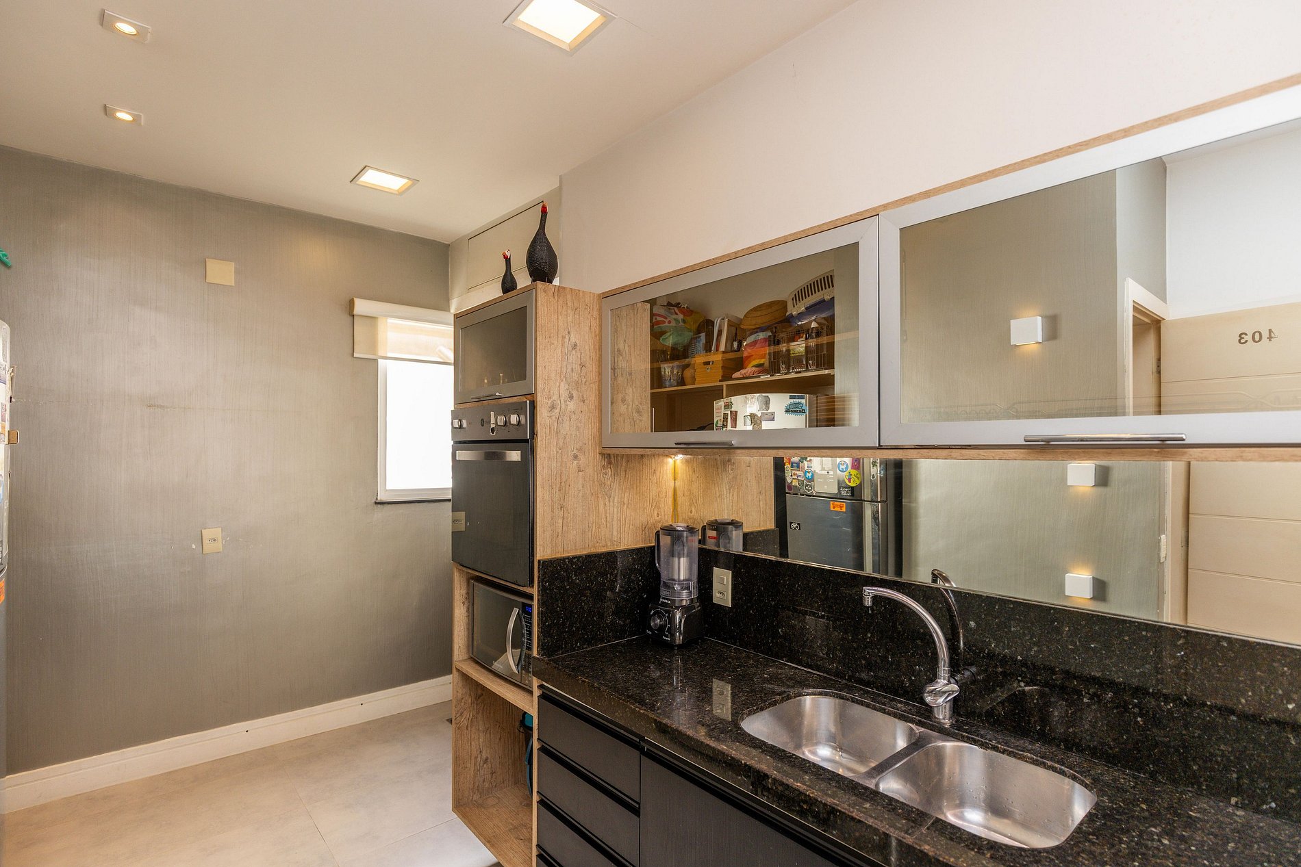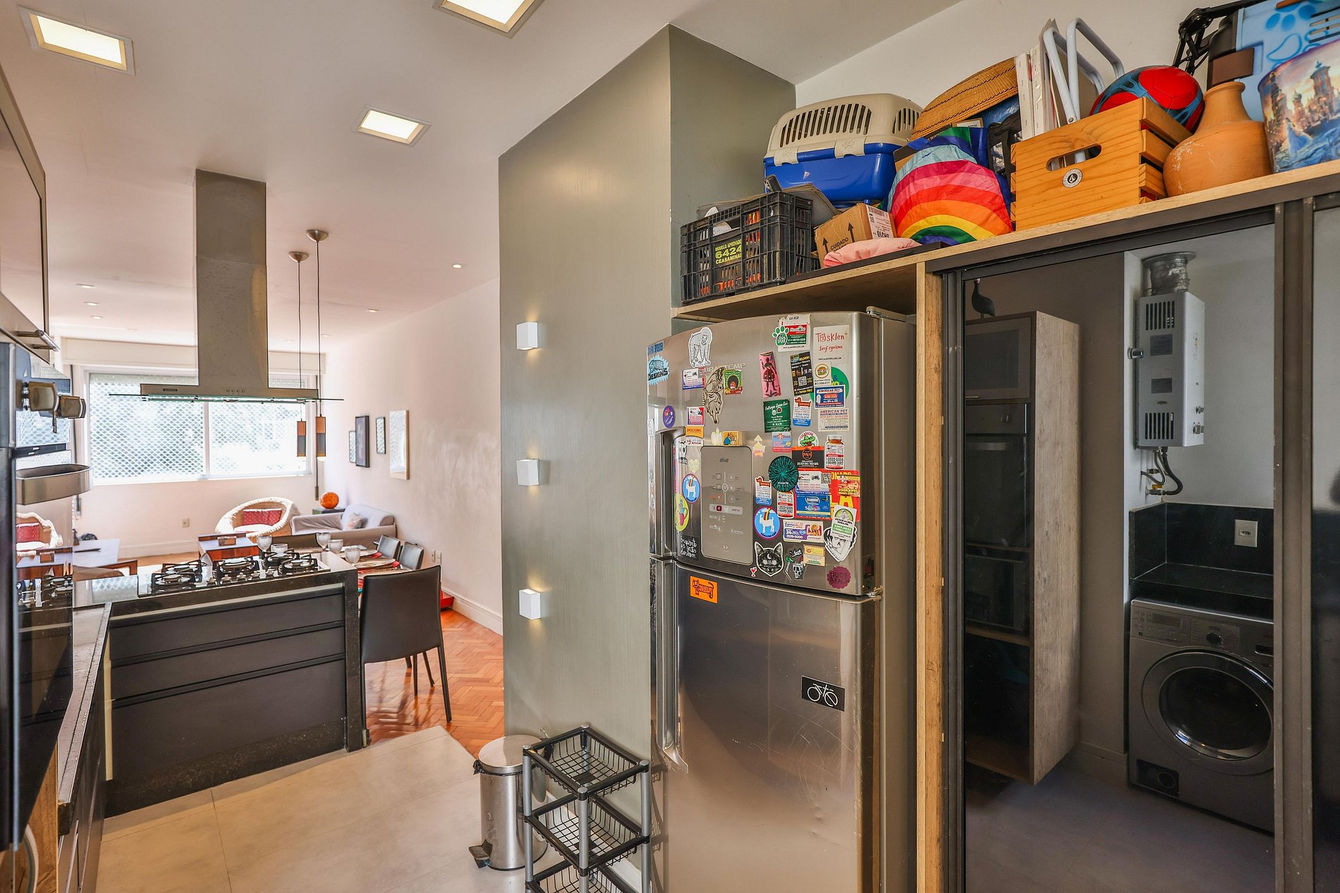 A mesa de jantar delimita bem a transição entre a sala e a cozinha, que é prática e funcional, com armários planejados, eletrodomésticos bem posicionados e todos os utensílios básicos para preparar e fazer suas refeições. Nos fundos, uma pequena área de serviço com máquina lava e seca e varal de chão está disponível para uso dos hóspedes.