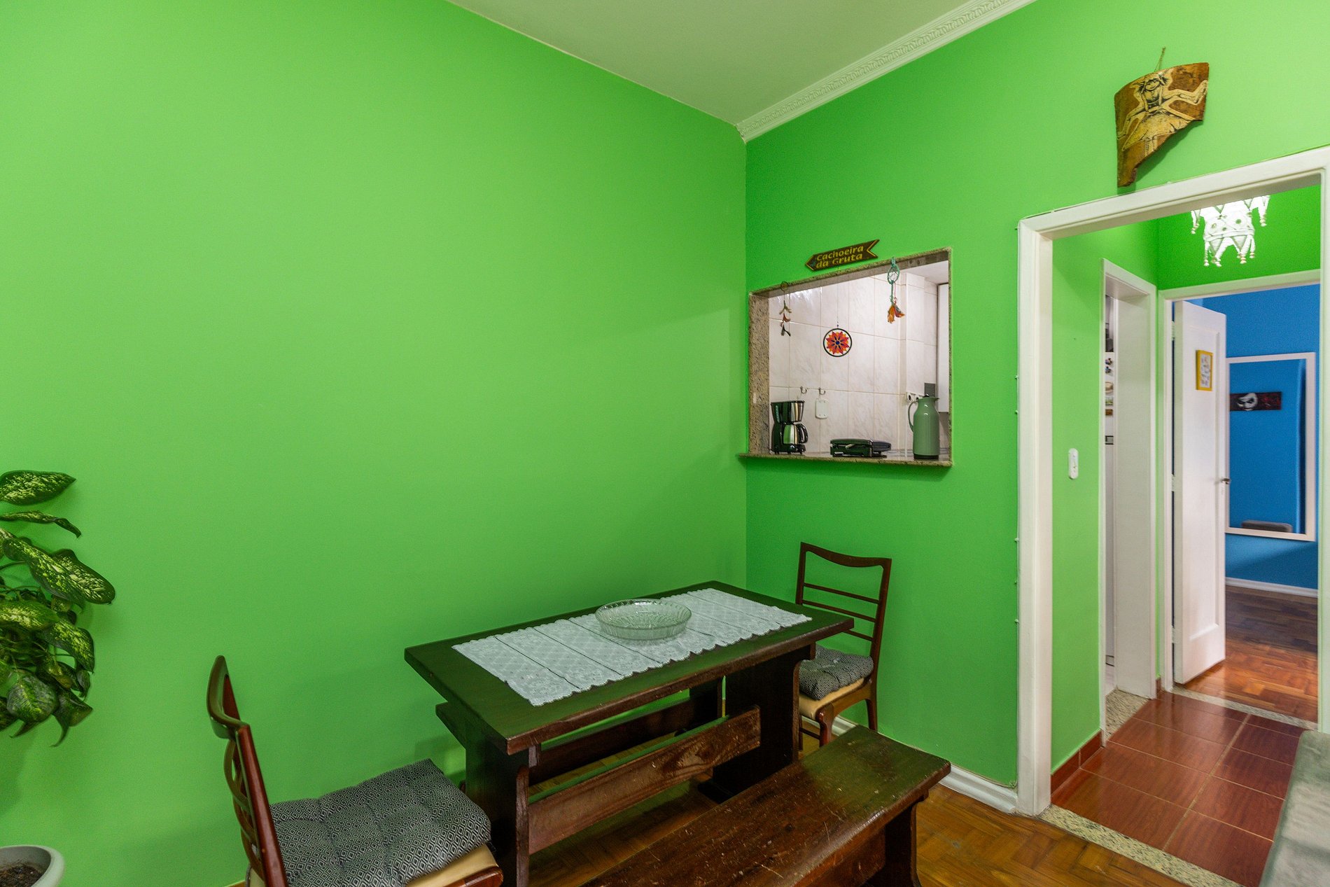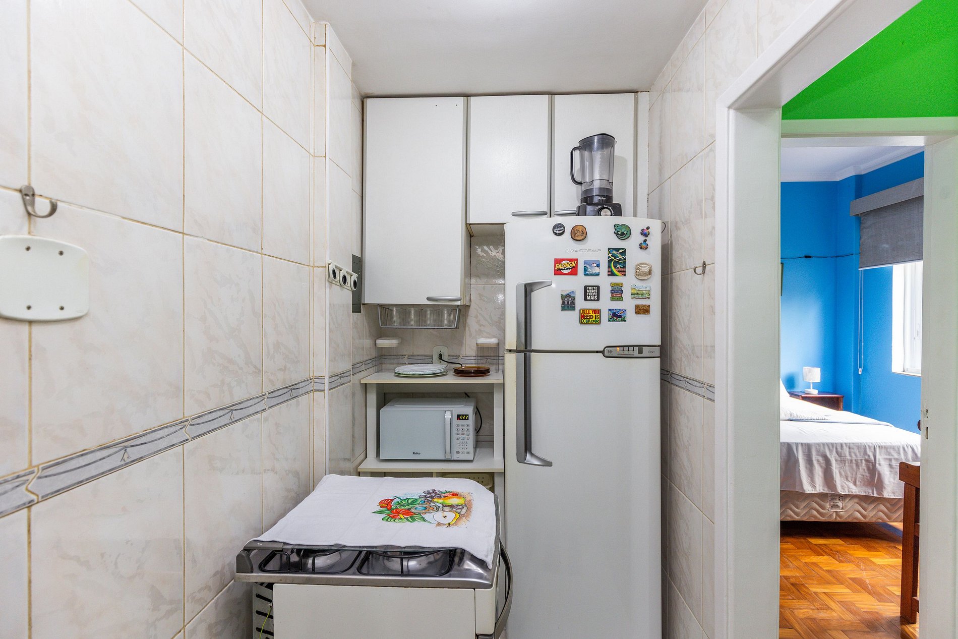 Localizado no quarto andar do Edifício Elvira, em uma parte tranquila e arborizada de Copacabana, este apartamento oferece uma estadia prática e acolhedora no coração do bairro. A sala integra estar e jantar em um ambiente bem ventilado, com TV a cabo, ventilador de teto e uma mesa para quatro pessoas, além de conexão com a cozinha no estilo americano. O quarto principal conta com cama de casal, ar-condicionado, ventilador de teto, escrivaninha para trabalho, cortina blackout e uma TV com Roku (acesso apenas a serviços de streaming). O segundo quarto é compacto e funcional, com cama de solteiro, mesa de cabeceira, ventilador de teto e blackout na janela. A cozinha é pequena, mas bem equipada, e o banheiro, além de completo, também abriga máquina de lavar e tanque, fazendo as vezes de área de serviço. O prédio é extremamente bem localizado, a poucos passos da praia e rodeado por comércio, transporte e serviços, mas mantém uma atmosfera calma graças à sua posição nos fundos do terreno e à ampla área verde interna.